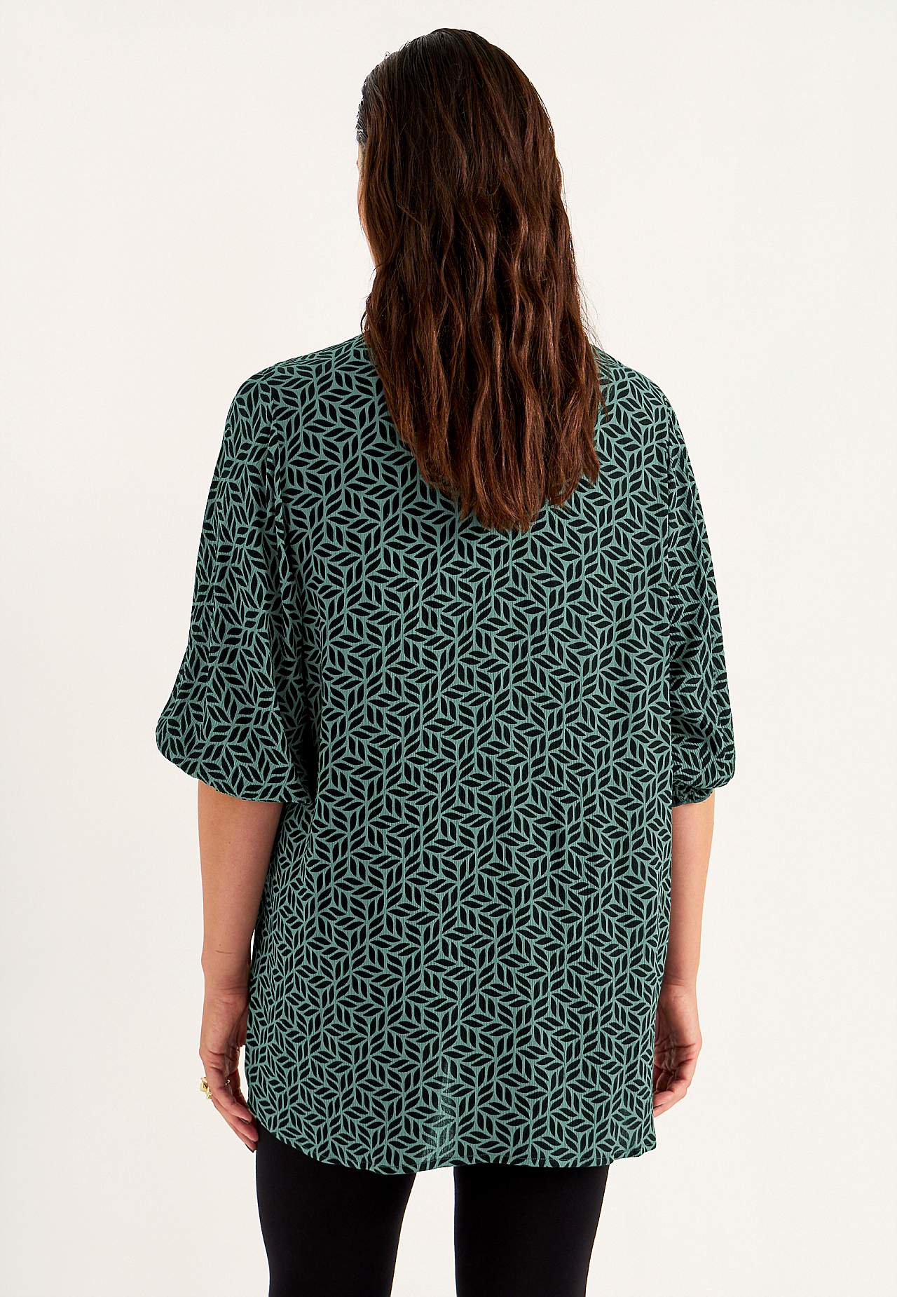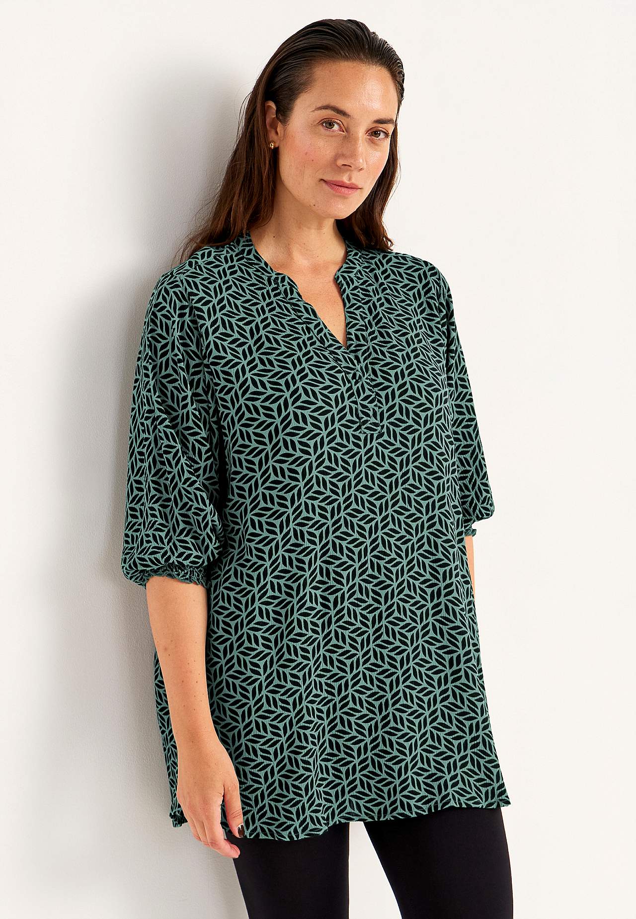 Vævet, kreppet tunika. Rummelig pasform. 3/4 lange ærmer med smock på ærmeafslutningerne. Længden følger størrelsen, ca. 78-88 cm fra skulderen.
