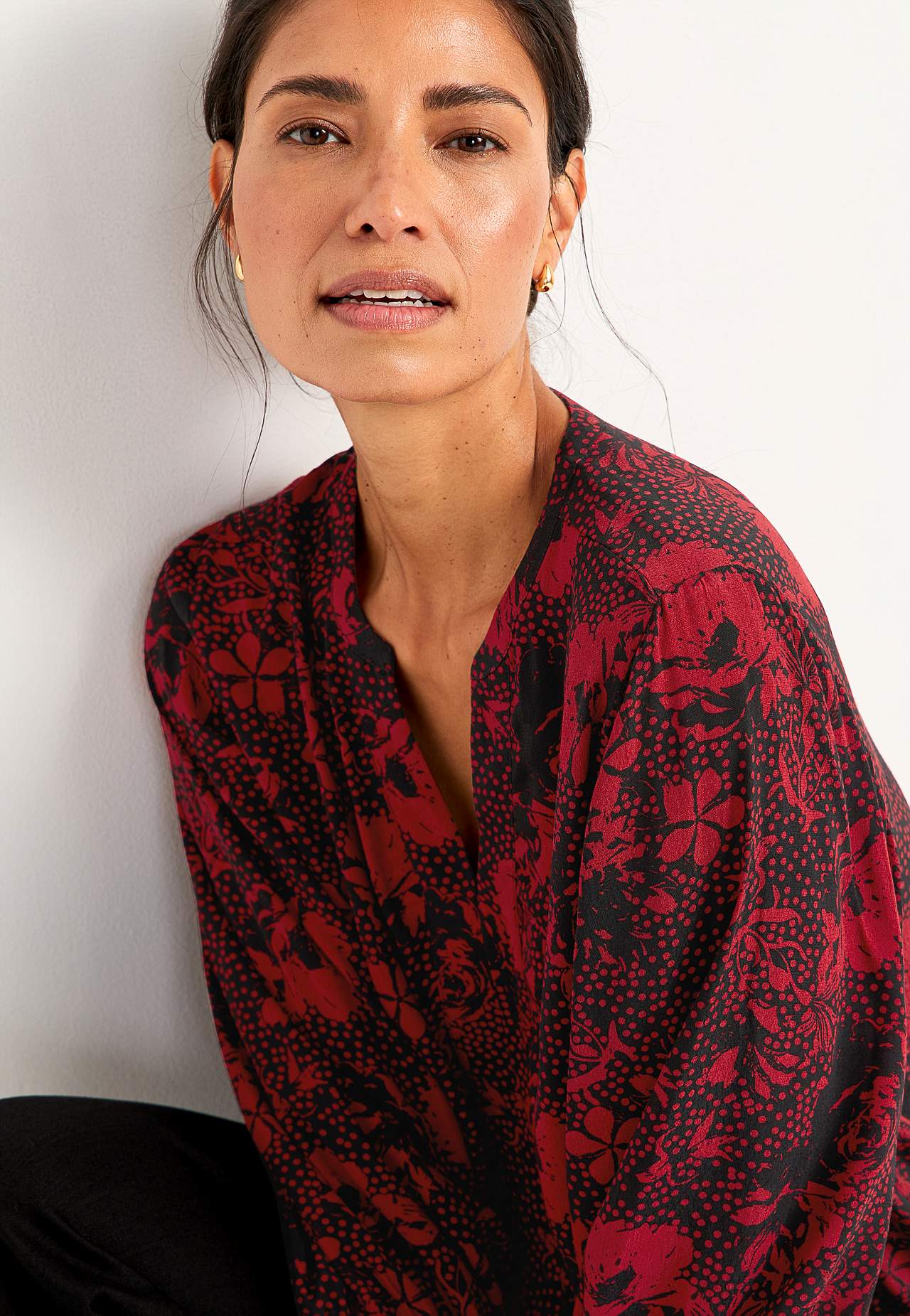 Vævet bluse i jævn, blød kvalitet. Normal pasform. Lidt a-linjeformet model. V-udskåret halsudskæring. Afrundet søm. Længden følger størrelsen, ca. 61-79 cm fra skulderen.