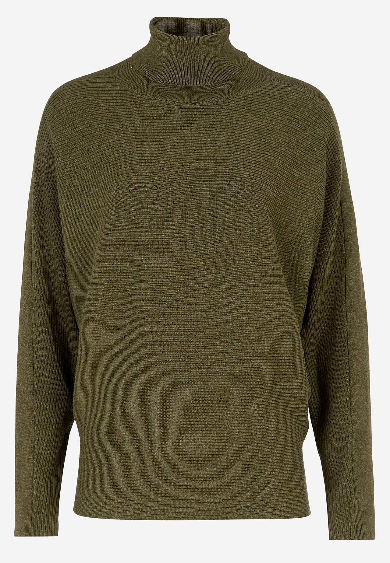 Trøje med horisontal ribstrik. Normal pasform. Blødt materiale med let glans. Foldbar polokrave. Hyggeligt pingvinærme. Lige søm. Længde fra skulder ca. 63 cm i størrelse S (38).