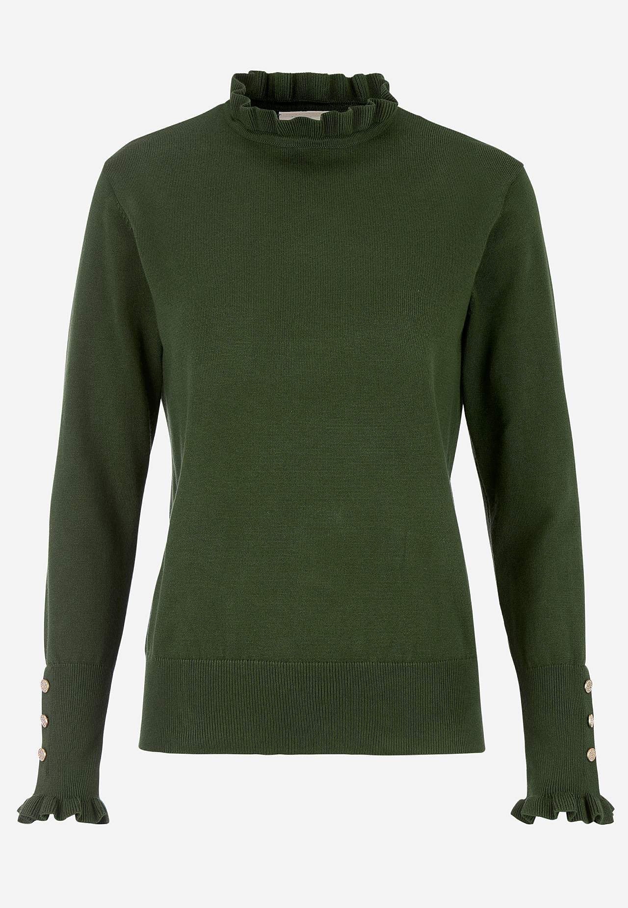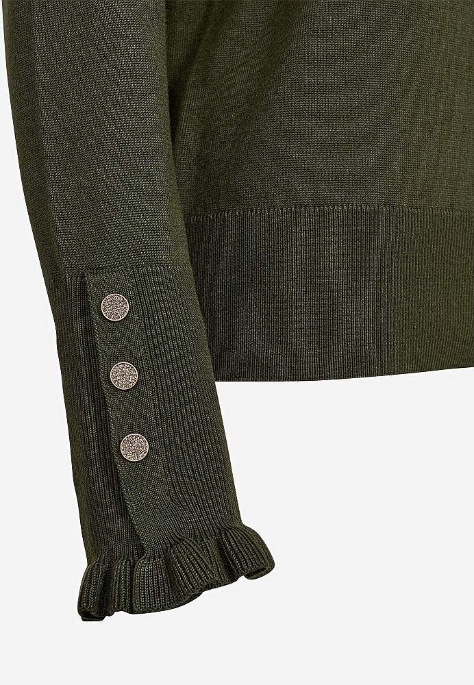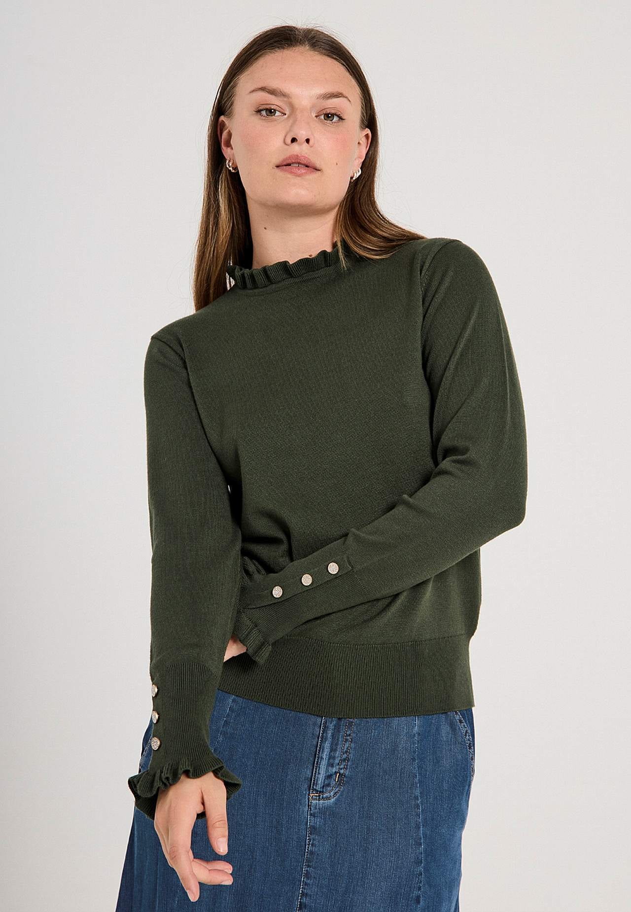 Langærmet trøje med en nydelig silhuet. Ekstrabrede ærmer med dekorative knapper for et touch af elegance. Passer lige så vel til daglig brug og til festlige lejligheder. Blød fintstrikket trøje med let glans. Smal pasform. Rund hals med bølget kant. Langt ærme med tre dekorative knapper ved manchetterne og bølget kant. Rib... Læs mere