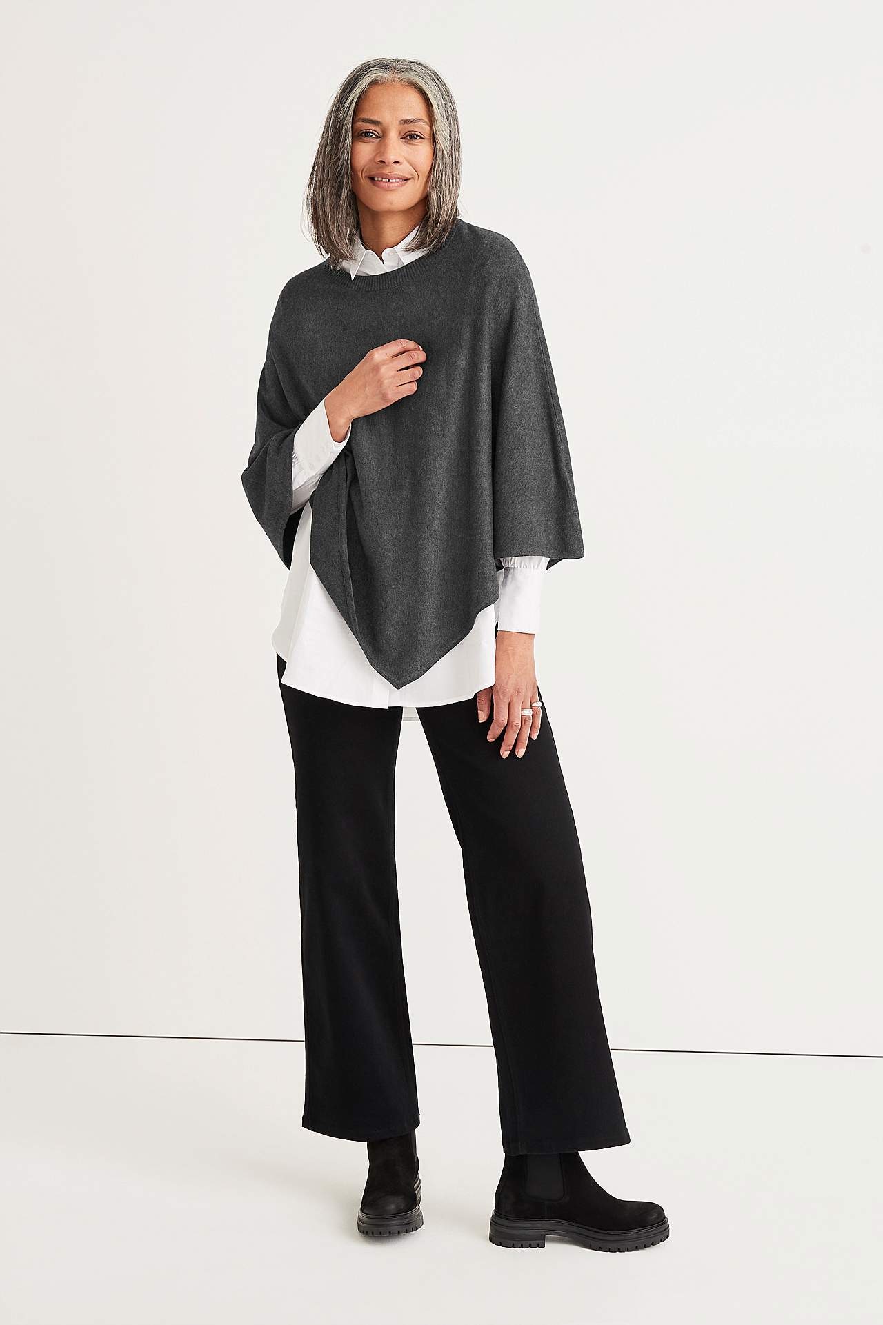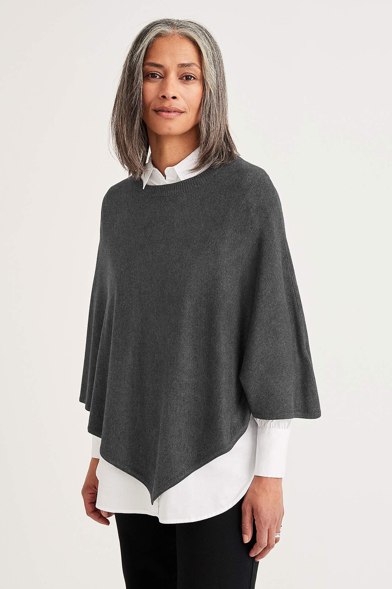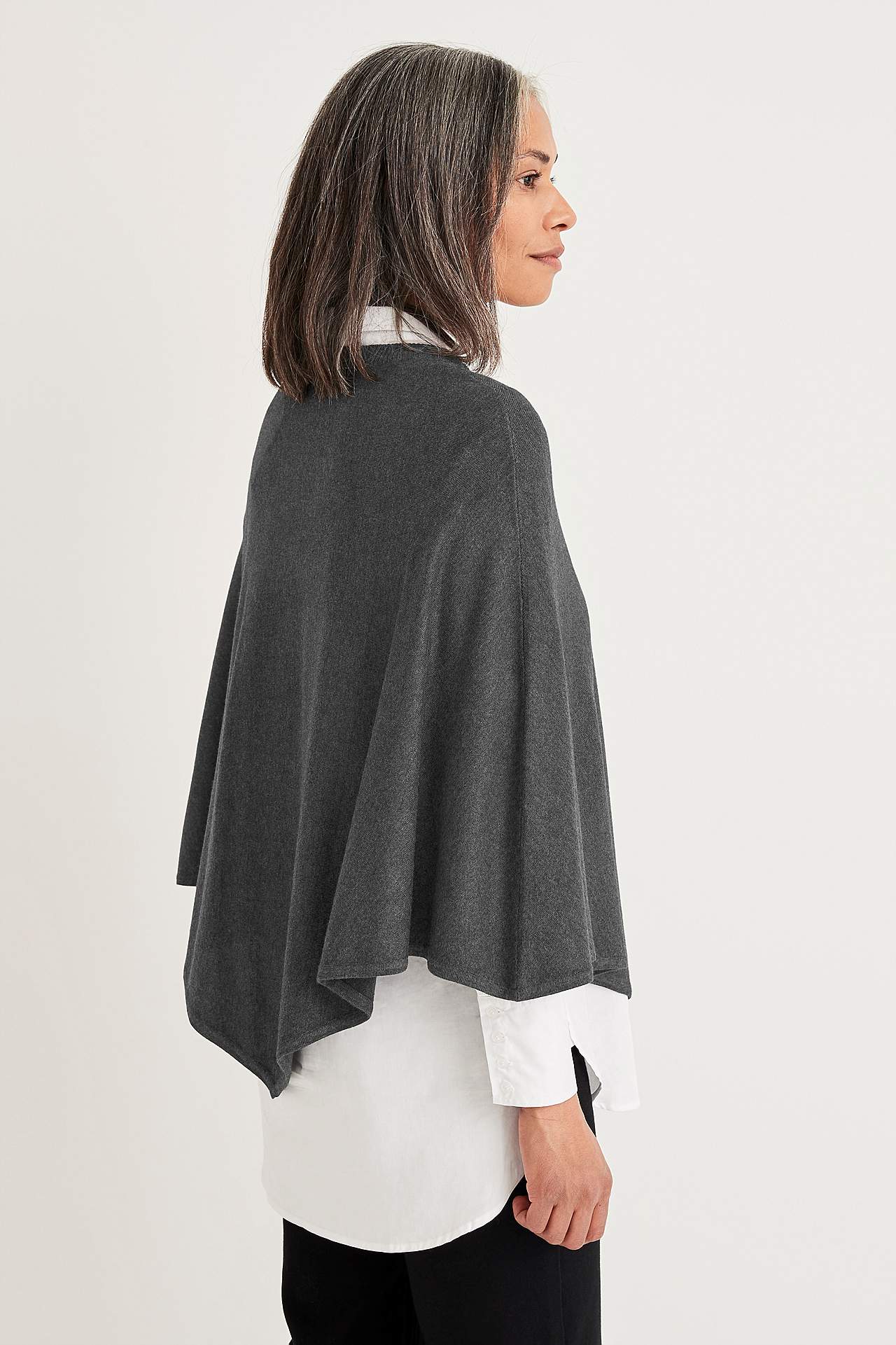Fintstrikket poncho med afrundet, ribbet halsudskæring. Længde midt bagpå ca. 72 cm i str. 36/44.