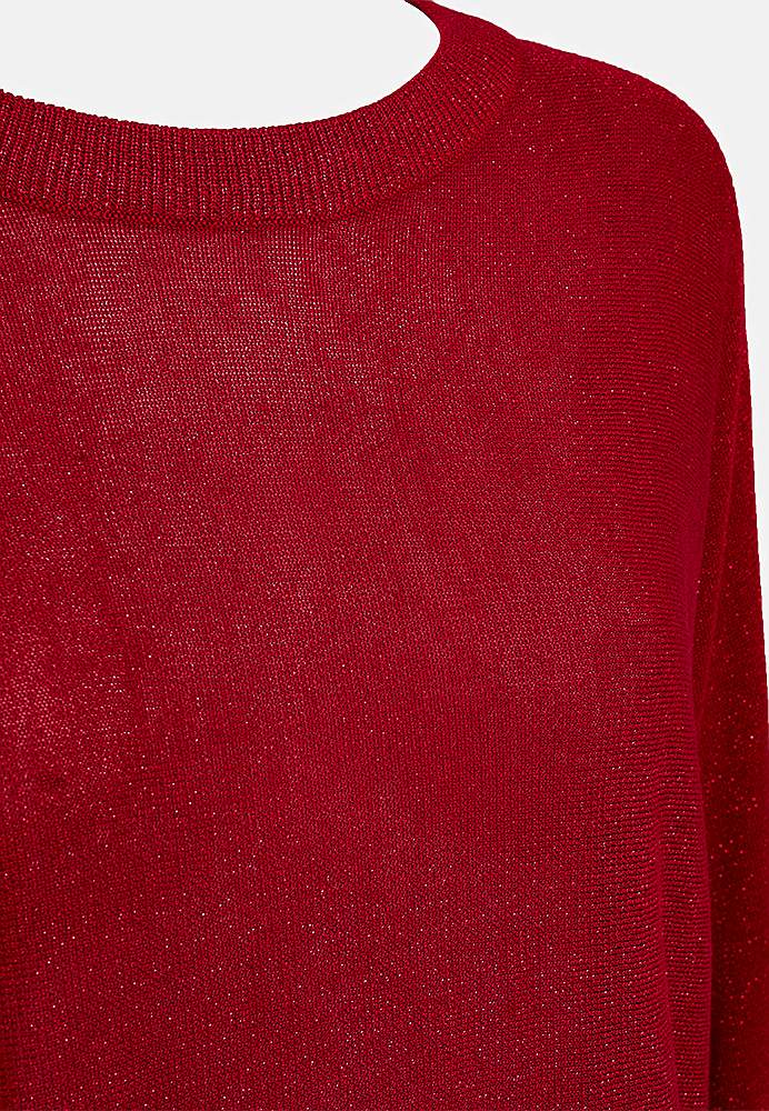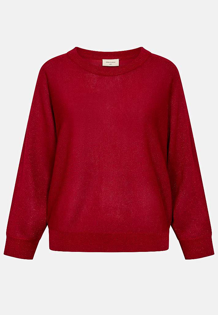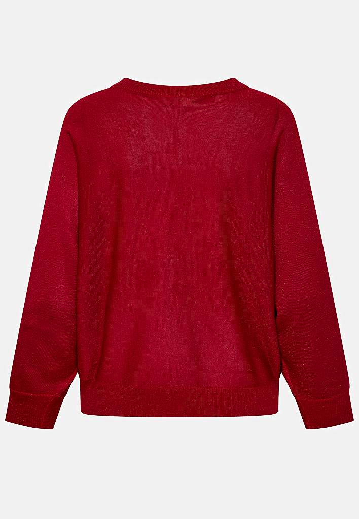 Festlig, fintstrikket, lidt tyndere trøje. Diskrete glimmertråde i den samme nuance. Løs pasform. Rund halsudskæring. 3/4 lange pingvinærmer med ribmanchet på ærmeafslutningerne. Lige søm med ribmanchet. Længde fra skulder ca. 58 cm i størrelse S (38).