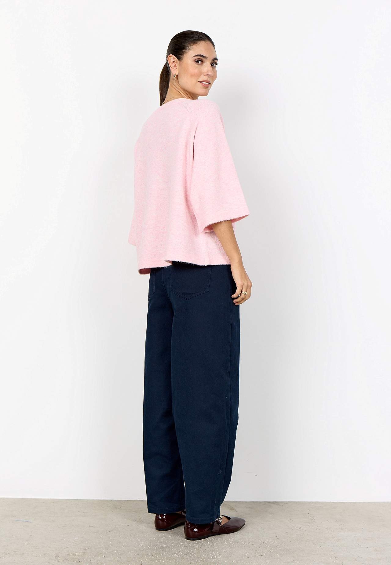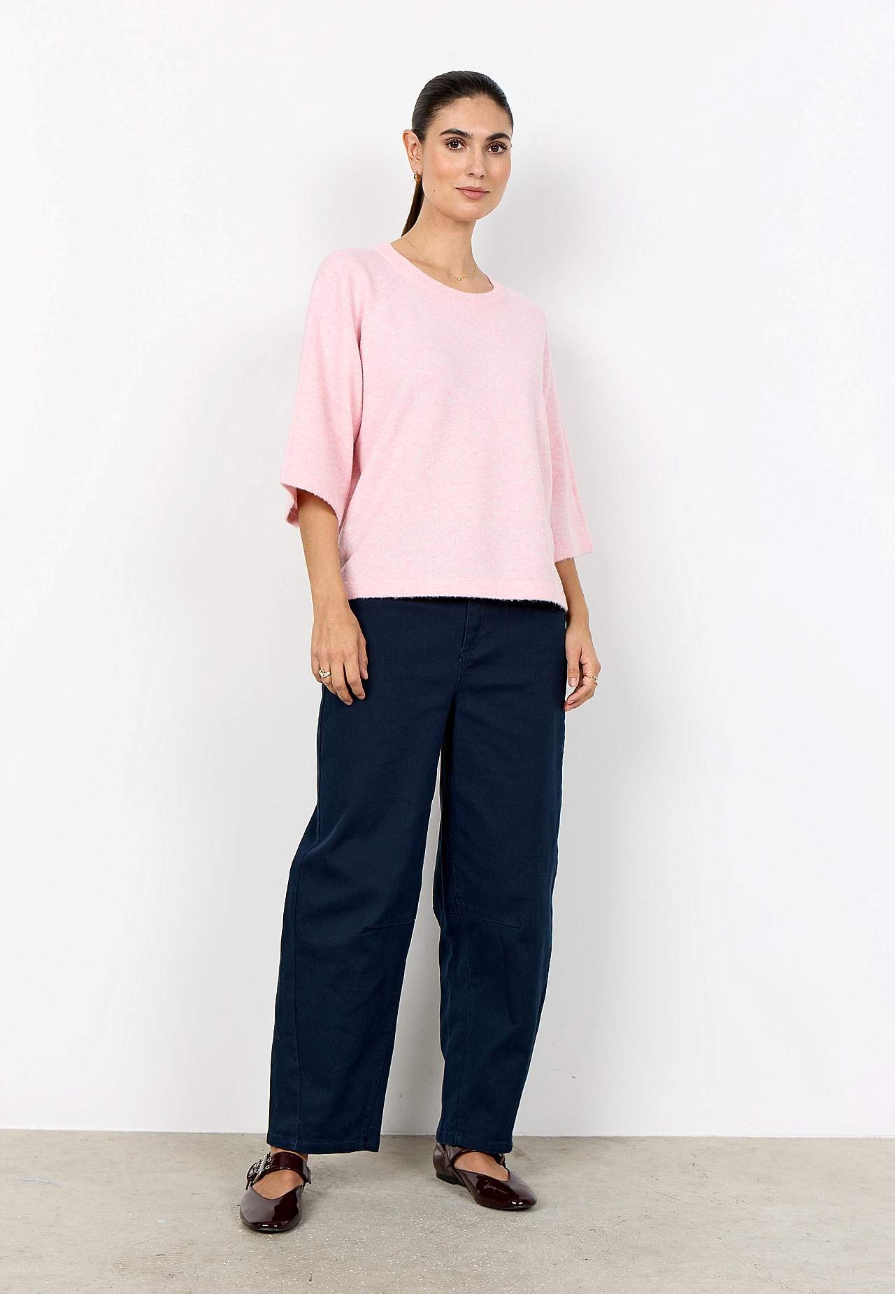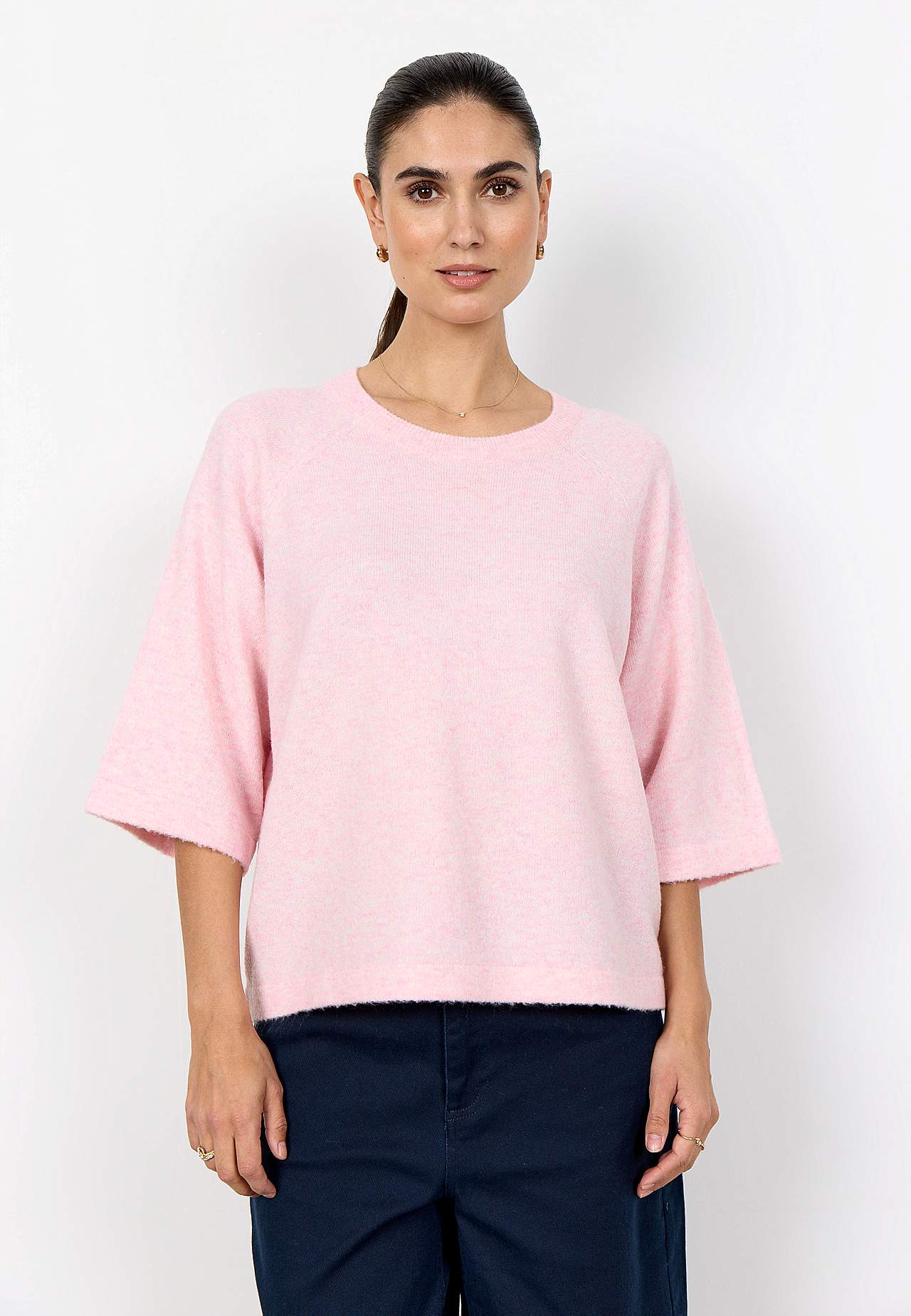 Strikket, luftig trøje i meleret garn. Blødt, elastisk materiale. Lige, afslappet pasform. Afrundet, ribstrikket halsudskæring. Halvlange, brede raglanærmer. Lige søm. Længde fra skulder ca. 58 cm i størrelse S (38).