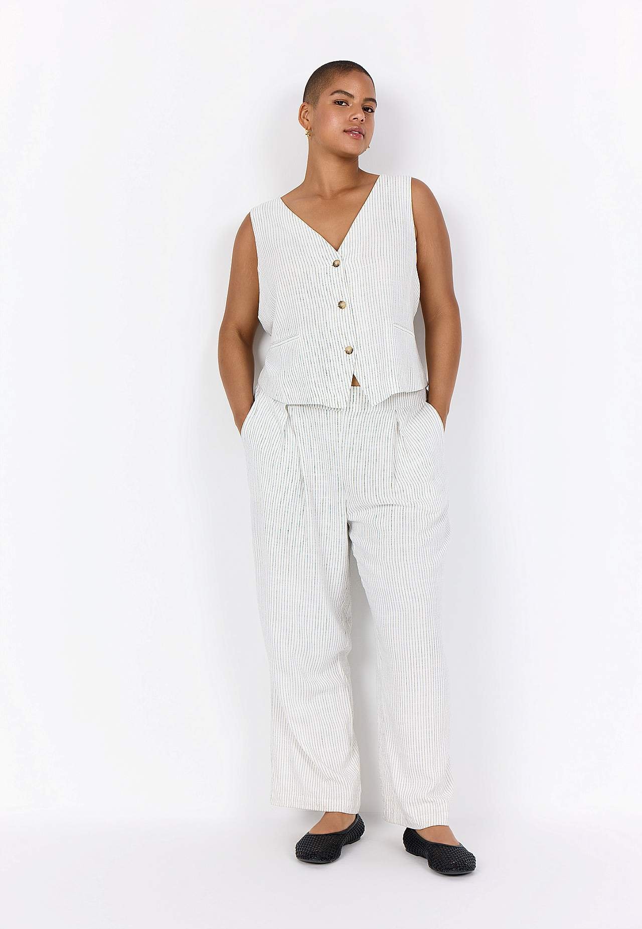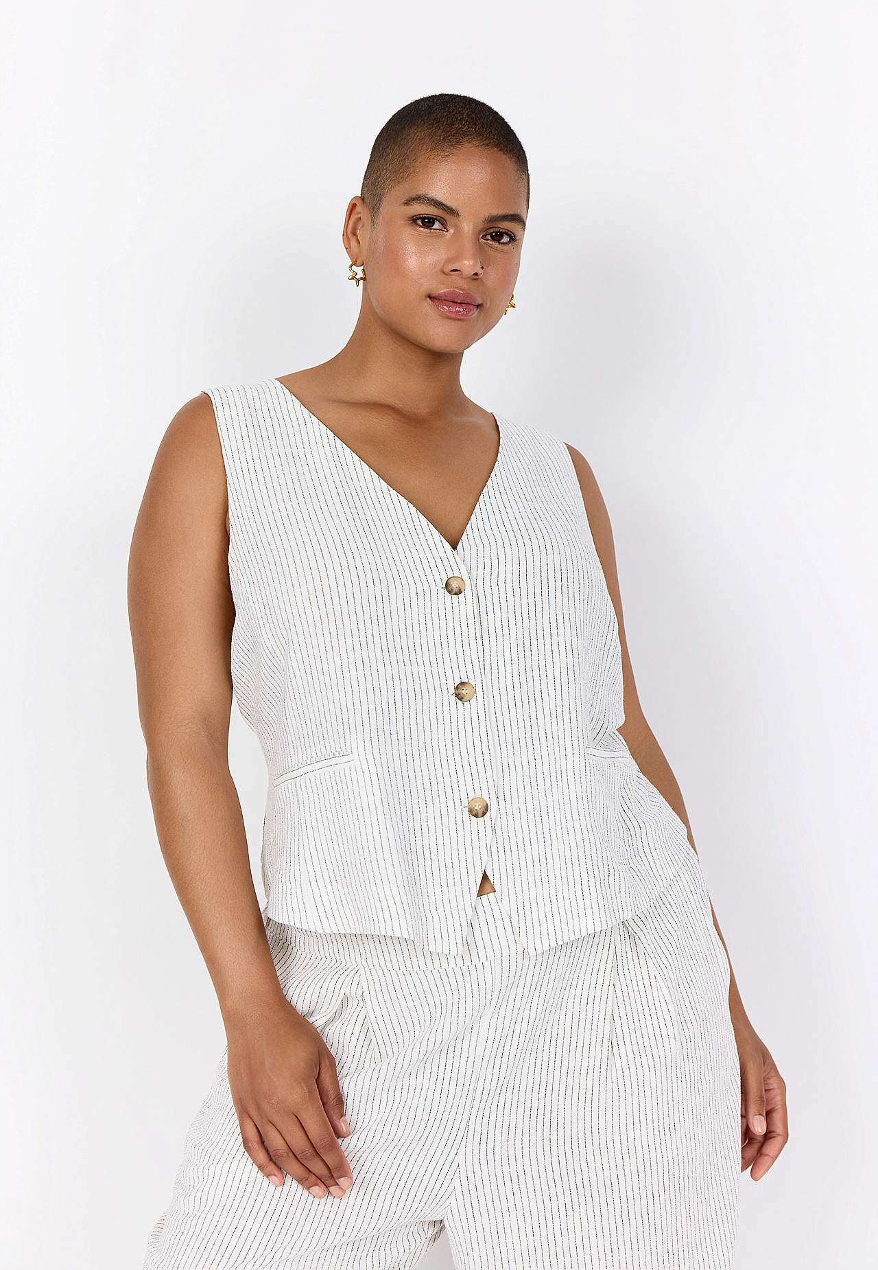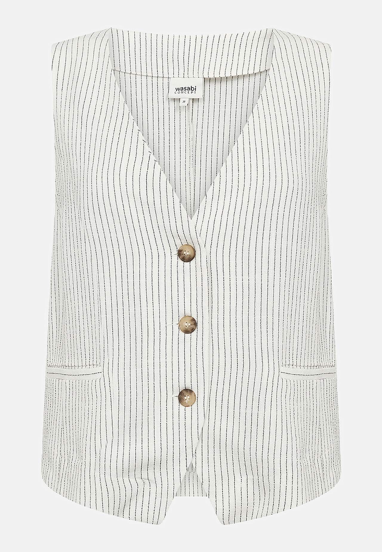 Garnfarvet, stribet vest i fleksibel, blød viskose- og linnedblanding. Uformel pasform. V-udskæring. Knaplukning. Figursømme ved fronten. Små lommer. Justerbar lukning i ryggen med spænde. Længde fra skulder ca. 58 cm i størrelse 42.