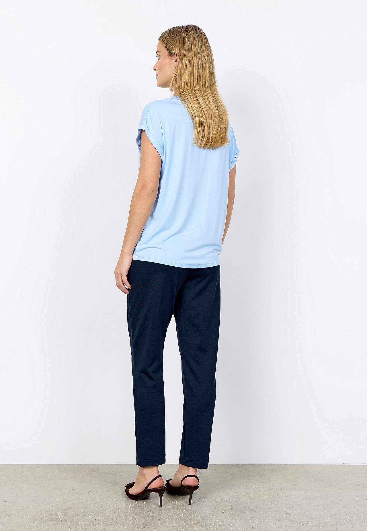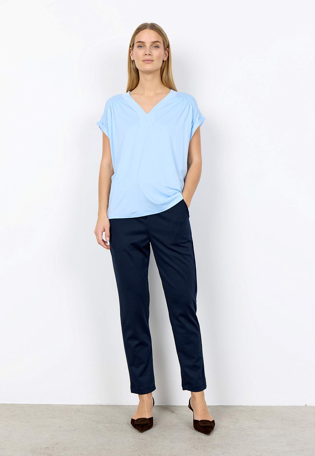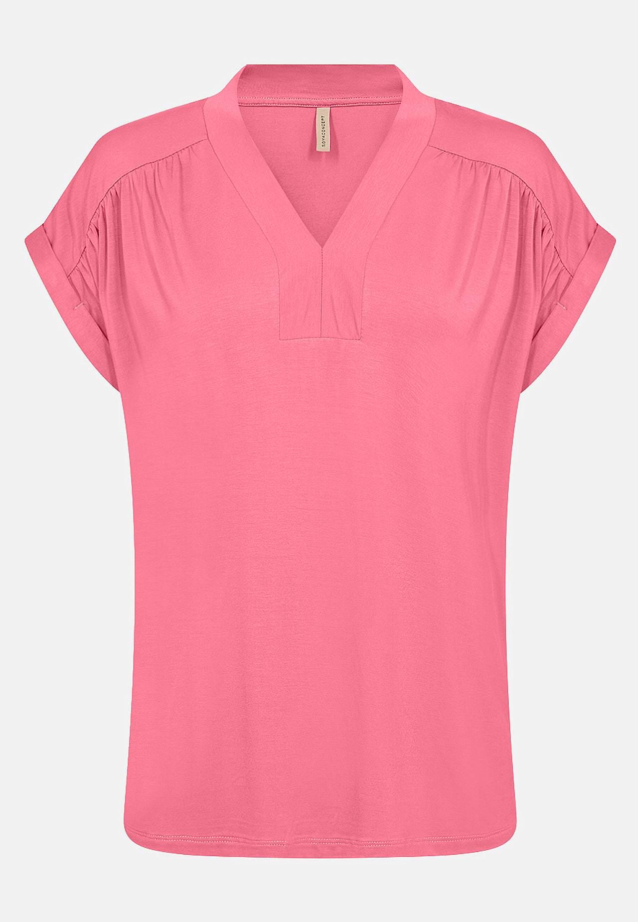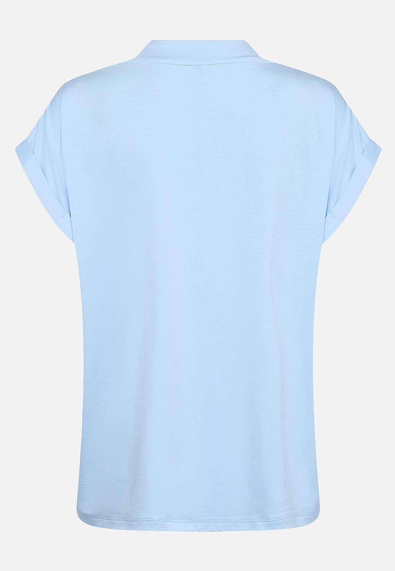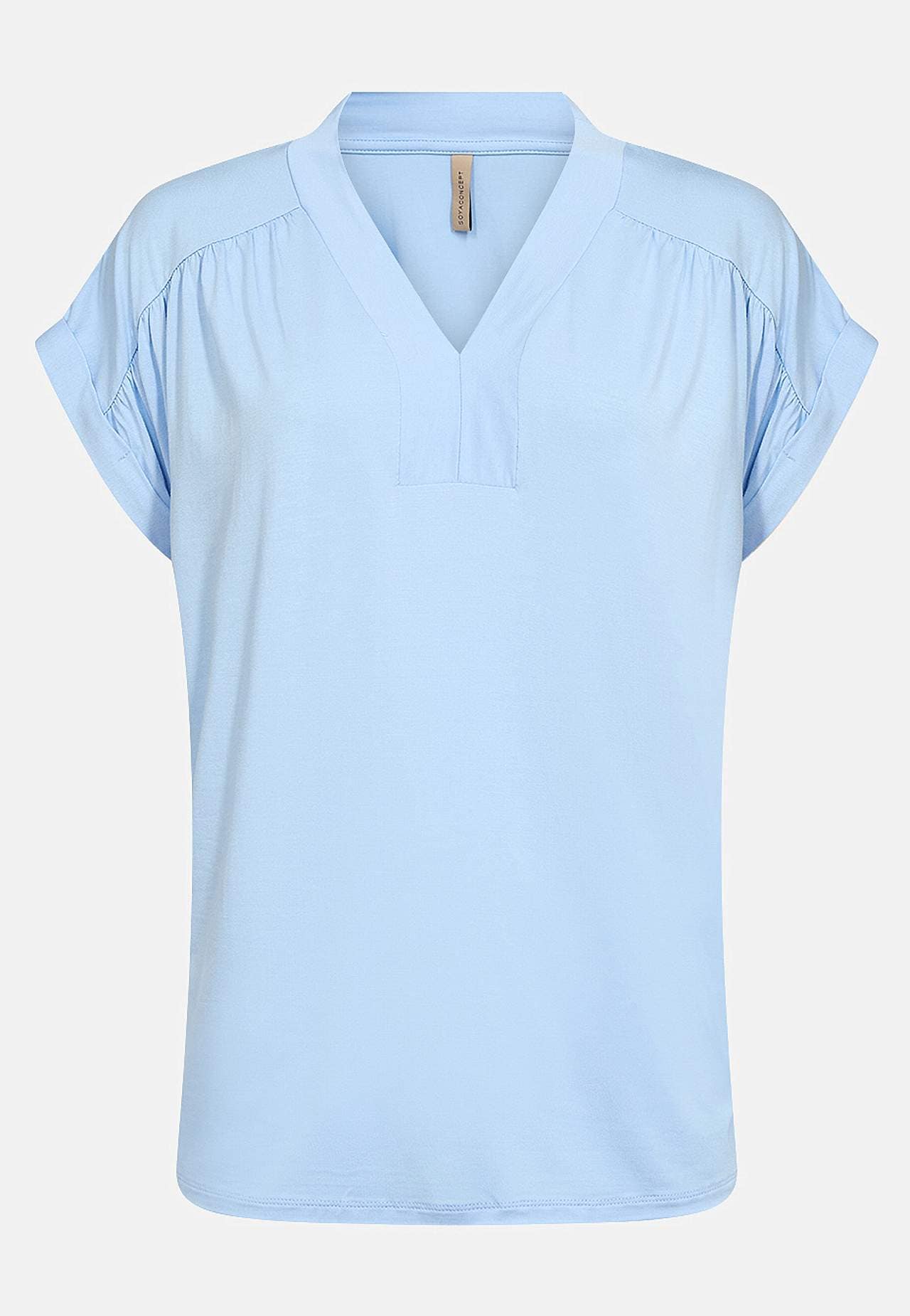 Ensfarvet, superblød jerseytop i lyocell. Normal pasform. V-udskåret halsudskæring. Rynkedetalje på skuldrene. Foldede vingeærmer. Lige søm. Længde fra skulder ca. 62 cm i størrelse S(38).