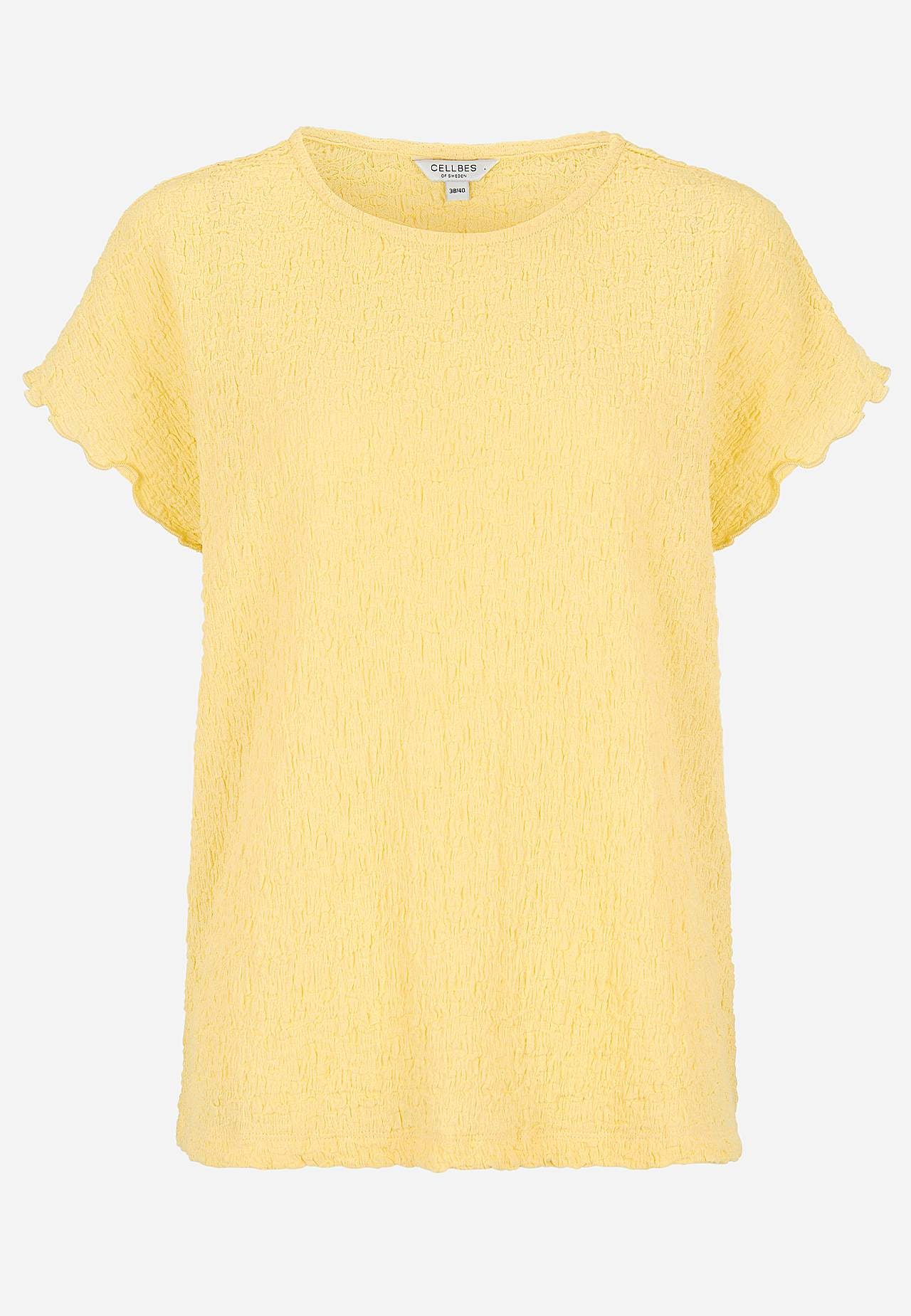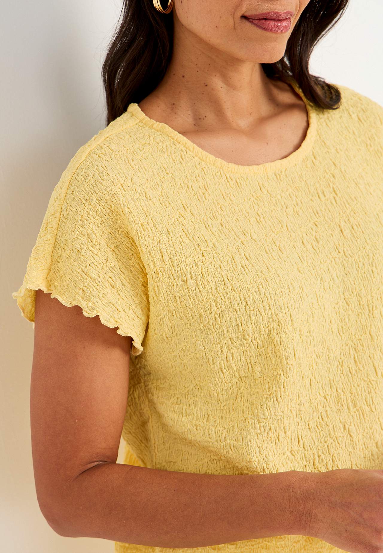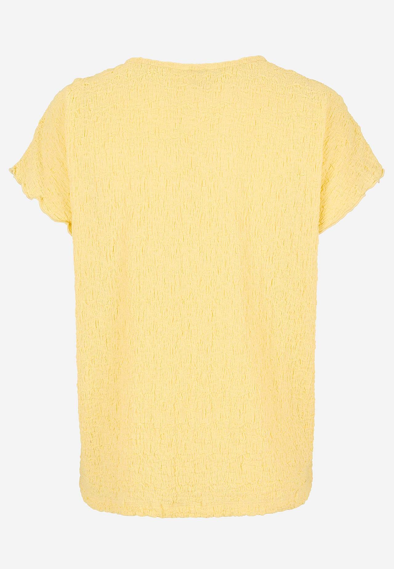 Top i komfortabel, elastisk bomuldsblanding med struktur. Normal pasform. Rund halsudskæring. Korte korte ærmer med bølgede, overlockede ærmeafslutninger. Lige søm. Ryglængden følger størrelsen, ca. 62-73 cm.