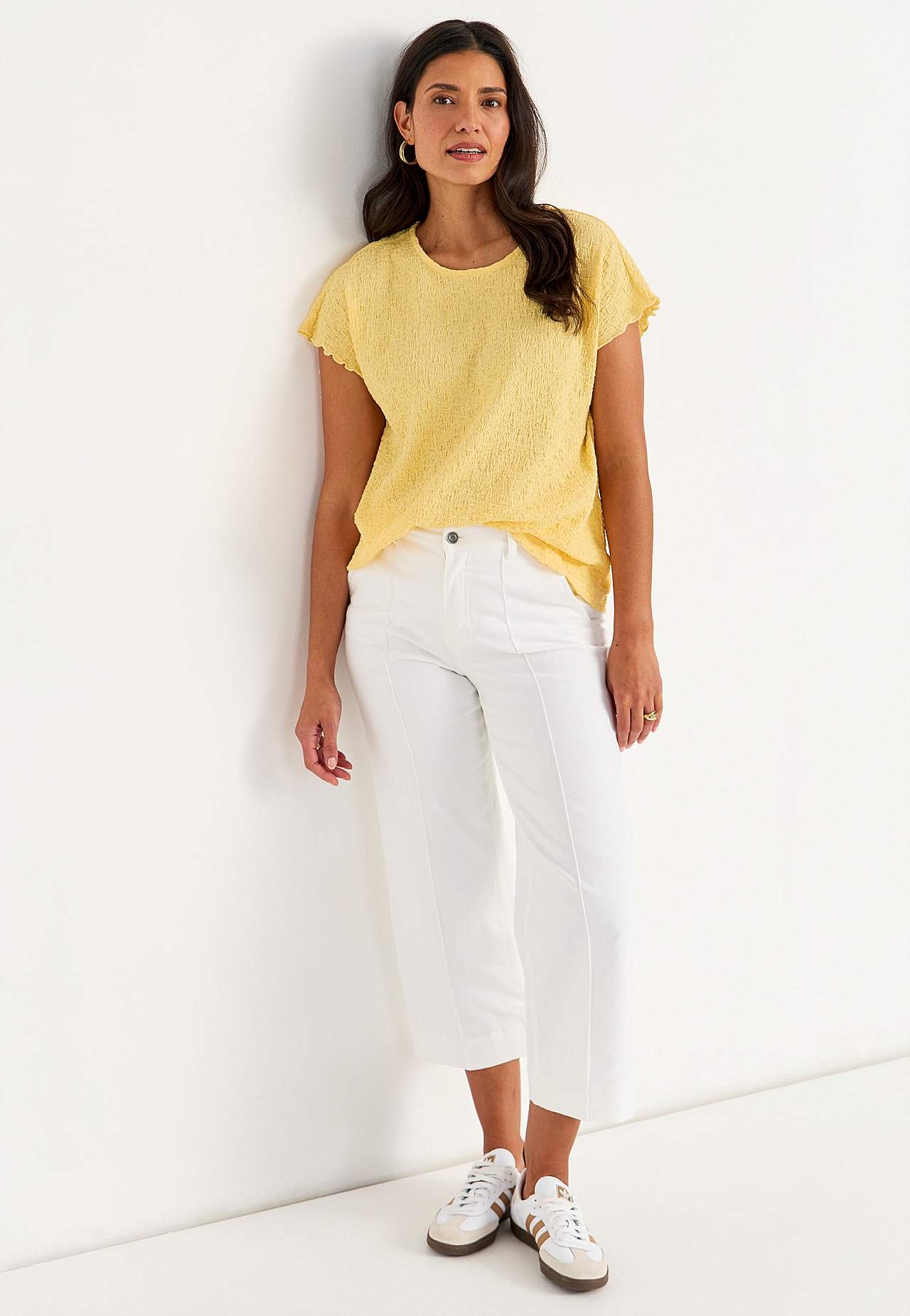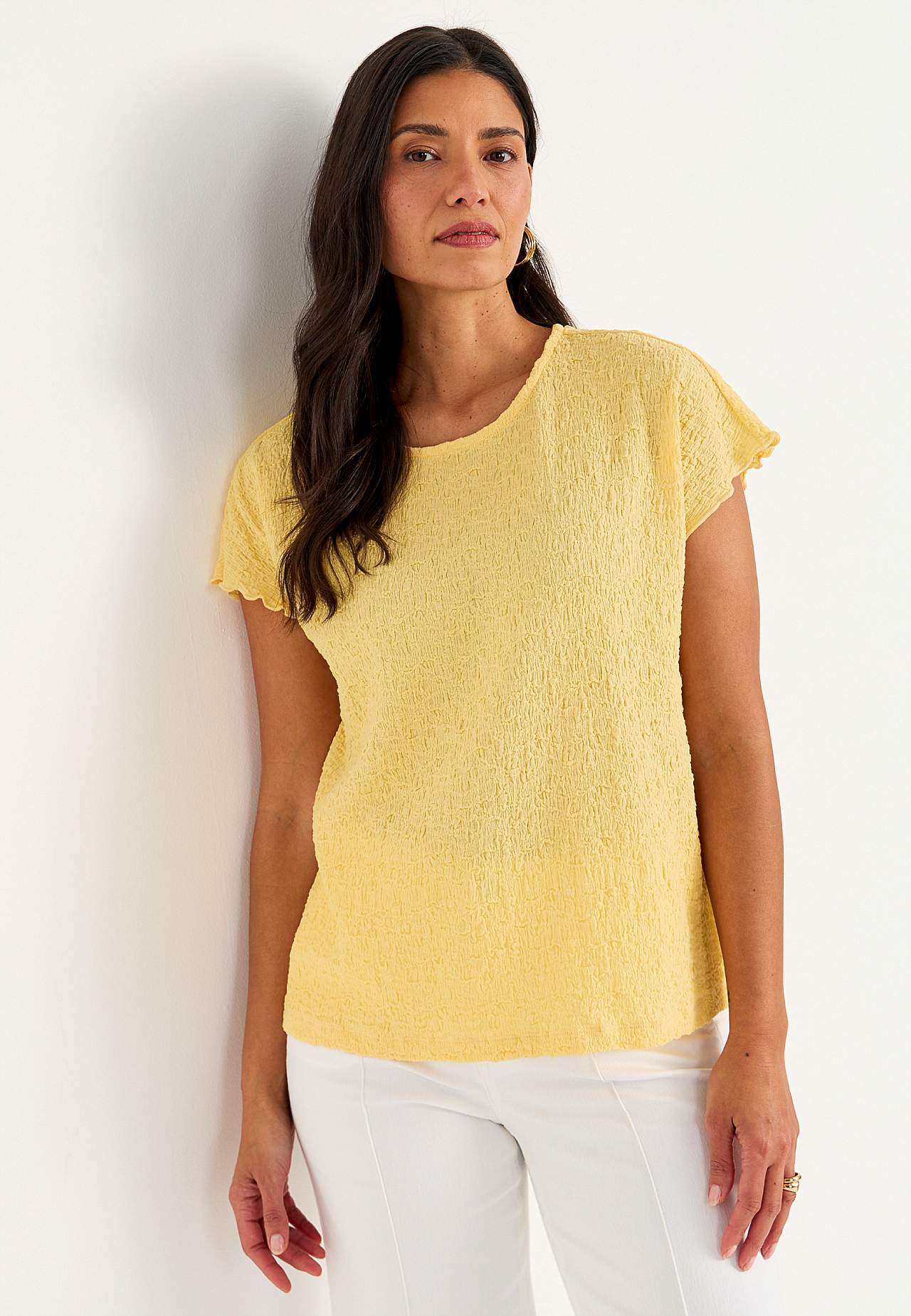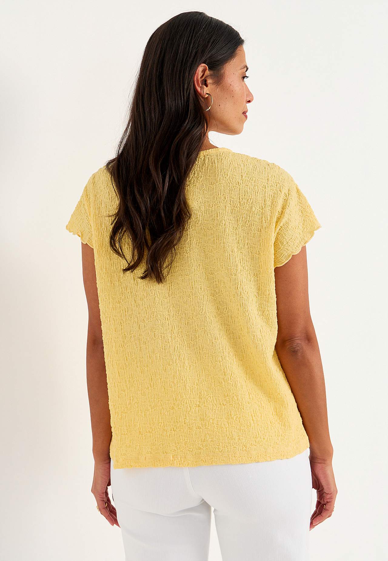 Top i komfortabel, elastisk bomuldsblanding med struktur. Normal pasform. Rund halsudskæring. Korte korte ærmer med bølgede, overlockede ærmeafslutninger. Lige søm. Ryglængden følger størrelsen, ca. 62-73 cm.