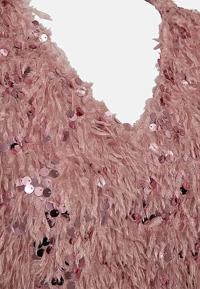 Luksus, elastisk festtop. Superblødt, luftigt materiale med fjerlignende tekstur og pailleter. Uformel pasform. V-udskæring. Brede trekvartærmer. Lige søm med elastisk søm. Perfekt til alle festlige anledninger. Længde fra skulder ca. 59 cm i størrelse S (38).