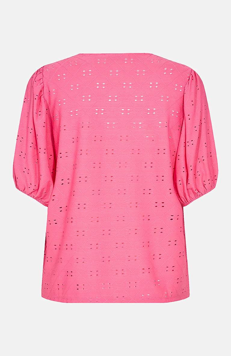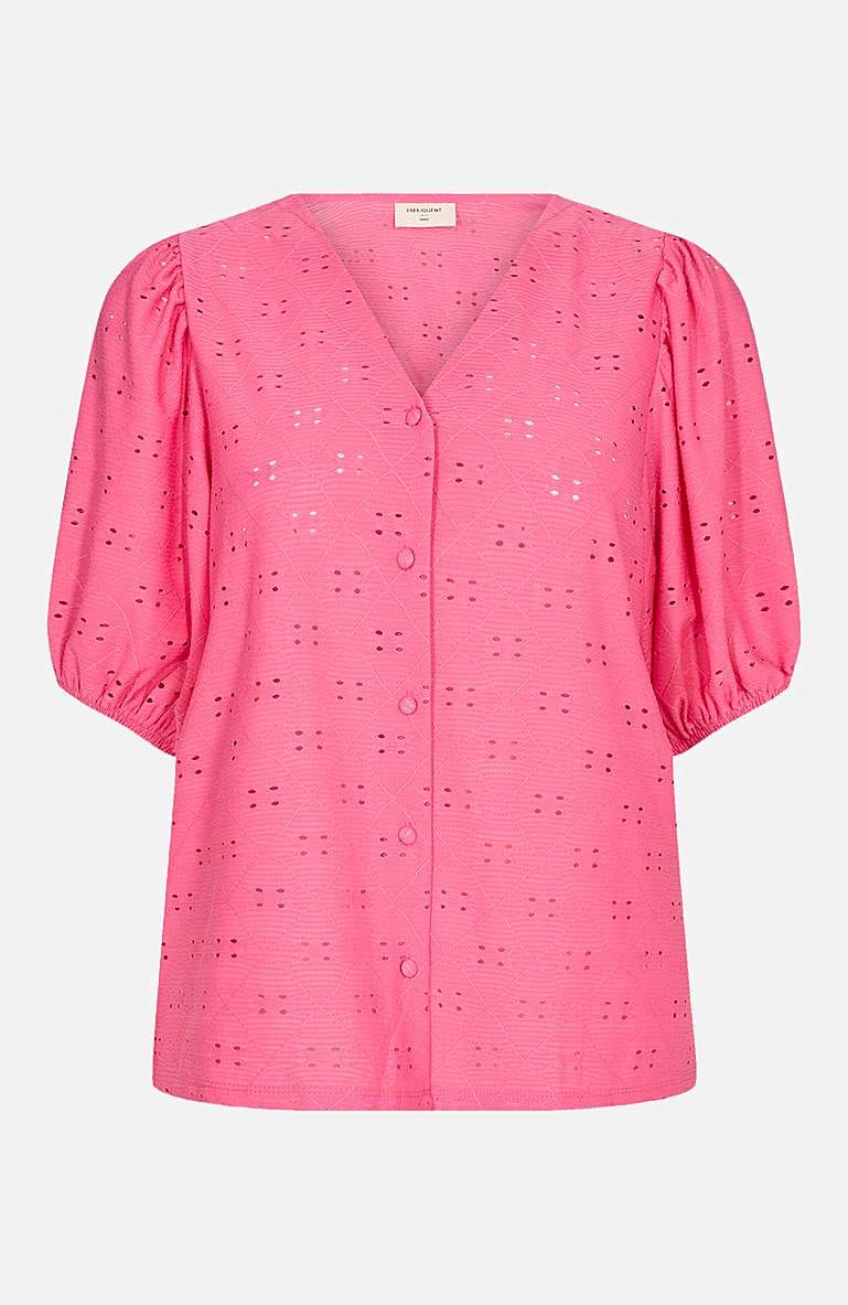 Jerseytop fra Freequent. Femy jerseytoppen. Blød, komfortabel jerseykvalitet med smukke hulbroderier. Gennemknappet model med v-udskæring. Korte ærmer med let pufærmer og elastisk ærmeafslutning. Længde fra skulder ca. 60 cm i størrelse S (38).