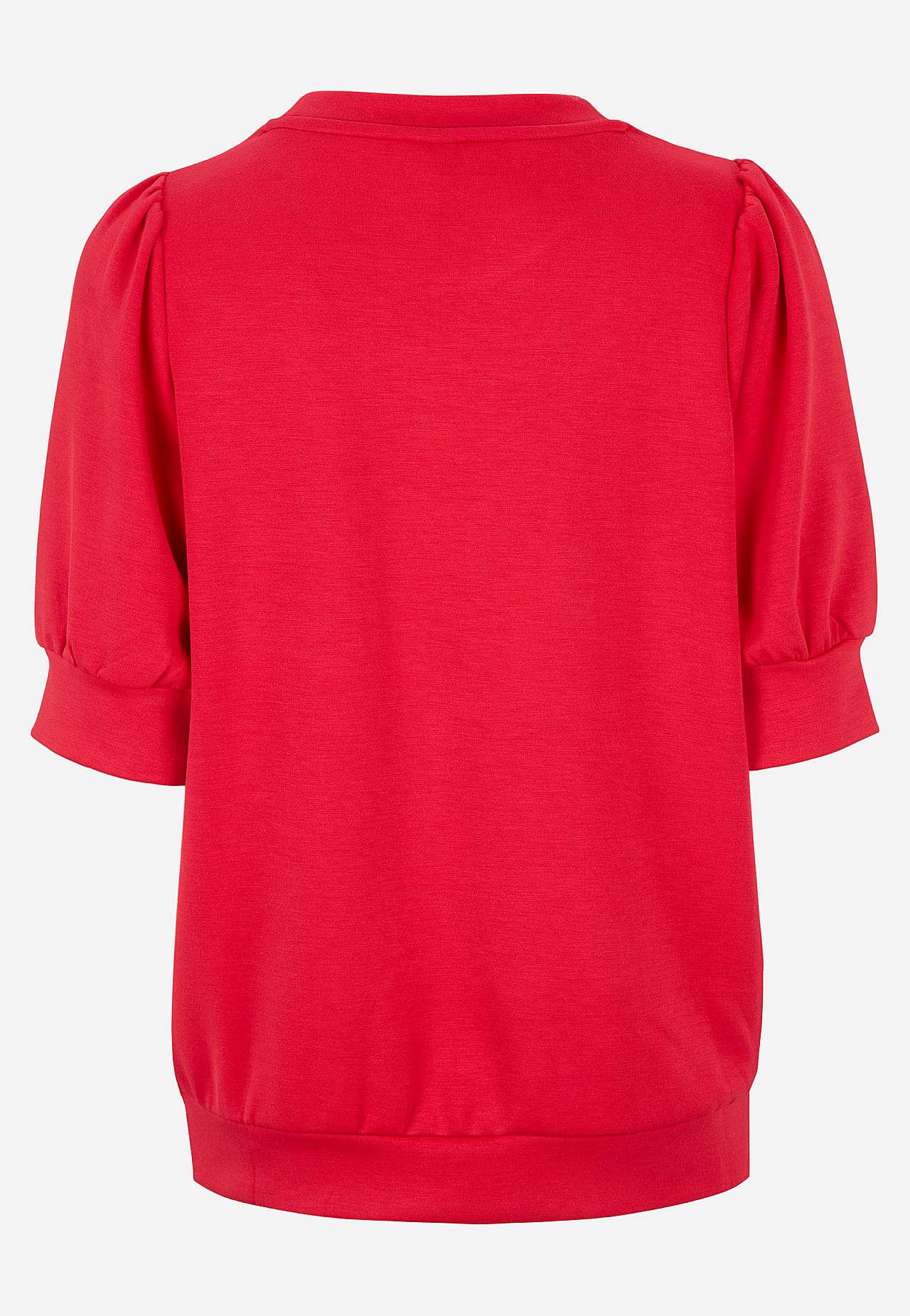 Trøje i silkeblød, lidt kraftigere jersey. Rund hals. Samling på skuldrene. Korte ærmer med ribkant og samling ved manchetterne. Lige søm med ribkant. Længde ca. 65 cm i størrelse S (38).