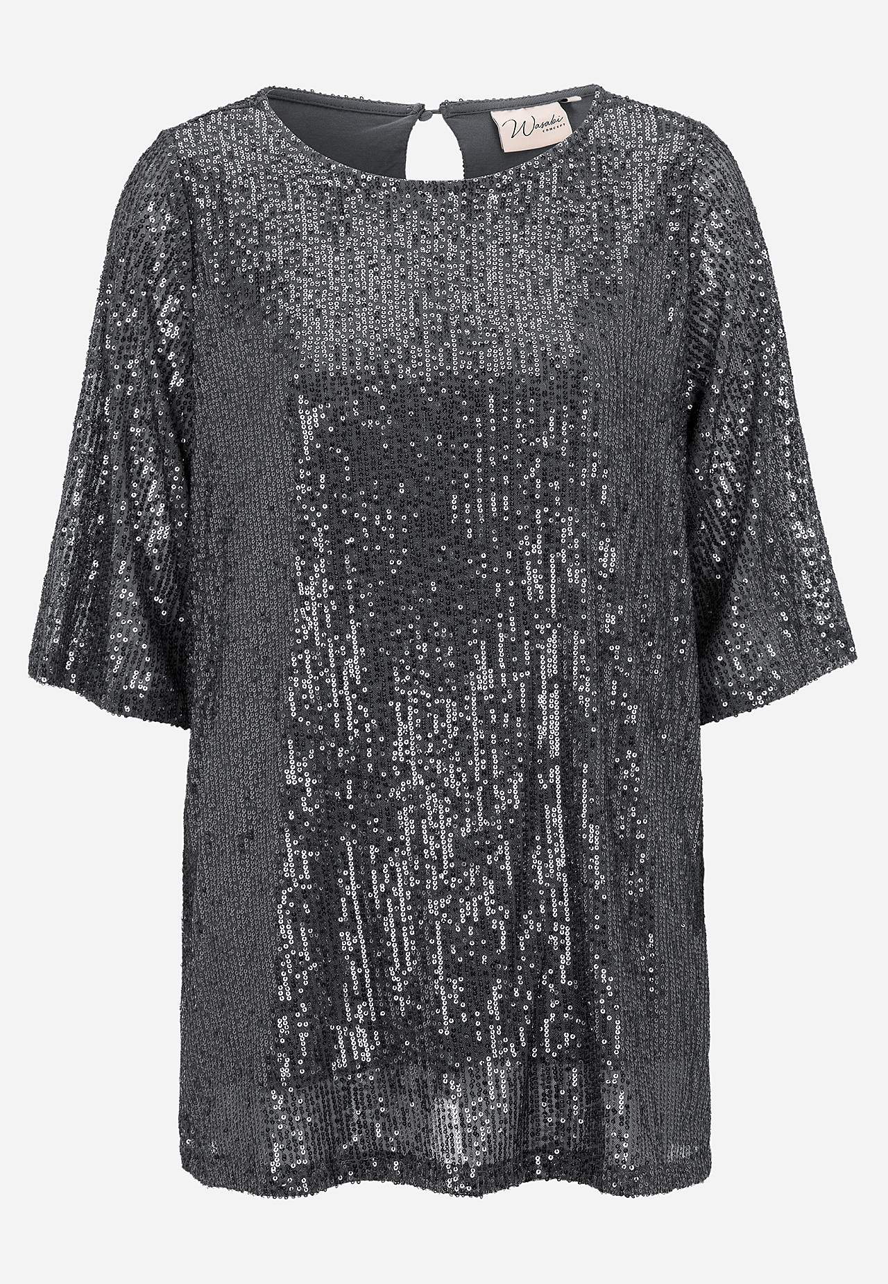 Festtop med meshstof og små pailleter. Lige pasform. Rund hals med slids bag i nakken og knap. Slouchy, fleksibelt for i jersey. Uforede, korte ærmer. Lige søm. Længde fra skulder ca. 76 cm i størrelse 42/44 (S).