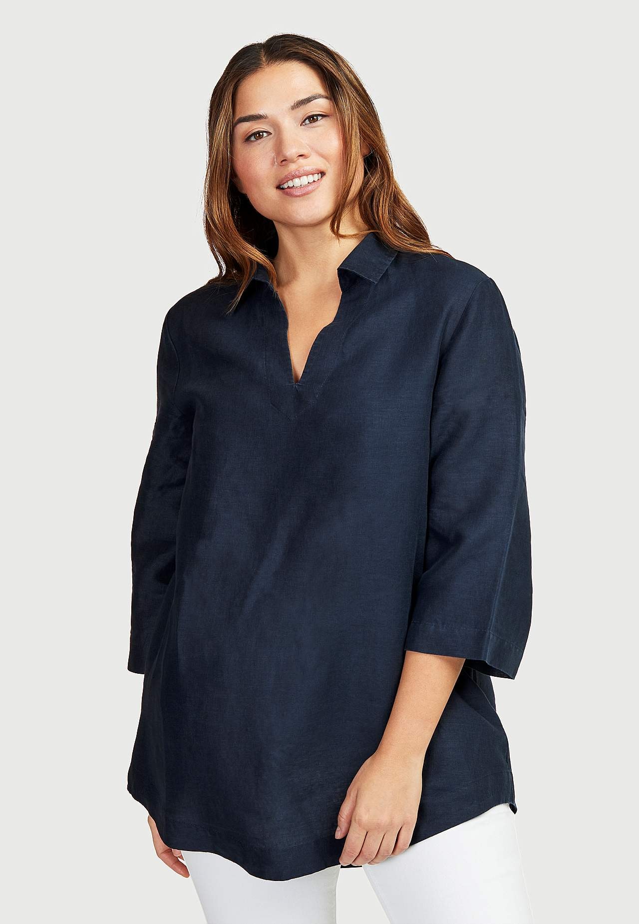 Hørtunika med v-udskæring og krave. 3/4 langt ærme. A-linje design med skjulte sidelommer og en afrundet søm. Længden følger størrelsen, ca. 66-82 cm fra skulderen bagpå.