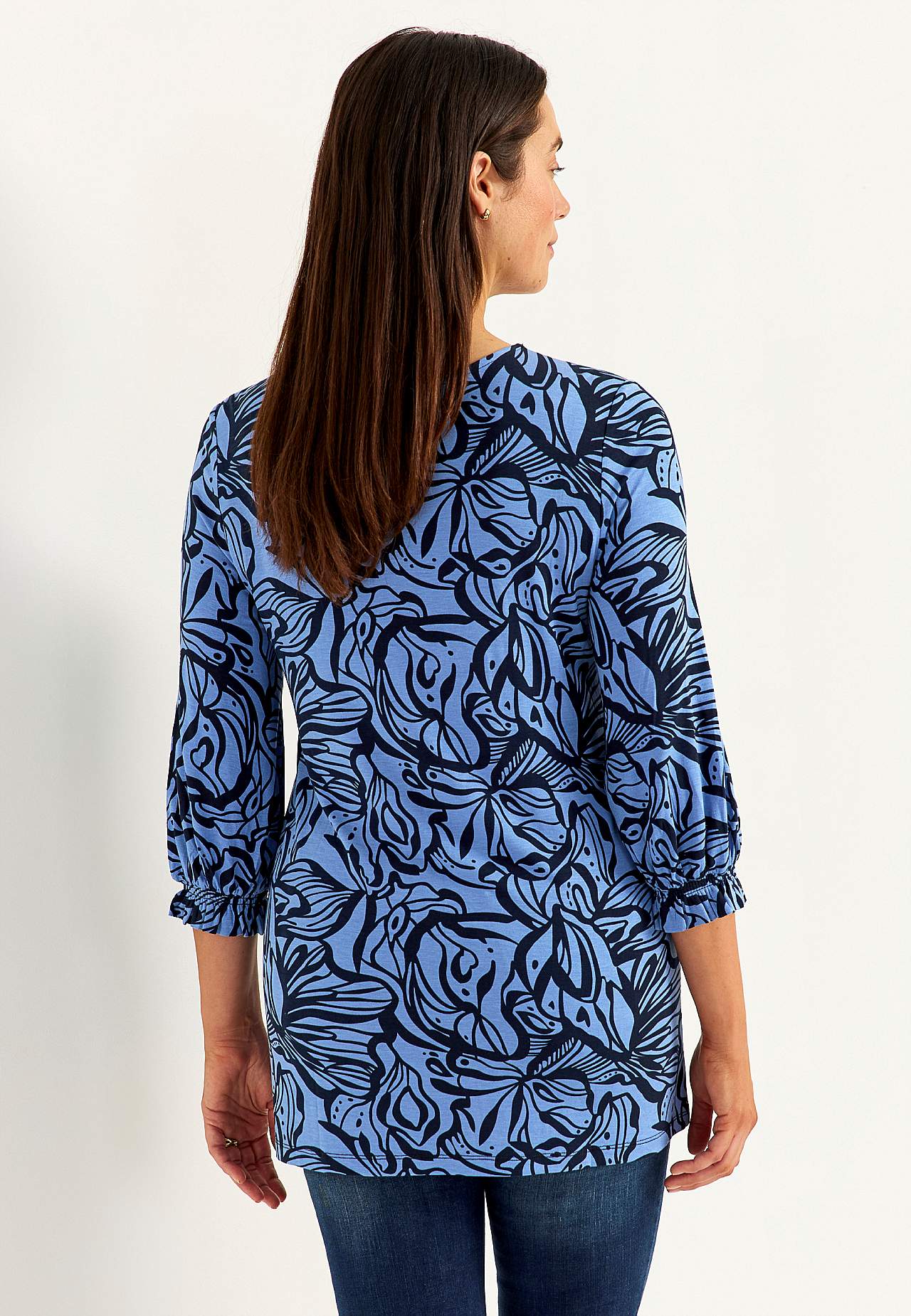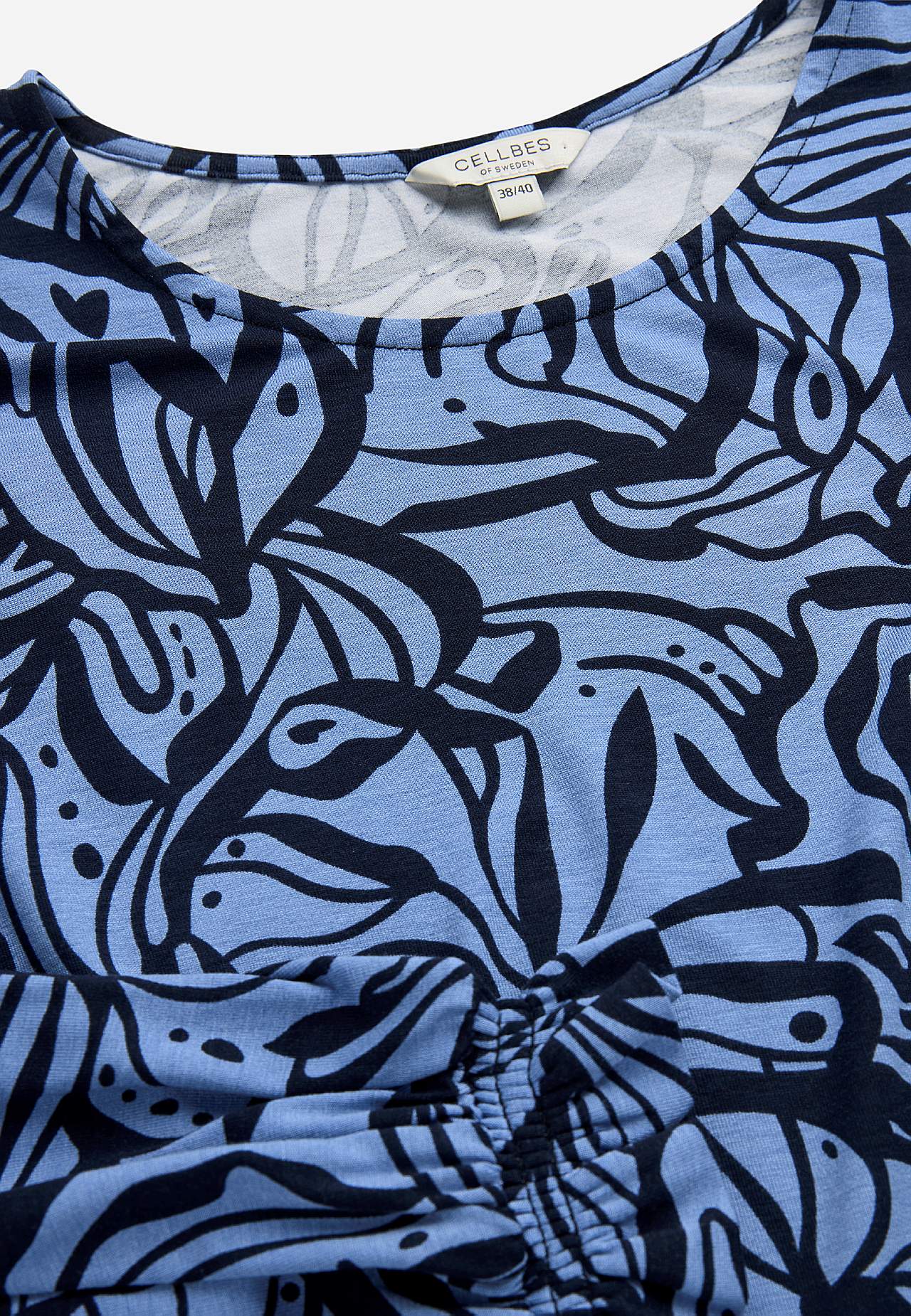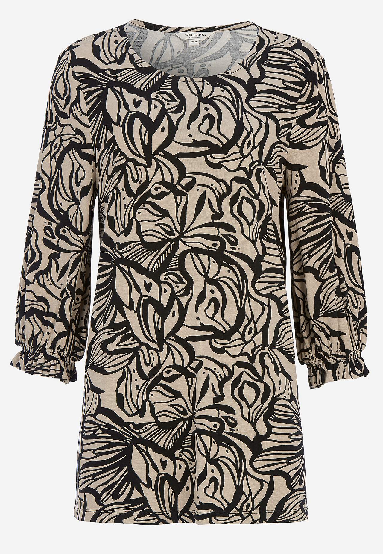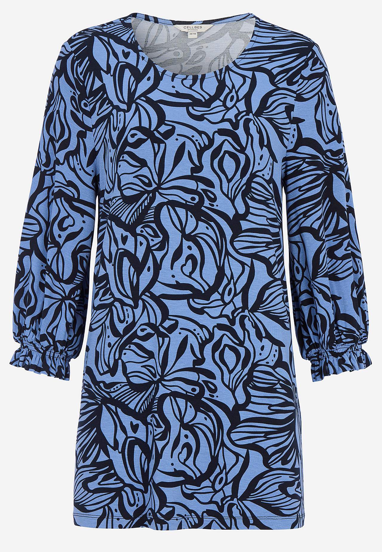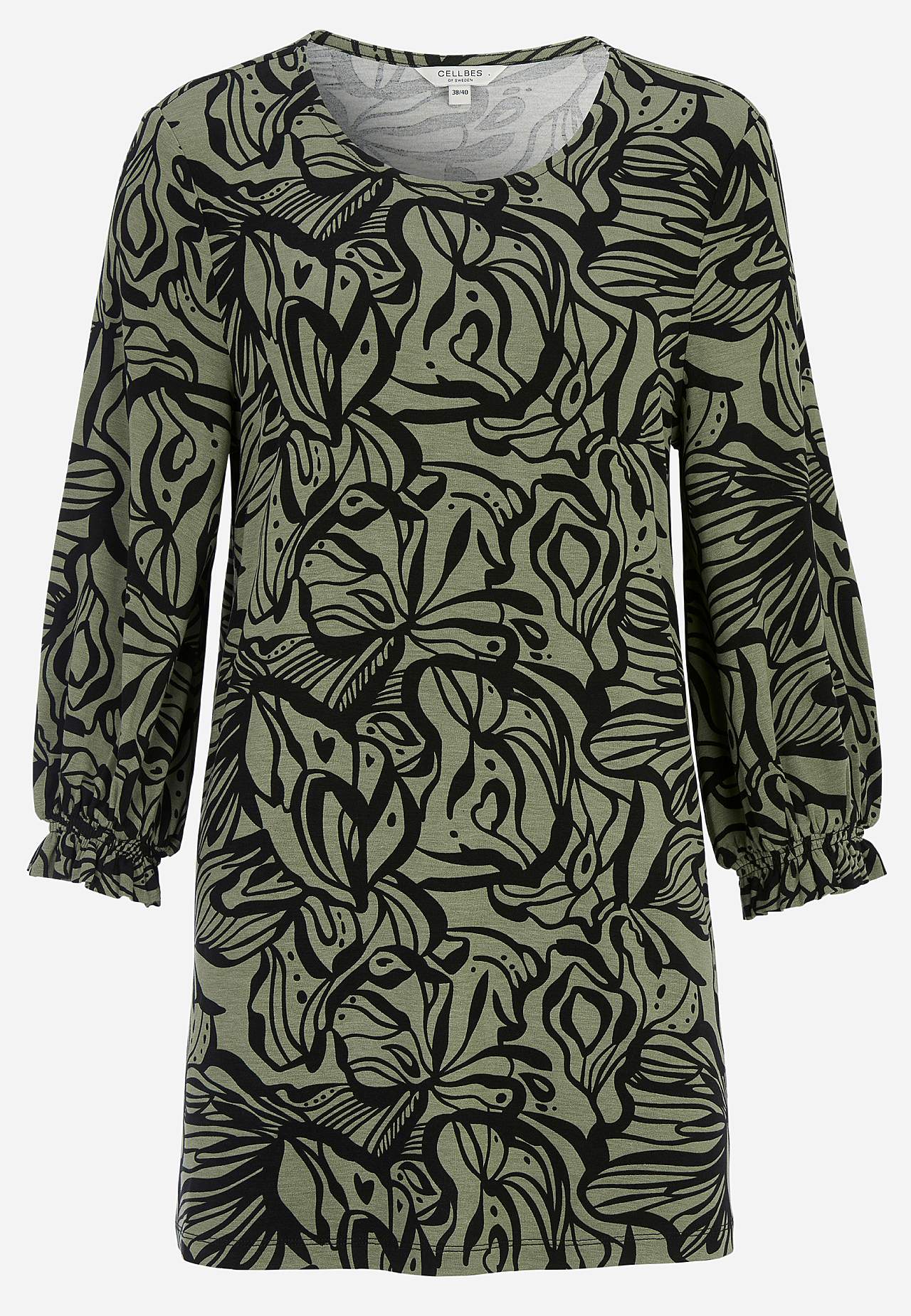Herligt, kraftigt fald. Normal pasform. Afrundet halsudskæring. 3/4 lange, brede ærmer og smock ved manchetterne. Længden følger størrelsen, ca. 73-80 cm fra skulderen.