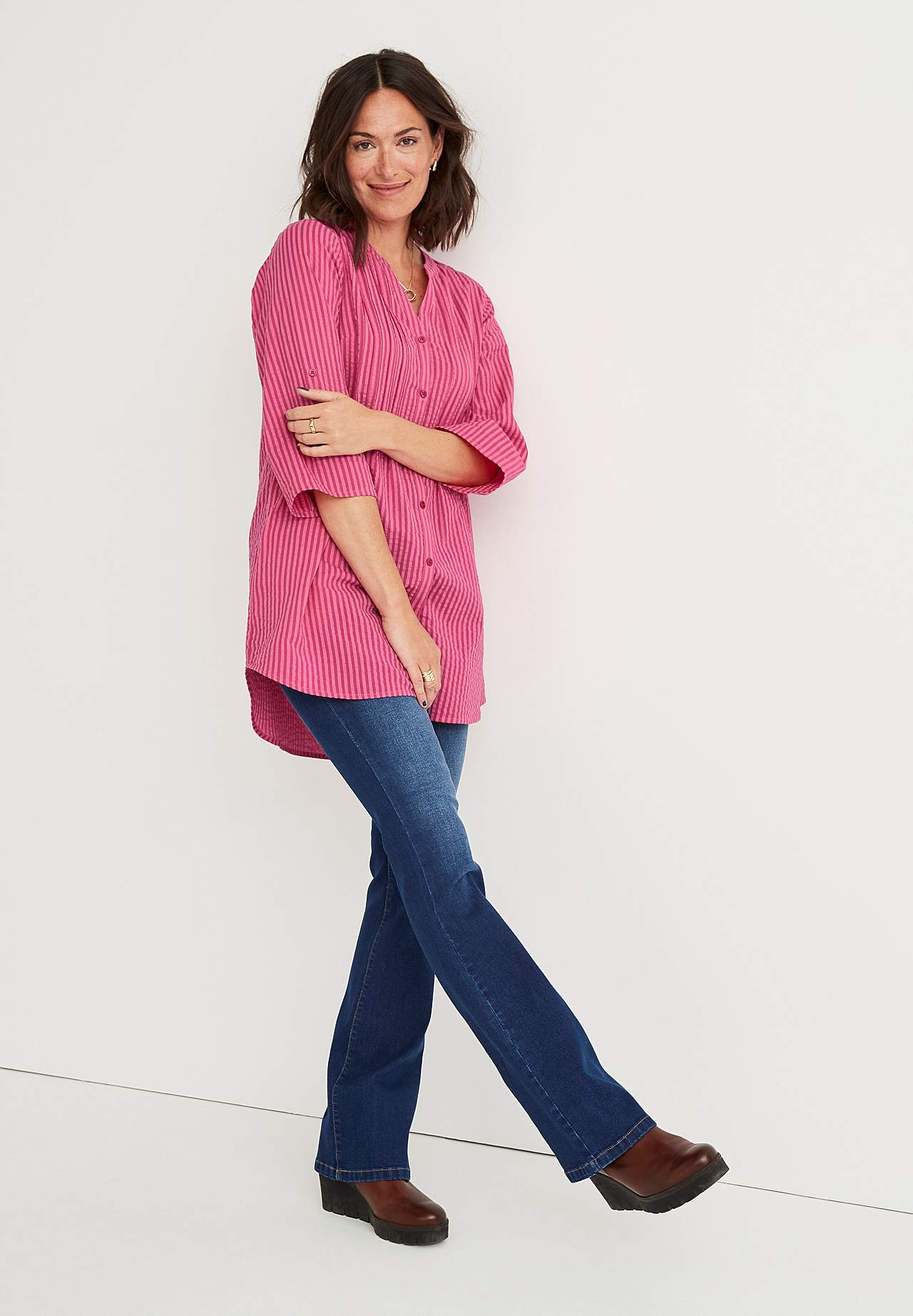 Luftig tunika i vævet seersucker. 3/4 langt rul-op knap ærme. Skjulte lommer i siden. Rund halsudskæring med v-formet åbning. Dekorativ fold foran. Knaplukning. Bærestykke bagpå med samling. Afrundet søm. Længden følger størrelsen, ca. 82-94 cm fra skulderen.