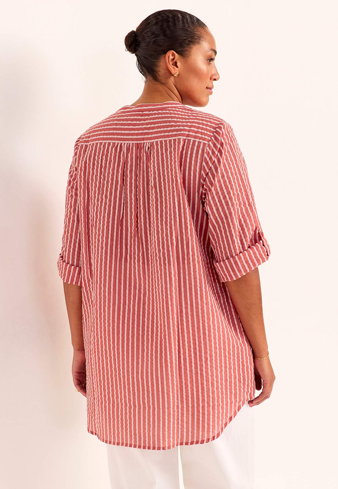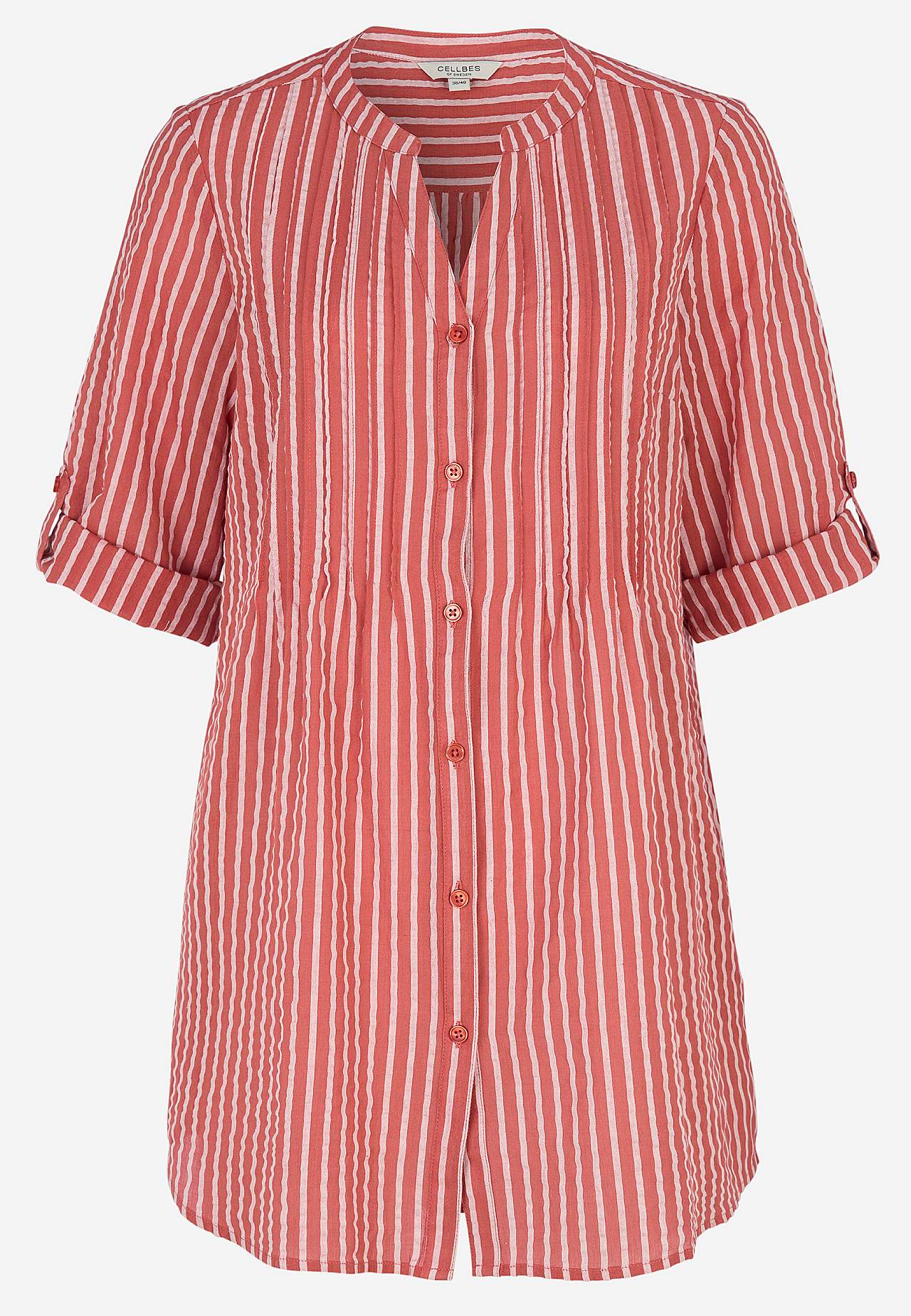 Luftig lang skjorte med dekorativ fold. Herligt materiale i seersucker. Rund halsudskæring med v-formet åbning. Knaplukning. 3/4 langt, bredt rul-op knap ærme. Skjulte lommer i siden. Bærestykke bagpå med rynkedetaljer. Længden følger størrelsen, ca. 82-94 cm fra skulderen.