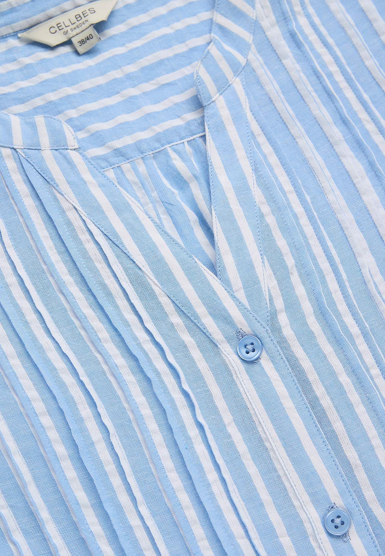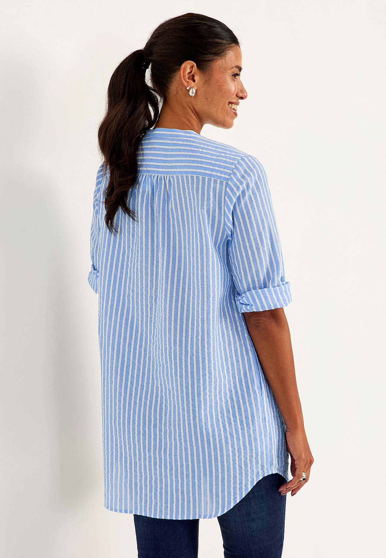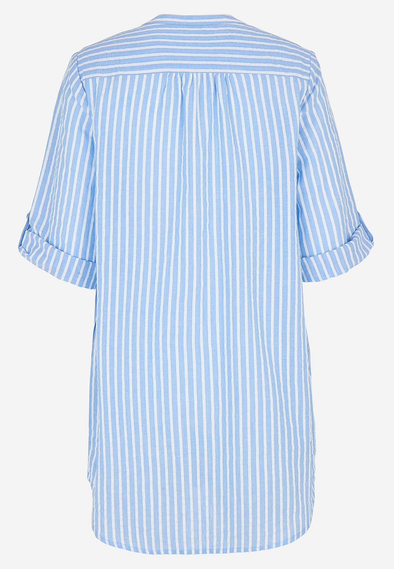 Luftig lang skjorte med dekorativ fold. Herligt materiale i seersucker. Rund halsudskæring med v-formet åbning. Knaplukning. 3/4 langt, bredt rul-op knap ærme. Skjulte lommer i siden. Bærestykke bagpå med rynkedetaljer. Længden følger størrelsen, ca. 82-94 cm fra skulderen.