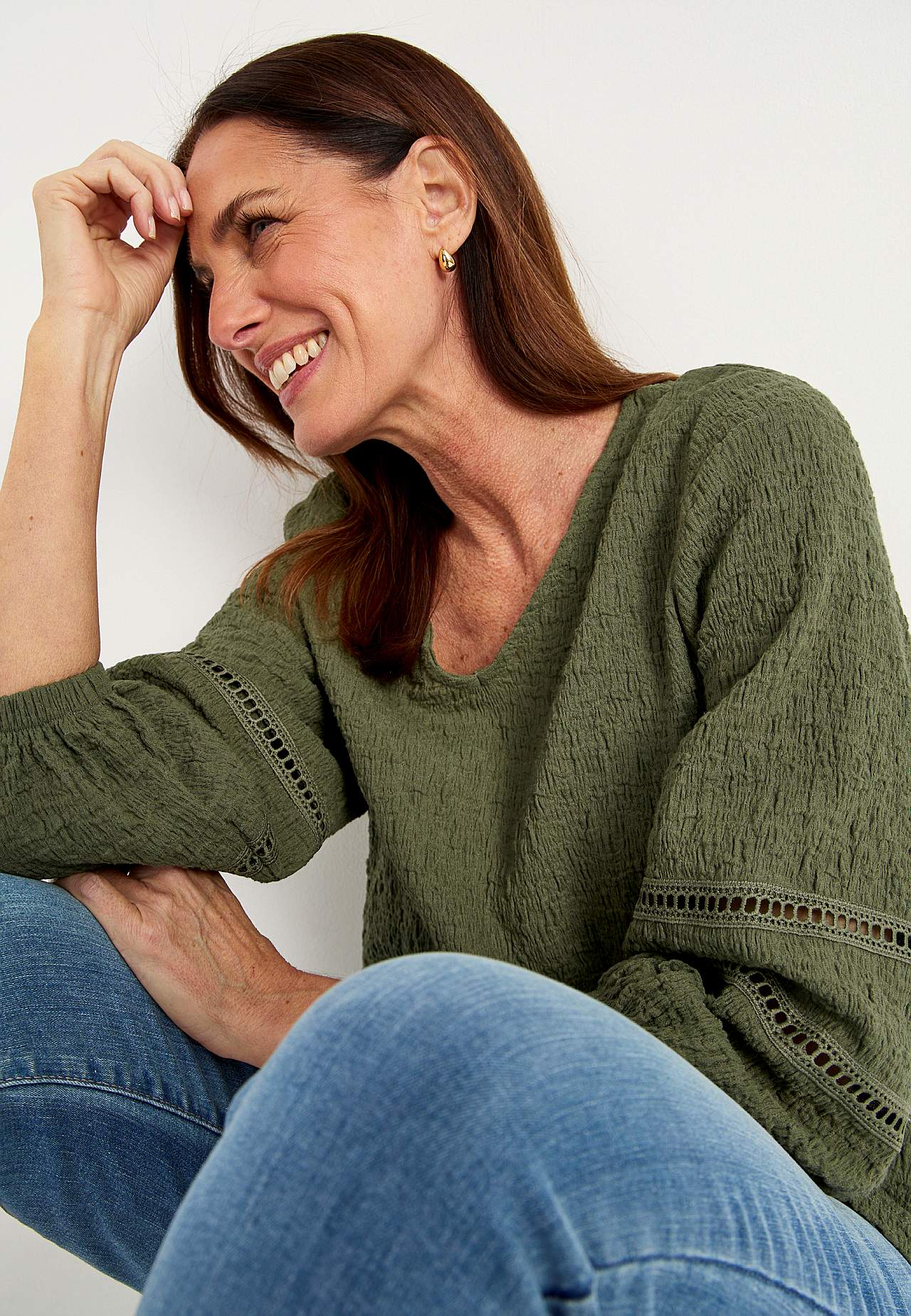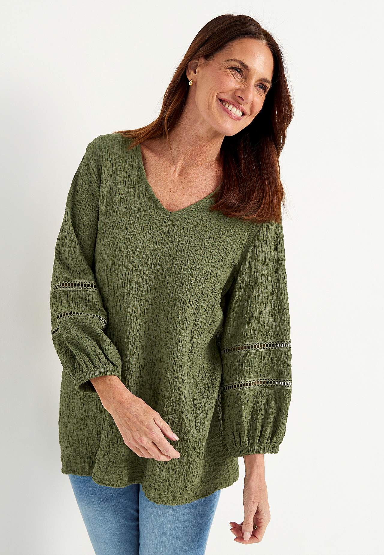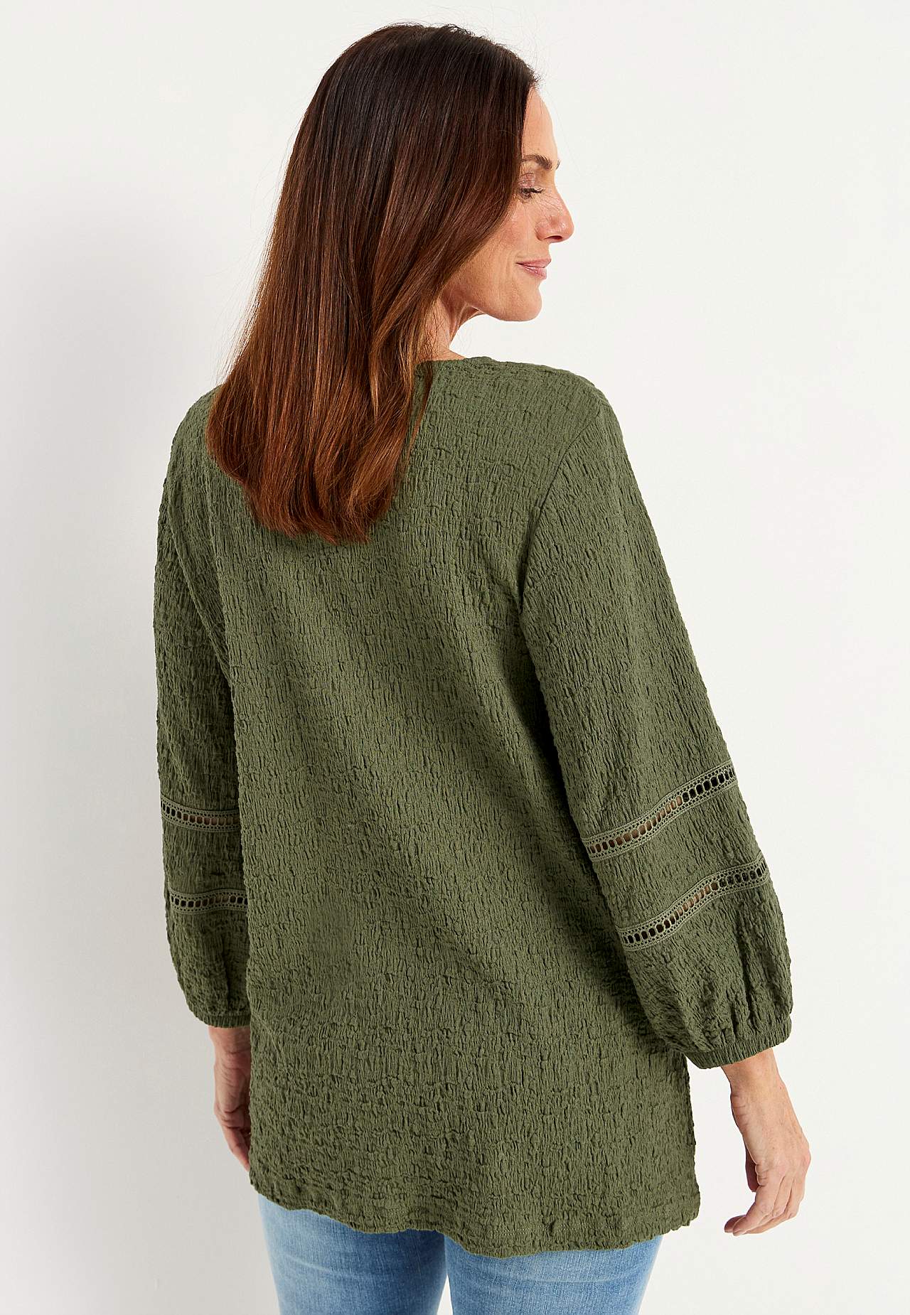 Tunika i komfortabel, elastisk bomuldsblanding med struktur. Dejlige detaljer med hulmønster på ærmerne. Normal pasform med let udsvingende nederste del. V-udskåret halsudskæring. 3/4 lange, brede ærmer med elastik ved manchetterne og dekorative sting med hulmønster. Lige søm. Ryglængden følger størrelsen, ca. 72-80 cm.