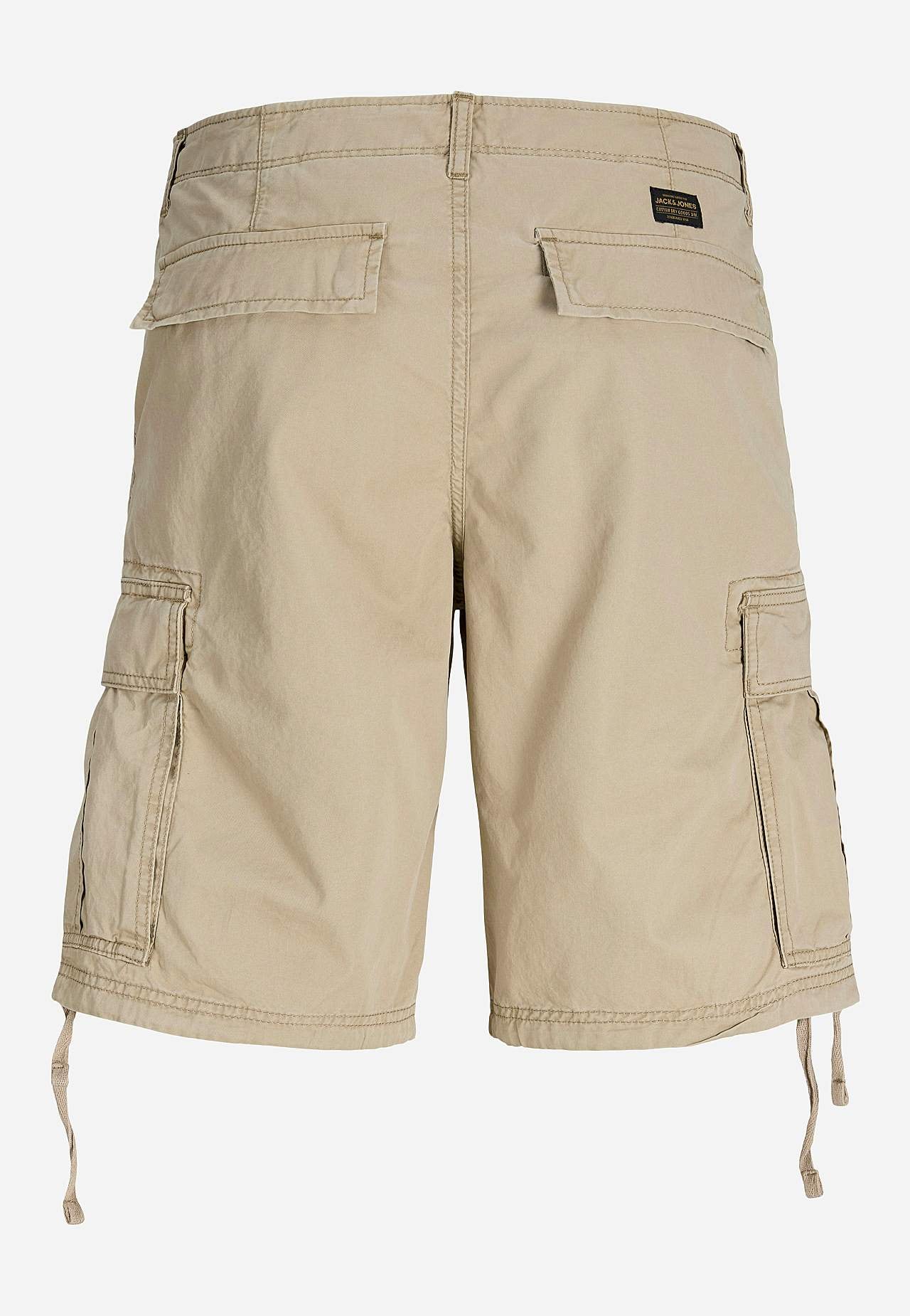 Vævet shorts i bomuldskvalitet. Normal talje med gylp med lynlås og bæltestropper. Sidelommer. Benlommer med klap. Paspolerede baglommer med klap og trykknapslukning. Bindbar snøre nederst. Indvendig benlængde ca. 28 cm i størrelse M.