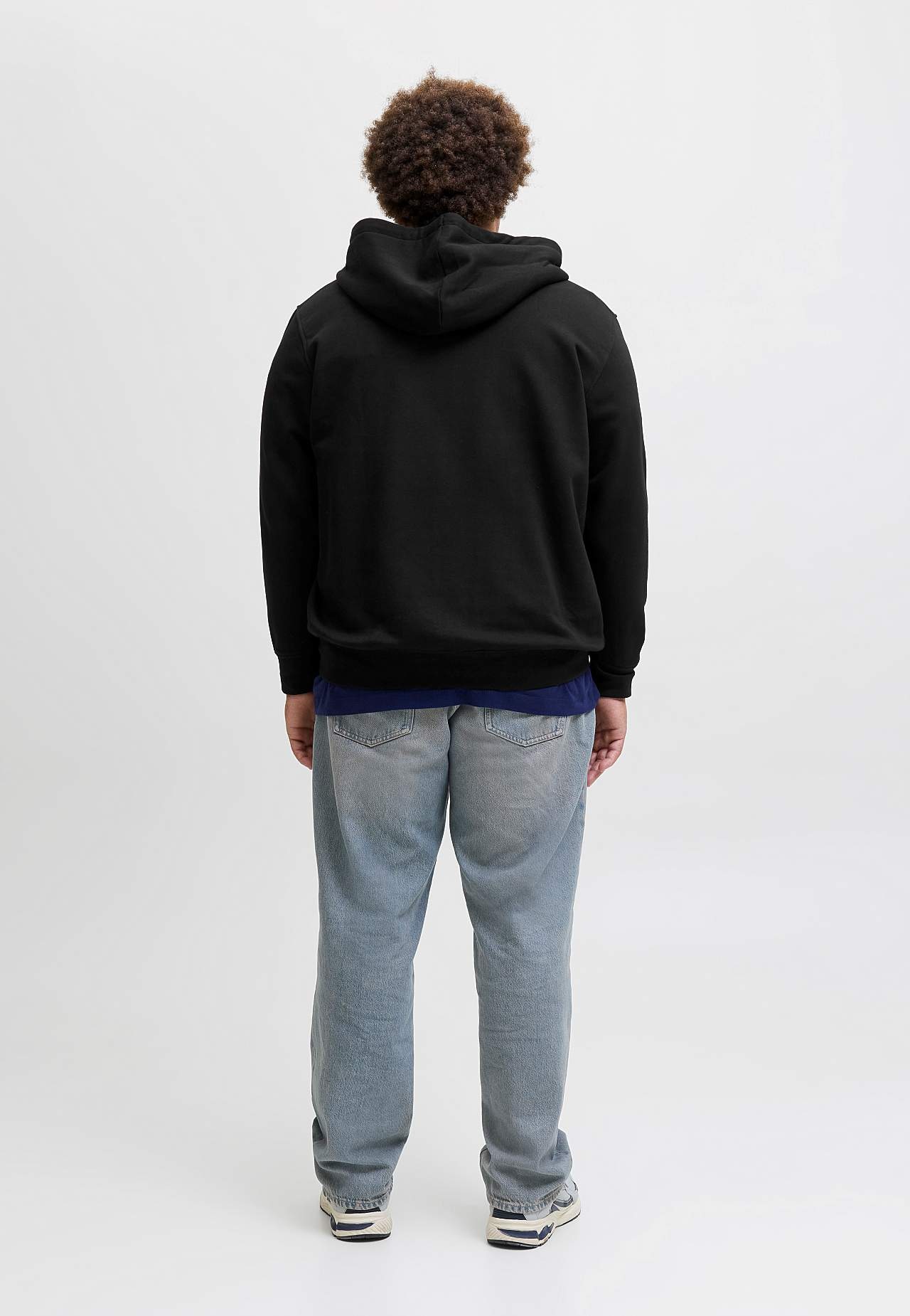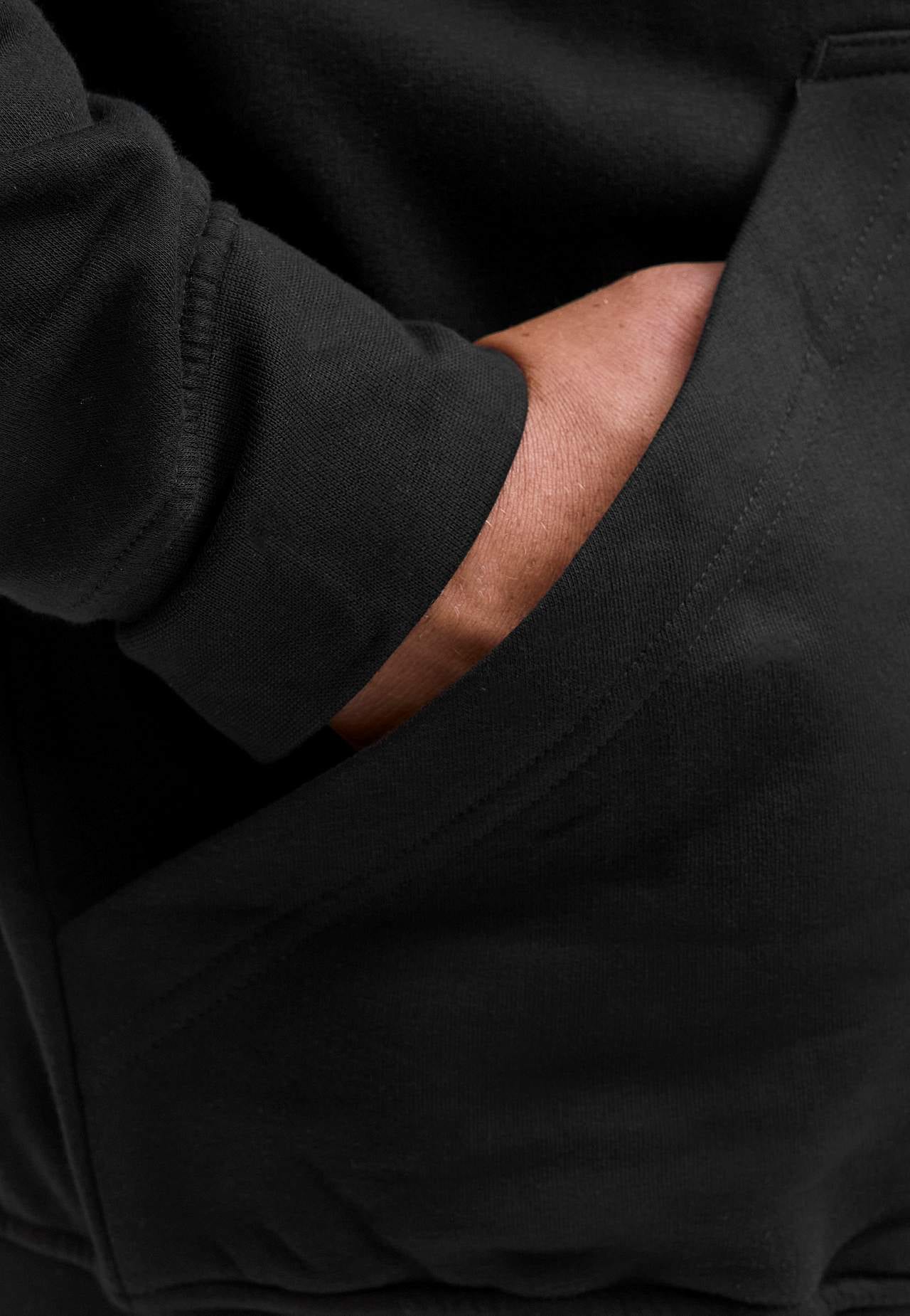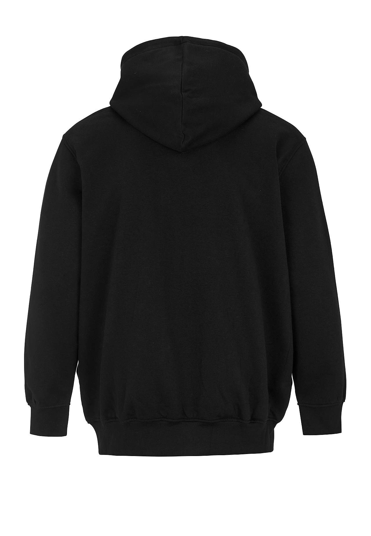 Blød kvalitet med børstet for. Rummelig pasform. Stor, fin hætte med træksnøre. Lukning med lynlås. Rummelige kængurufrontlommer. Lille tryk på brystet. Lange ærmer med ribmanchet ved manchetterne. Ribmanchet ved nederste kant. Længde fra skulder ca. 80 cm i størrelse 3XL.