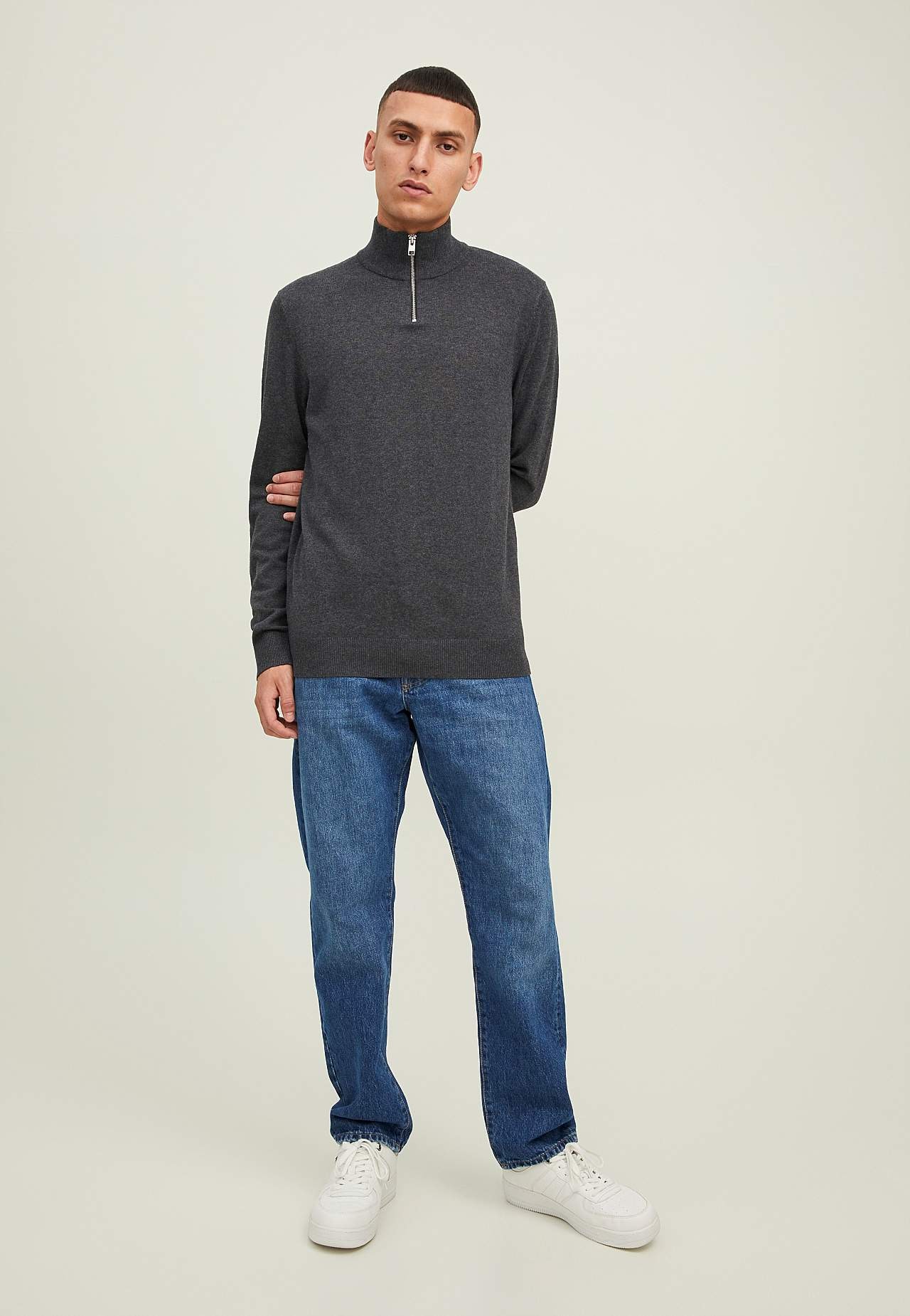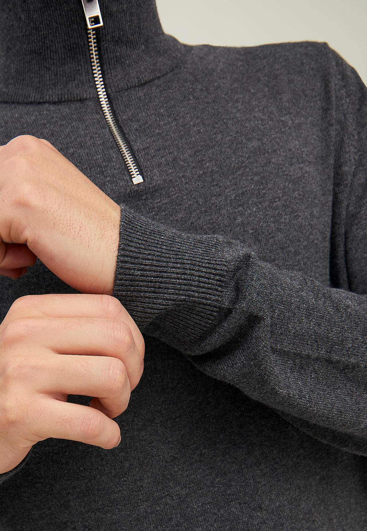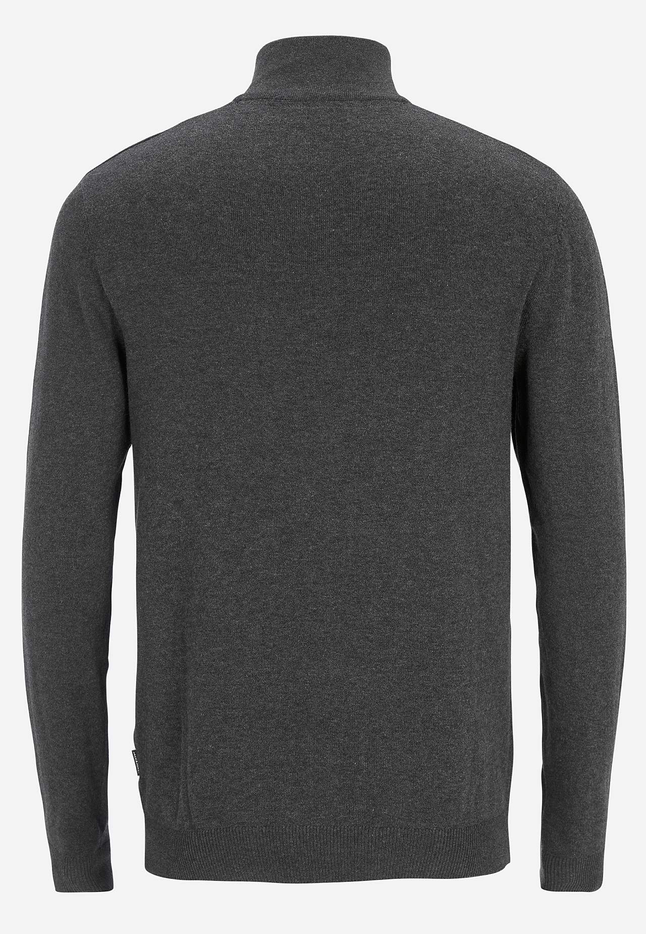 Fintstrikket langærmet trøje. Normal pasform. Krave med lynlås. Lange ærmer med ribstrikkede ribkanter ved manchetterne. Lige søm med ribstrikket ribkant. Længde fra skulder ca. 75 cm i størrelse S.
