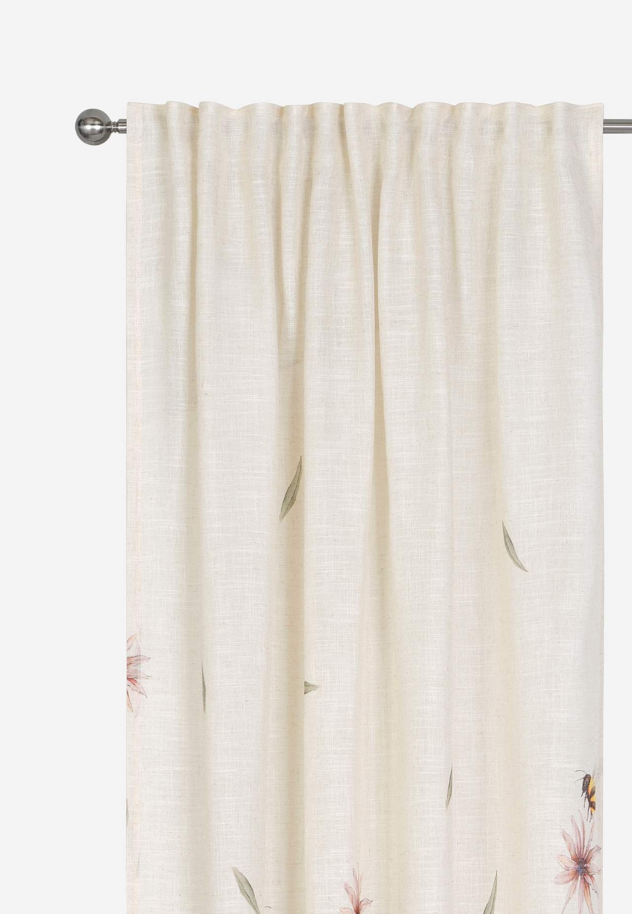 Digitalt trykte panelgardiner med blomster, kronblad og humlebier. Tyndt vævet stof med en smule kraftigere tråde, der giver struktur og en flot glans. Trykket ses tydeligt på bagsiden. Overlocket nedersøm.