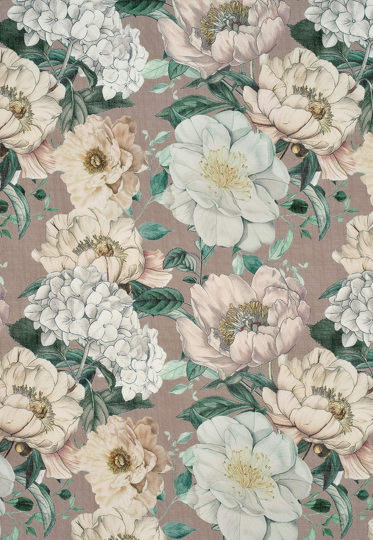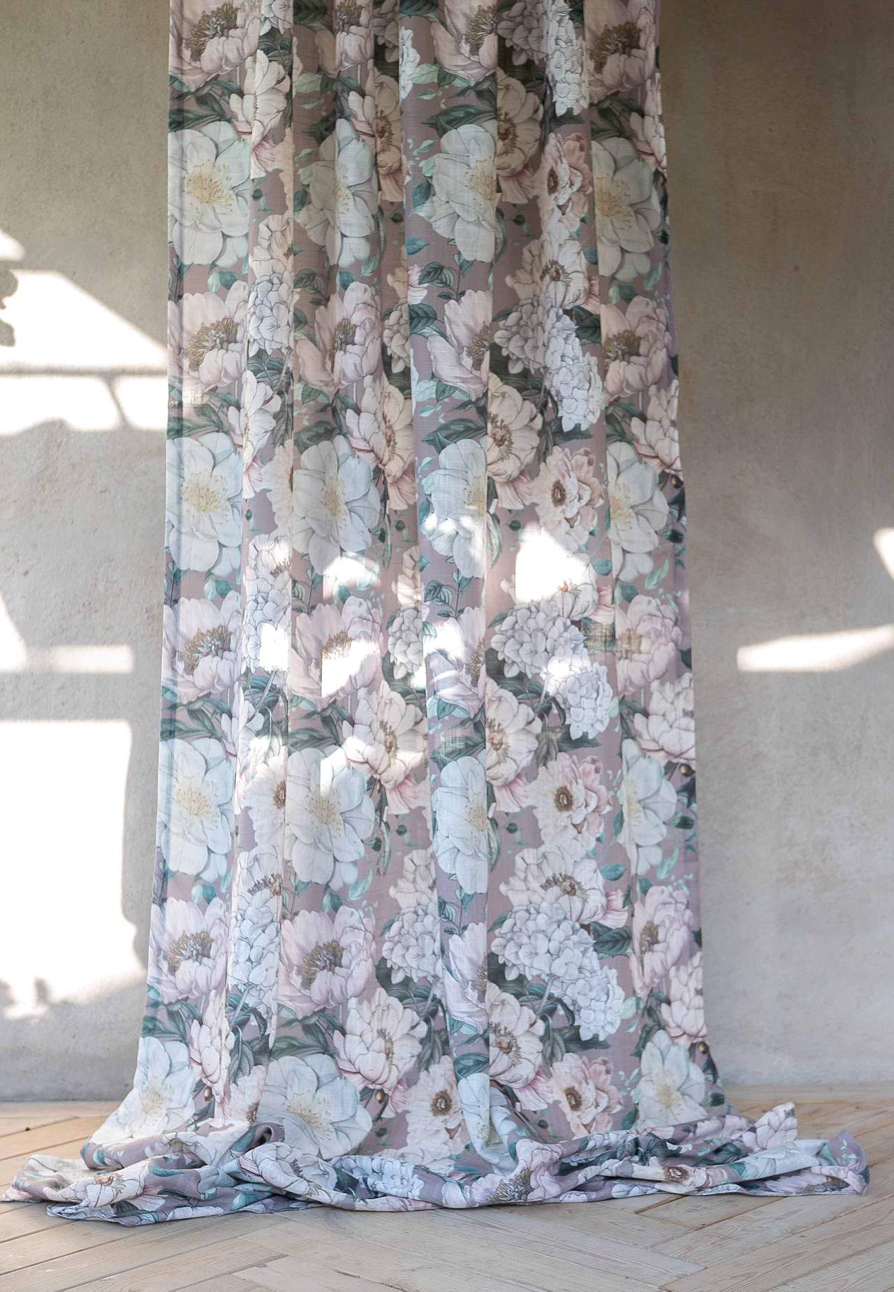 Panelgardiner med smukke pæoner. Materiale med dejligt fald. Indvævede slubtråde giver en flot struktur. God lysgennemskinnelighed. Trykket ses tydeligt på bagsiden.