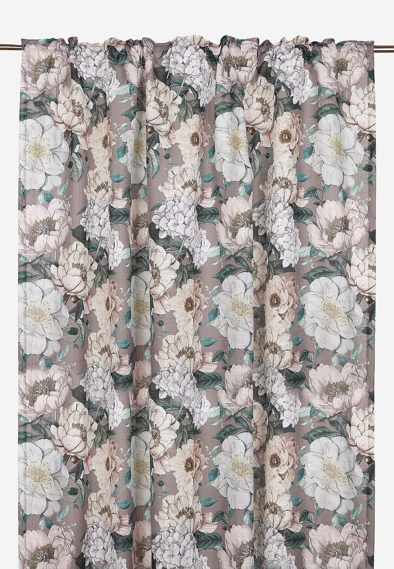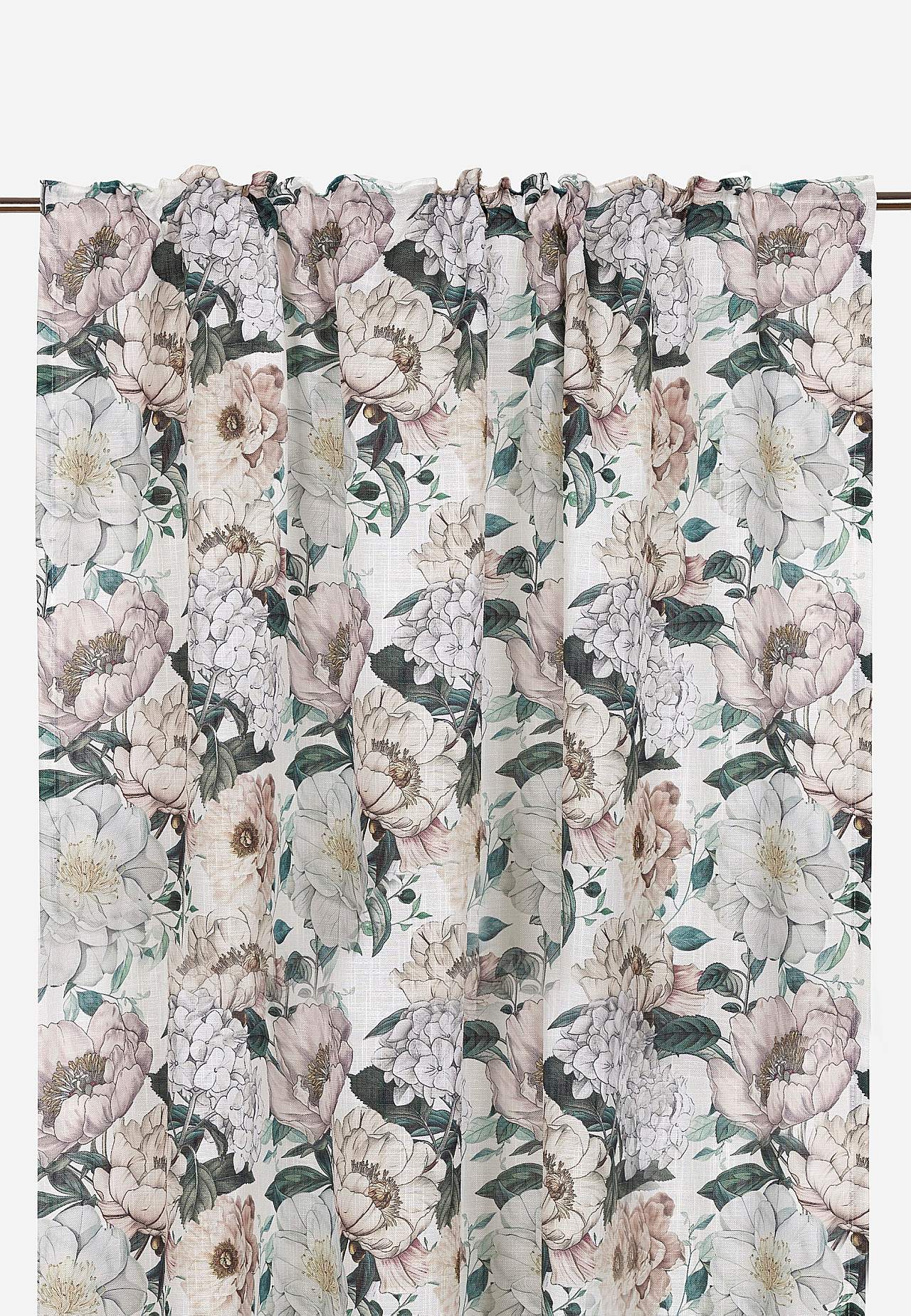 Panelgardiner med smukke pæoner. Materiale med dejligt fald. Indvævede slubtråde giver en flot struktur. God lysgennemskinnelighed. Trykket ses tydeligt på bagsiden.