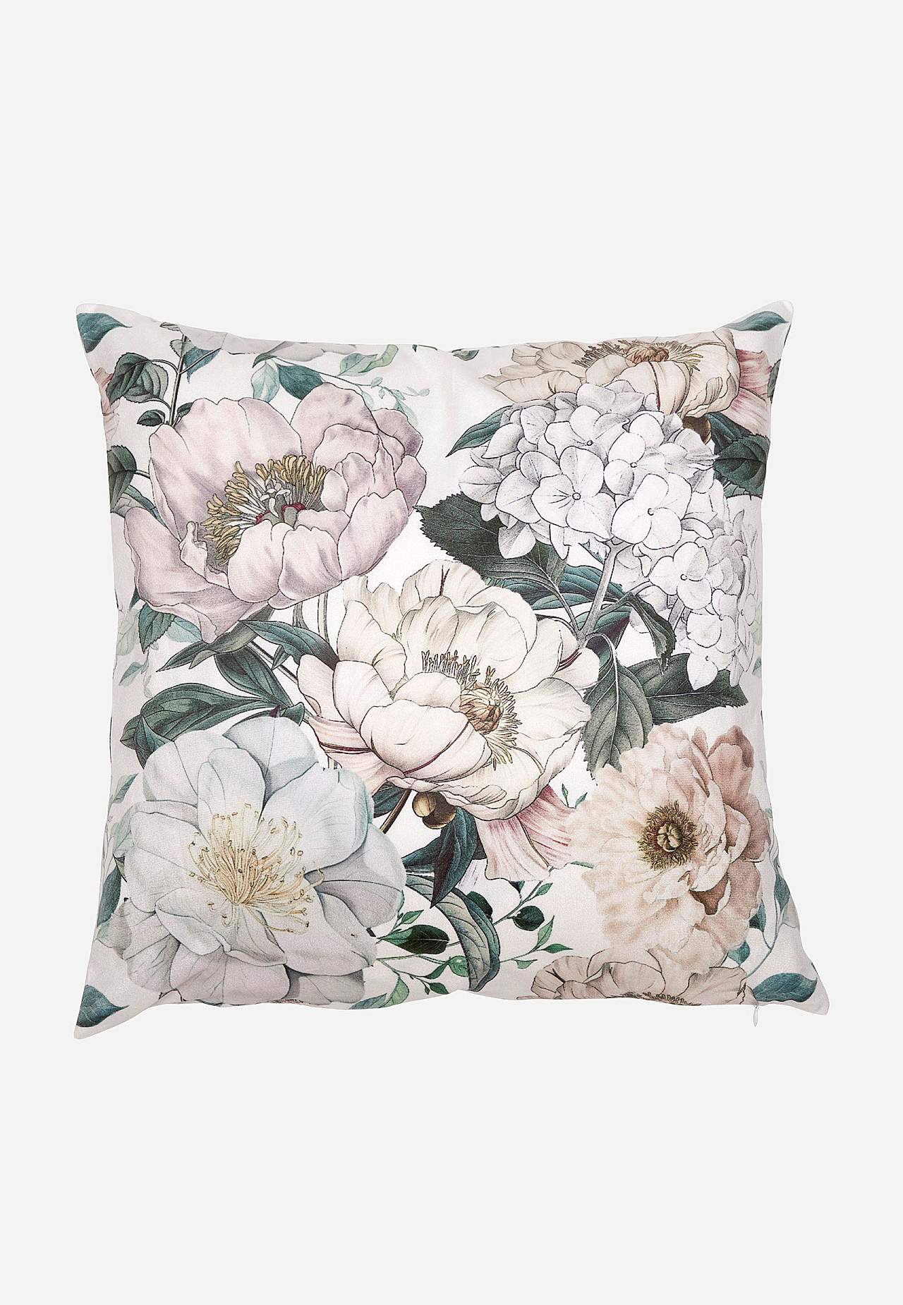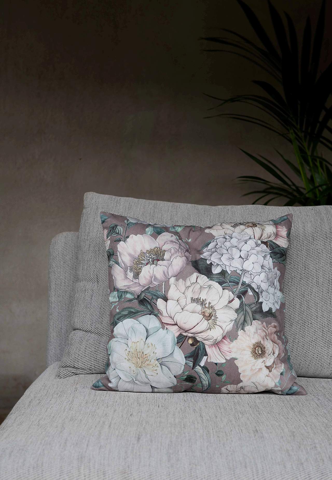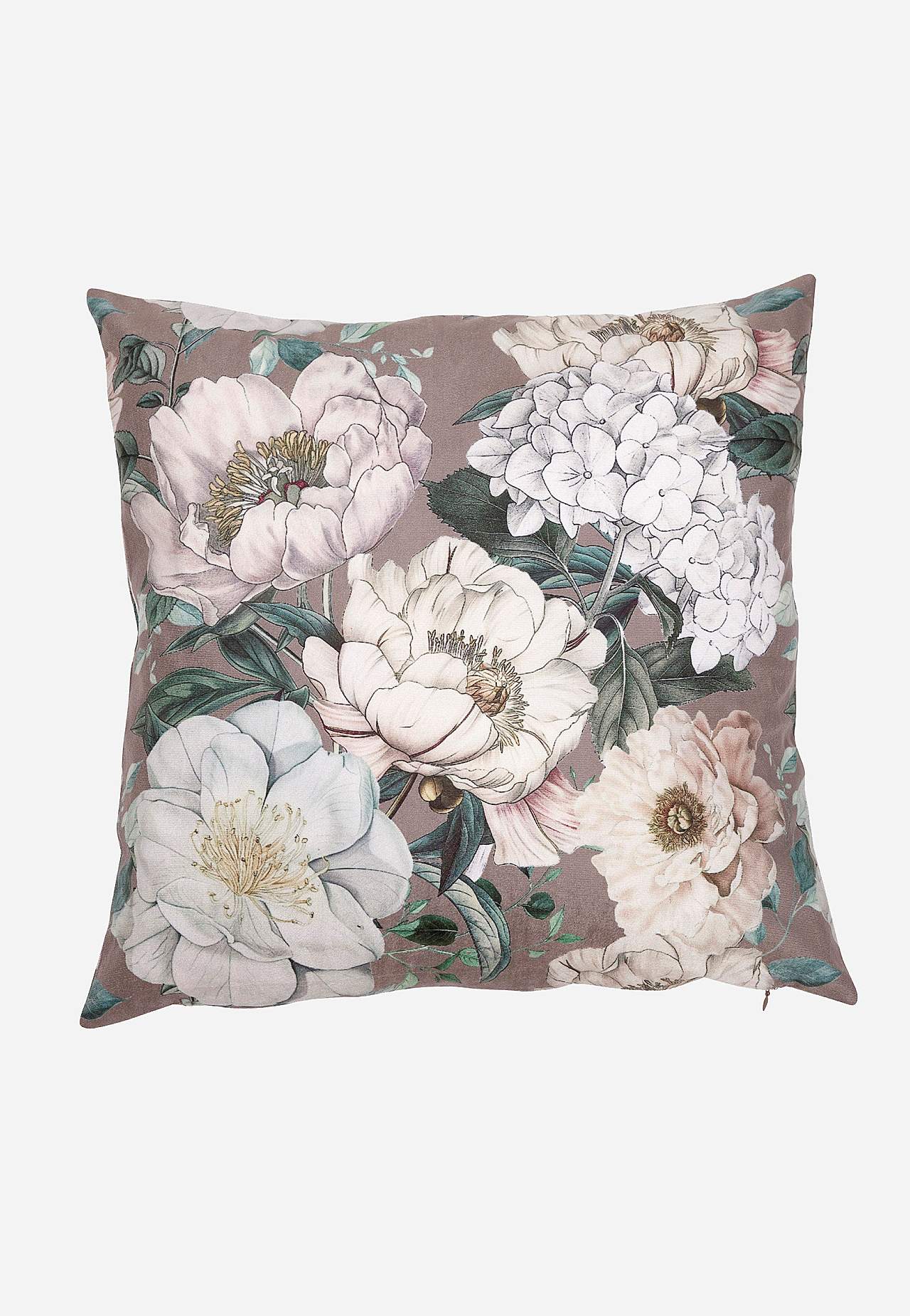 Pudebetræk med smukke pæoner og hortensiaer. Blødt fløjlsstof i polyester. Samme mønster på for- og bagside. Sidelynlås. Størrelse: 45x45 cm.