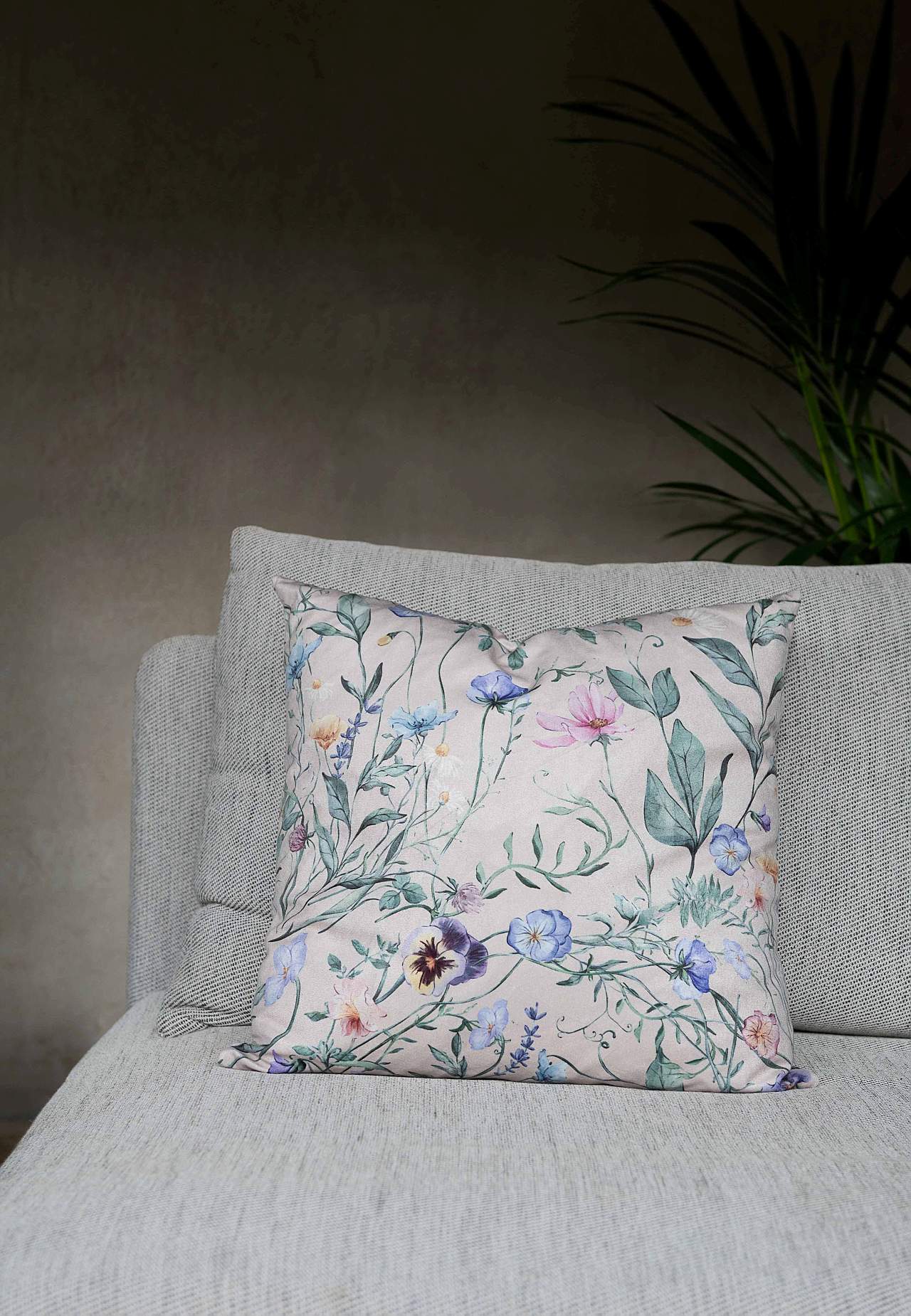 Pudebetræk med romantiske blomster, kronblad og bugtede stilke. Blødt fløjlsstof i polyester. Samme mønster på for- og bagside. Sidelynlås. Størrelse: 45x45 cm.