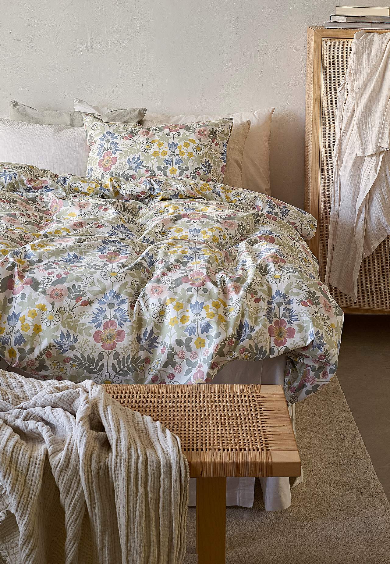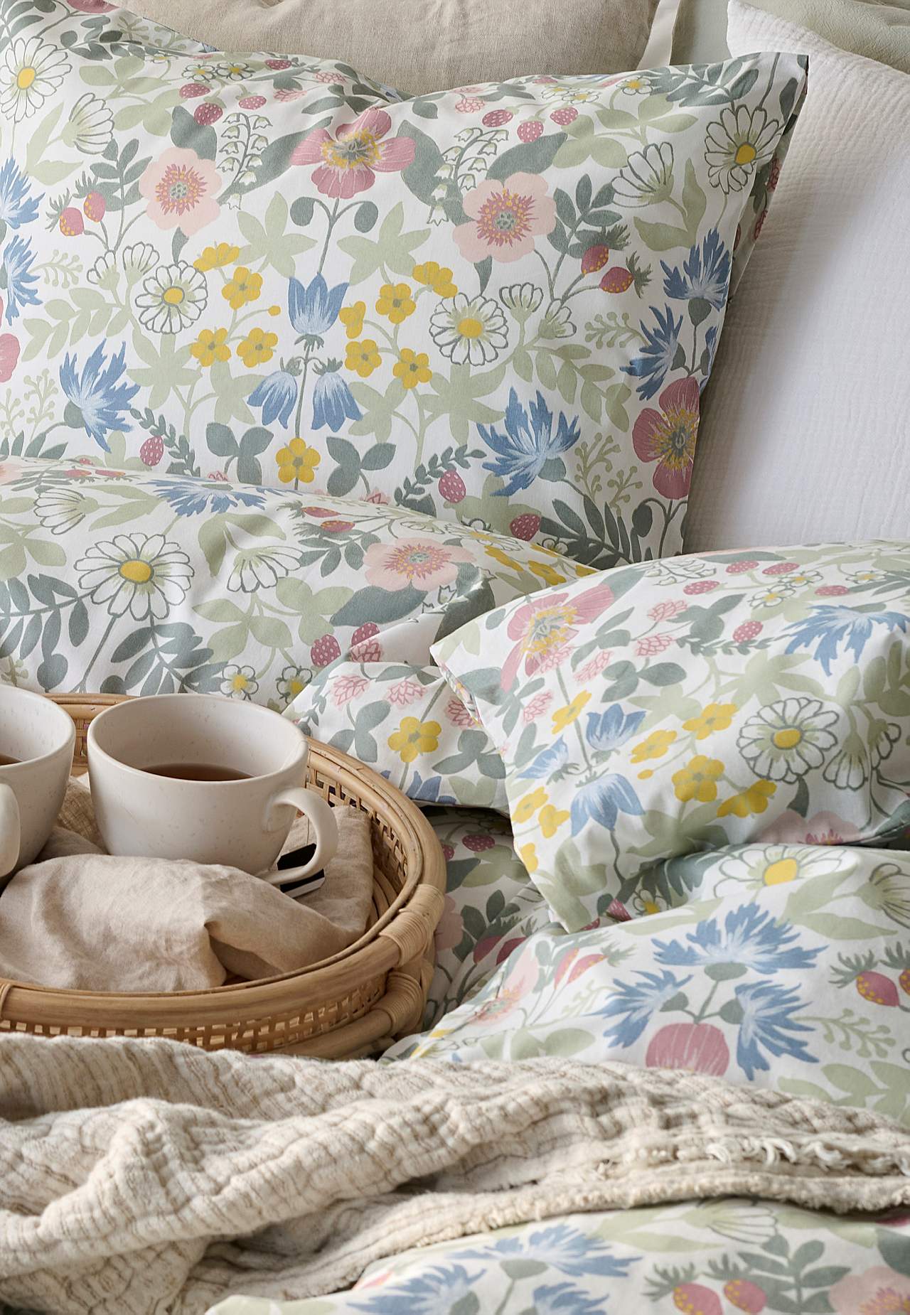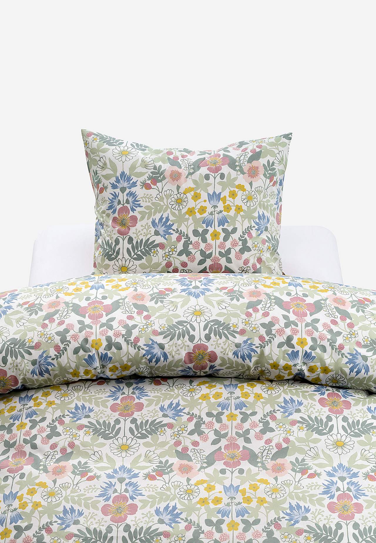 Sengesæt i blød, fin bomuld. Printet sengesæt med småblomstret mønster og ensfarvet bund. Samme mønster på for- og bagside. 2 dele. Dynebetræk størrelse 150x210 cm, pudebetræk 50x60 cm. Dynebetræk med håndhuller øverst. Pubebetræk med kuvertåbning. Trådtal: 144.