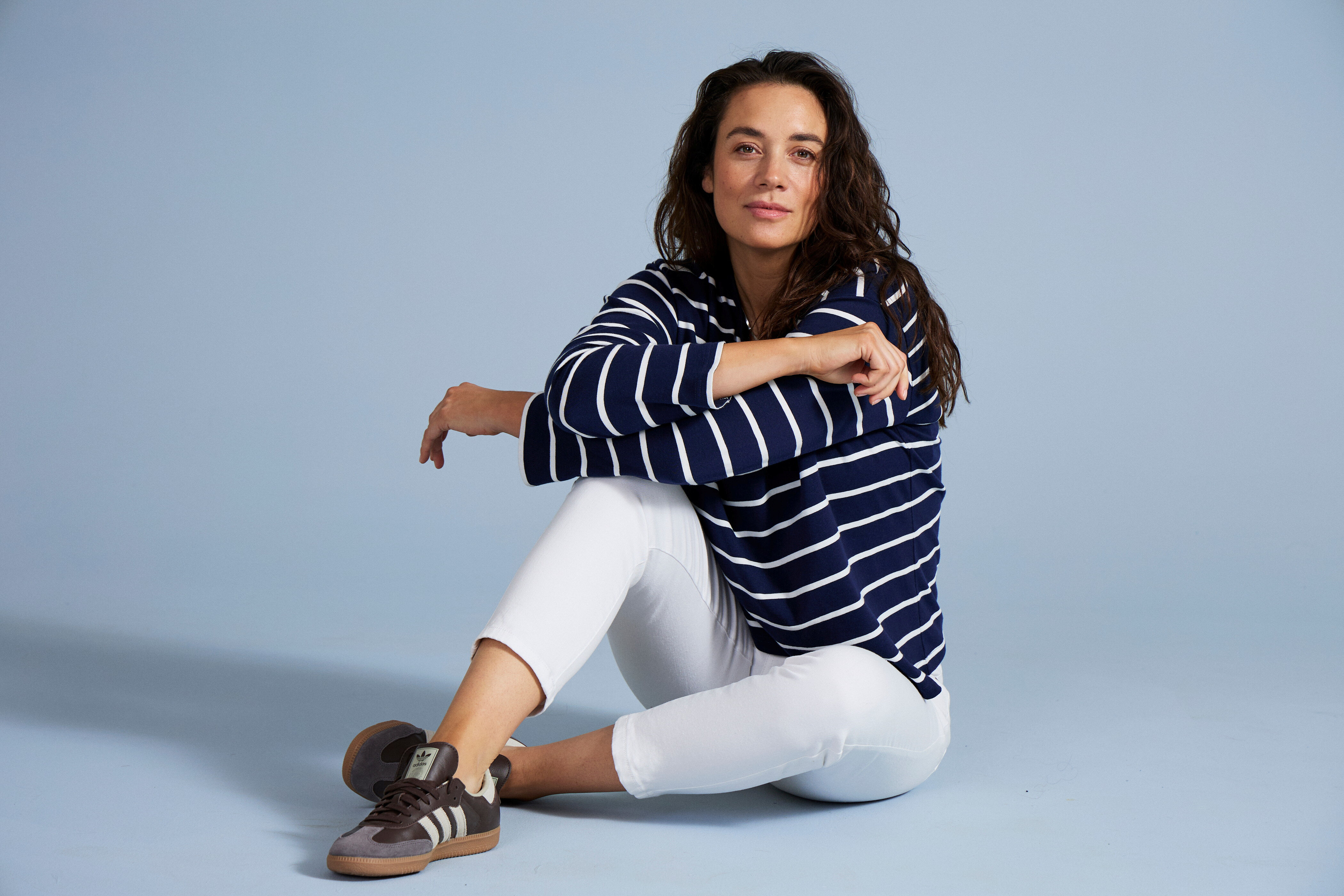 Kvinna i randig trikåtopp sitter på golvet.