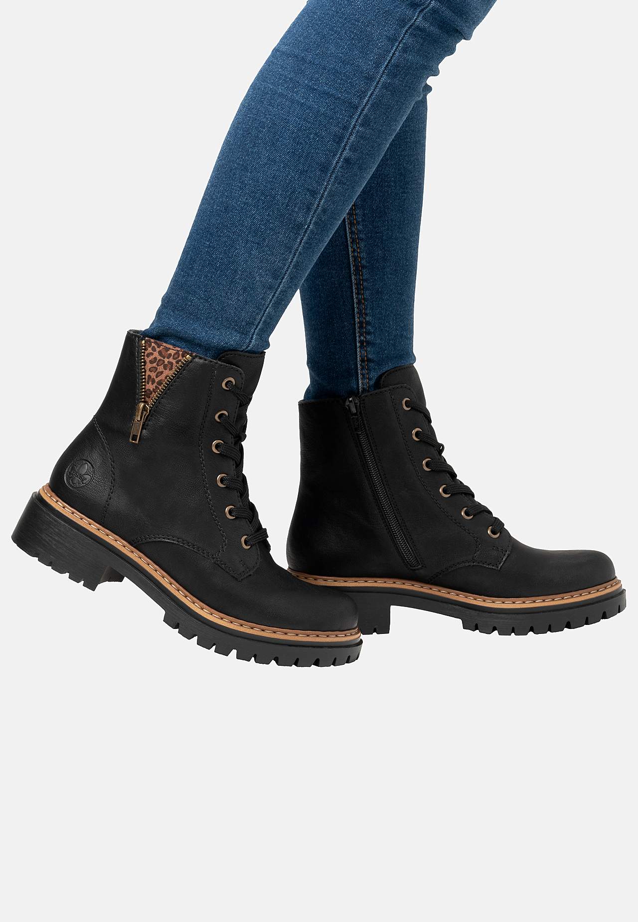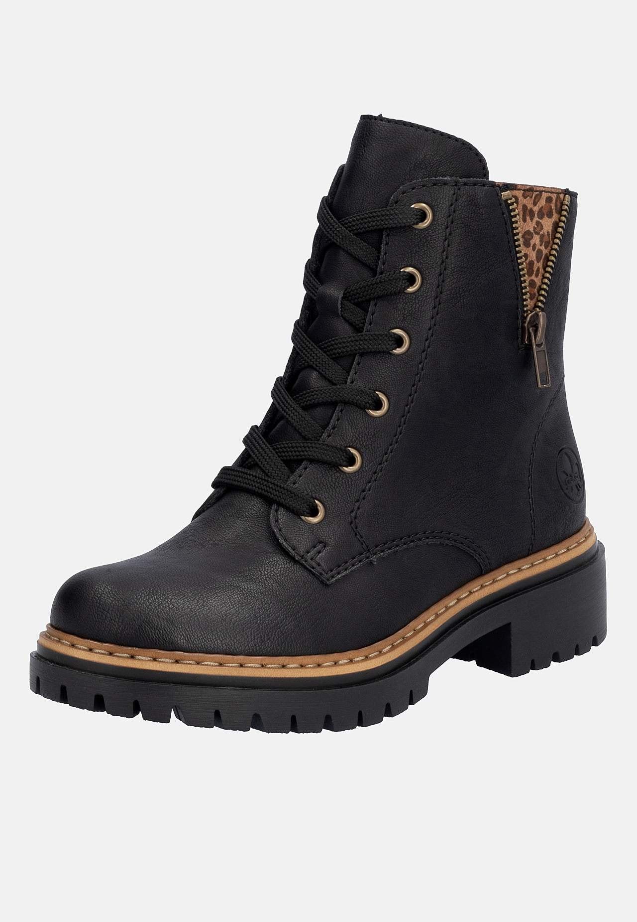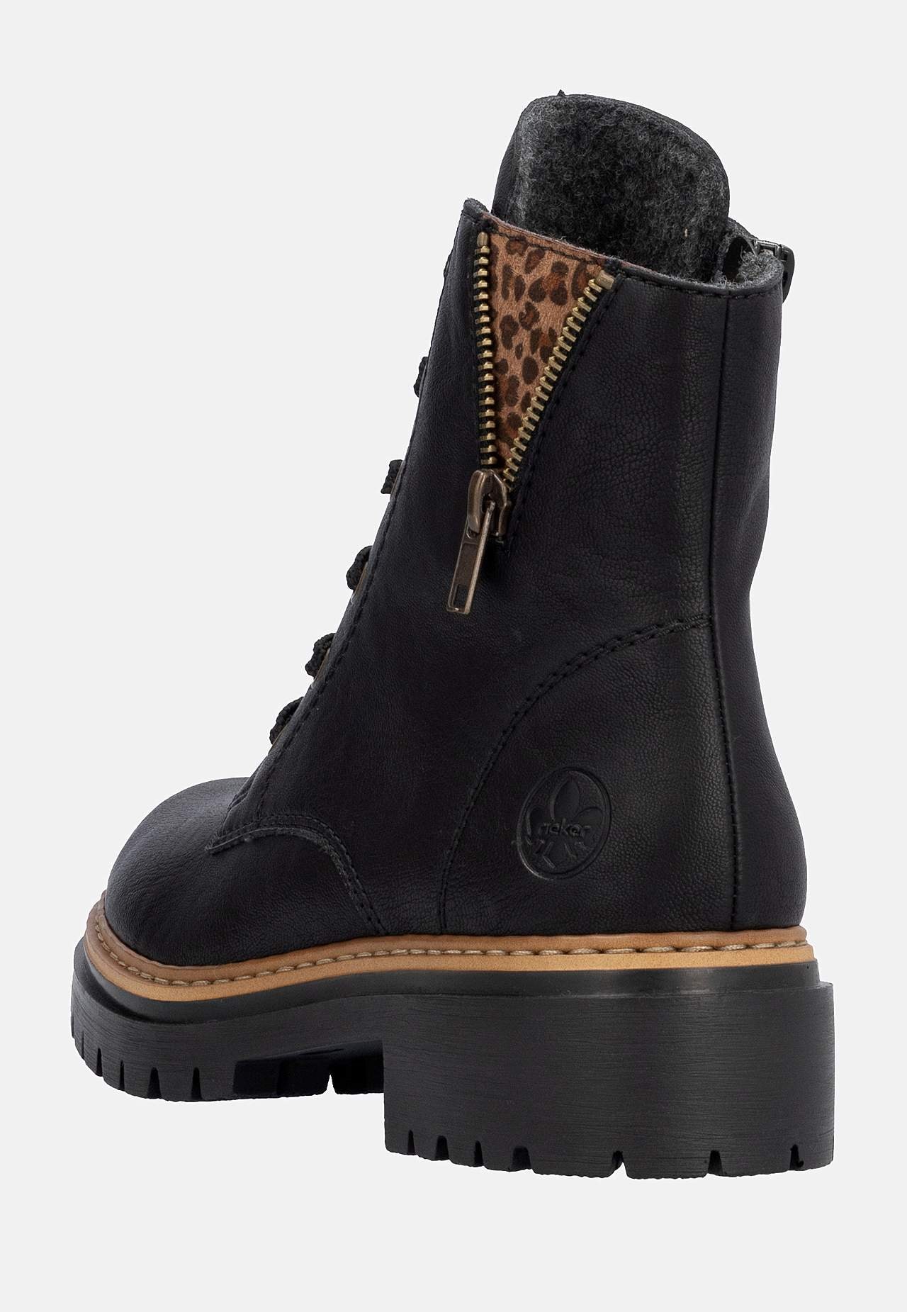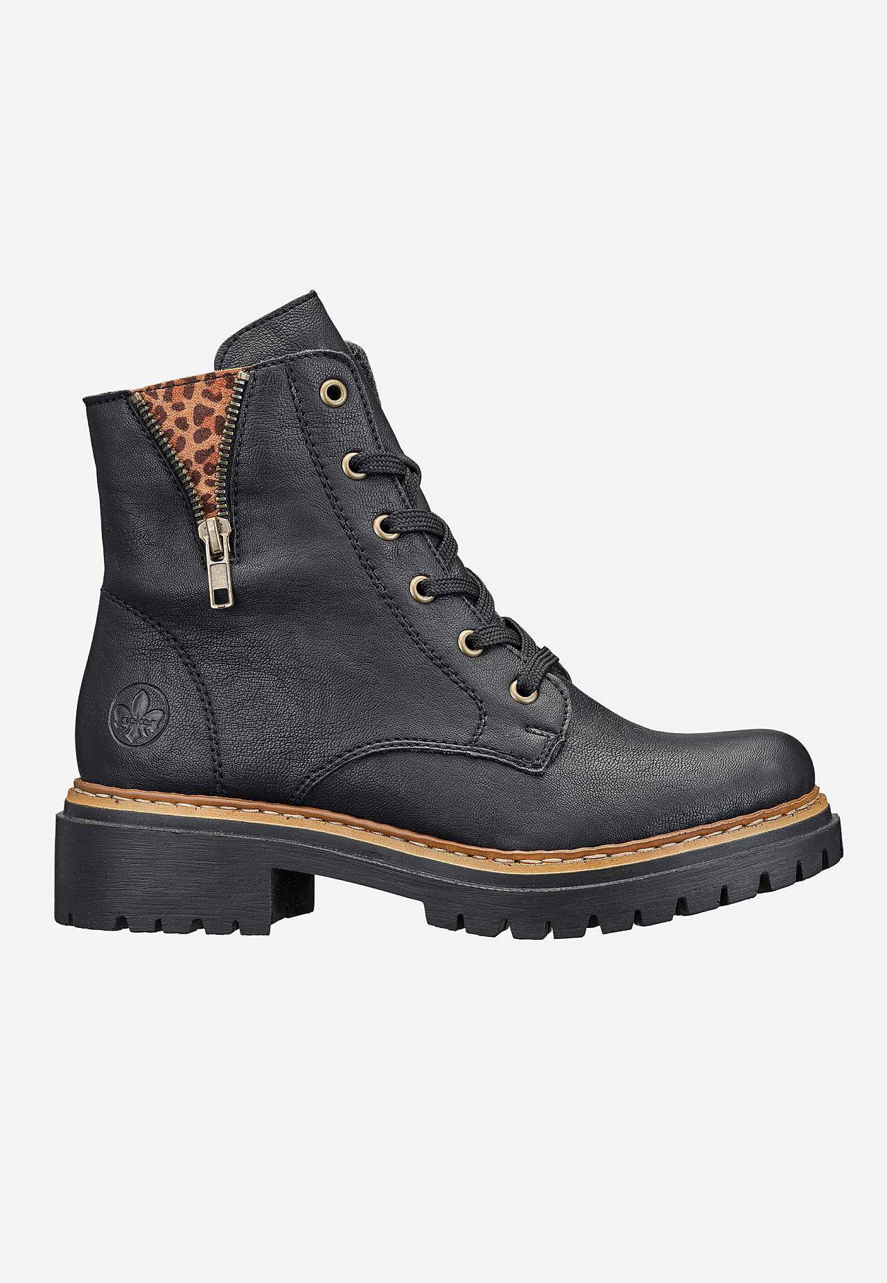Varmt foret ankelstøvle. Leopard kile på ydersiden med dekorativ lynlås. Lynlås på indersiden af foden let at tage af og på. Justerbar skaftvidde med snøring. Filtet, varmende inderfor. Filtet, blød indersål. Robust ydersål med godt greb. Rieker Antistress: Se nedenfor. Overside i kunststof. For i tekstil. Indersål i teksti... Læs mere