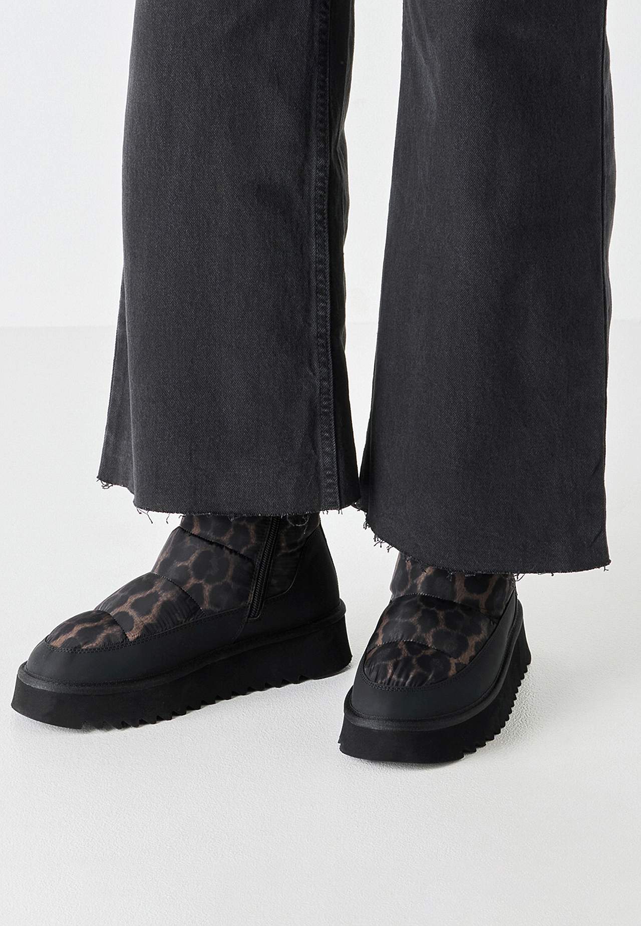 Snestøvle med en quiltet, leopard overside. Læderimitation nederst. Varmt, blødt for i kunstpels. Lynlås på indersiden. Justérbar træksnøre bagpå med stopper. Blød indersål i kunstskind. Vaflet ydersål. Overside i tekstil. For i tekstil. Indersål i tekstil. Ydersål i kunststof.