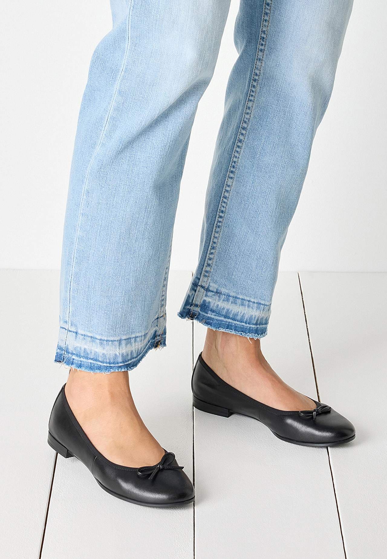 Skindballerina med lav hæl. Lille sløjfedetalje på toppen. Blød, let quiltet, komfortabel indersål. Touch-It:. Overside i læder. For i tekstil. Indersål i læder. Ydersål i kunststof. Touch-It-funktionen gør, at den bløde fodseng konstant reagerer på kroppens egen vægt og følger fodens form.