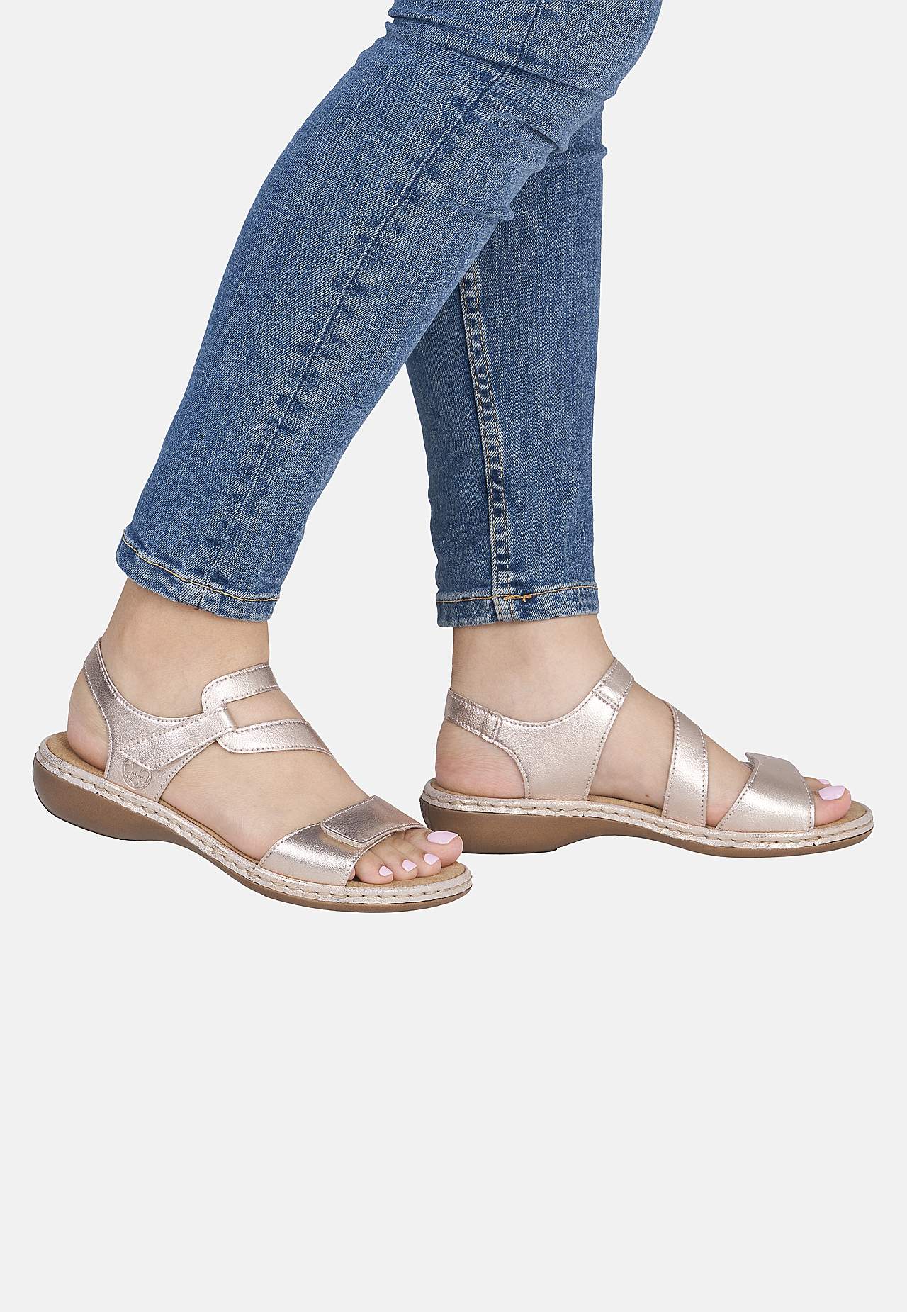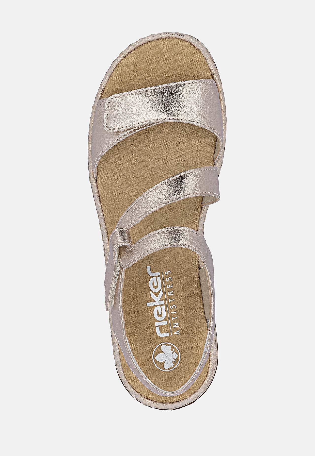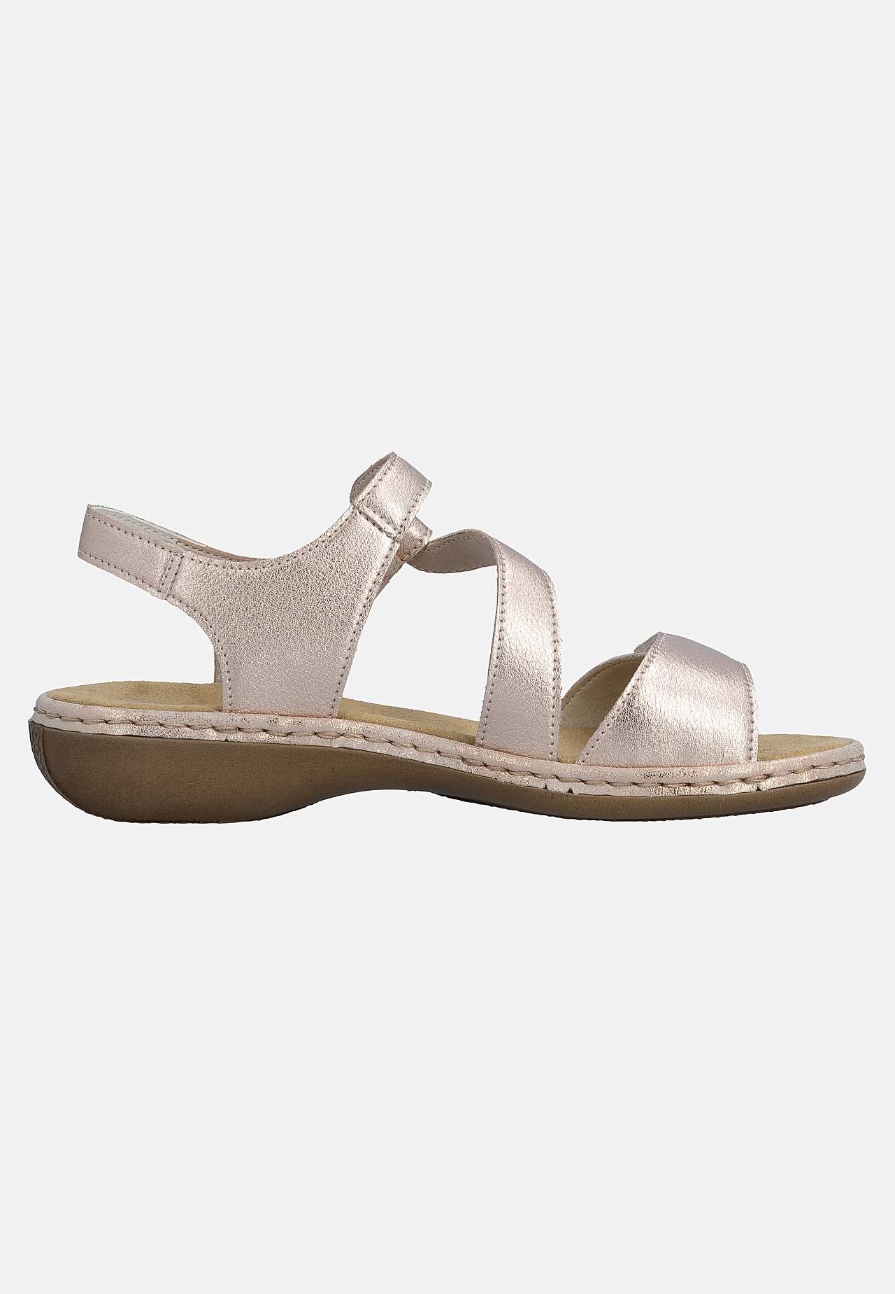 Stilfulde remme med elegant design. Skjult, justerbar velcrolukning ved håndleddet og foran. Blød, komfortabel indersål. Fast ydersål. Antistress: Se nedenfor. Overside i læder. For i kunststof. Indersål i tekstil. Ydersål i kunststof. Antistress