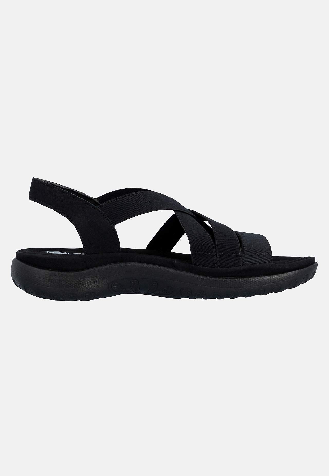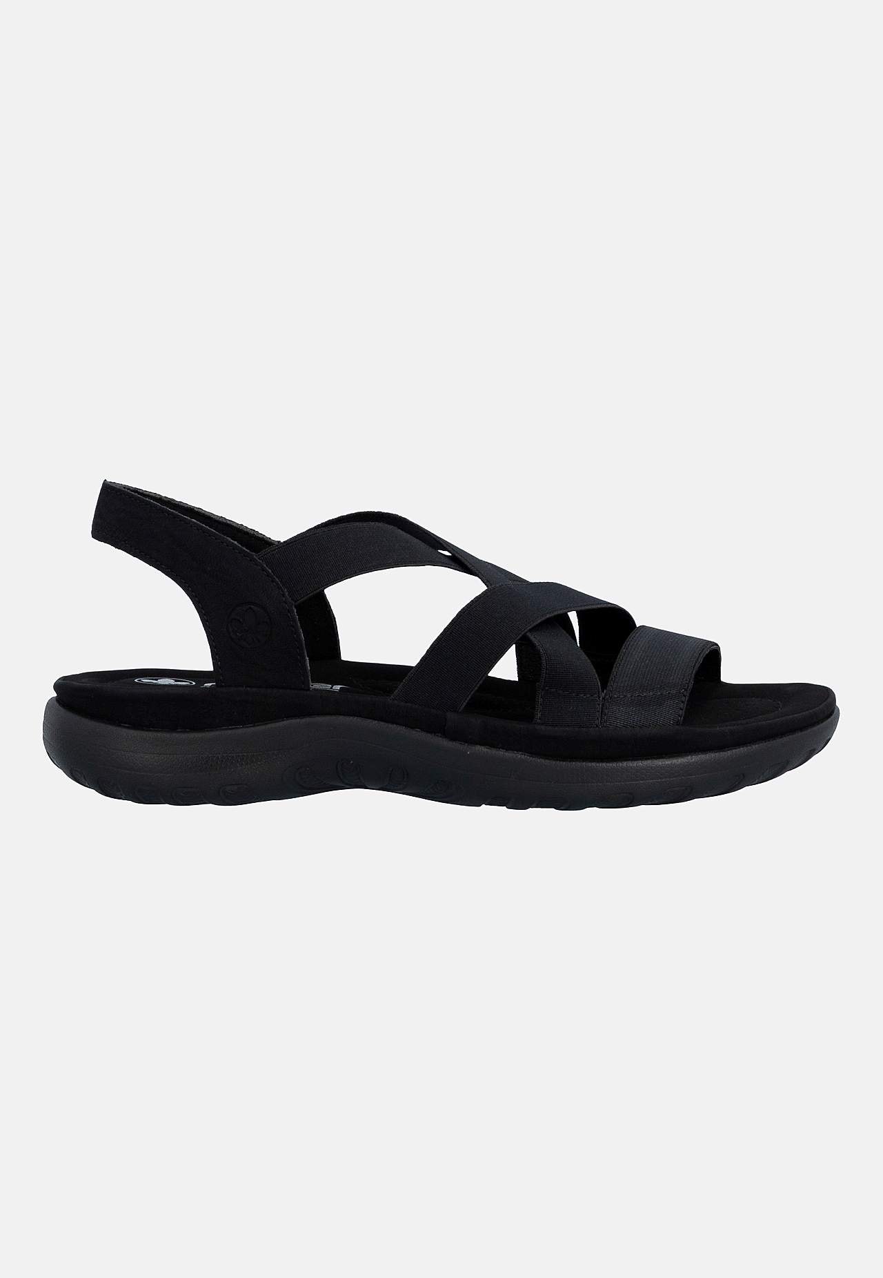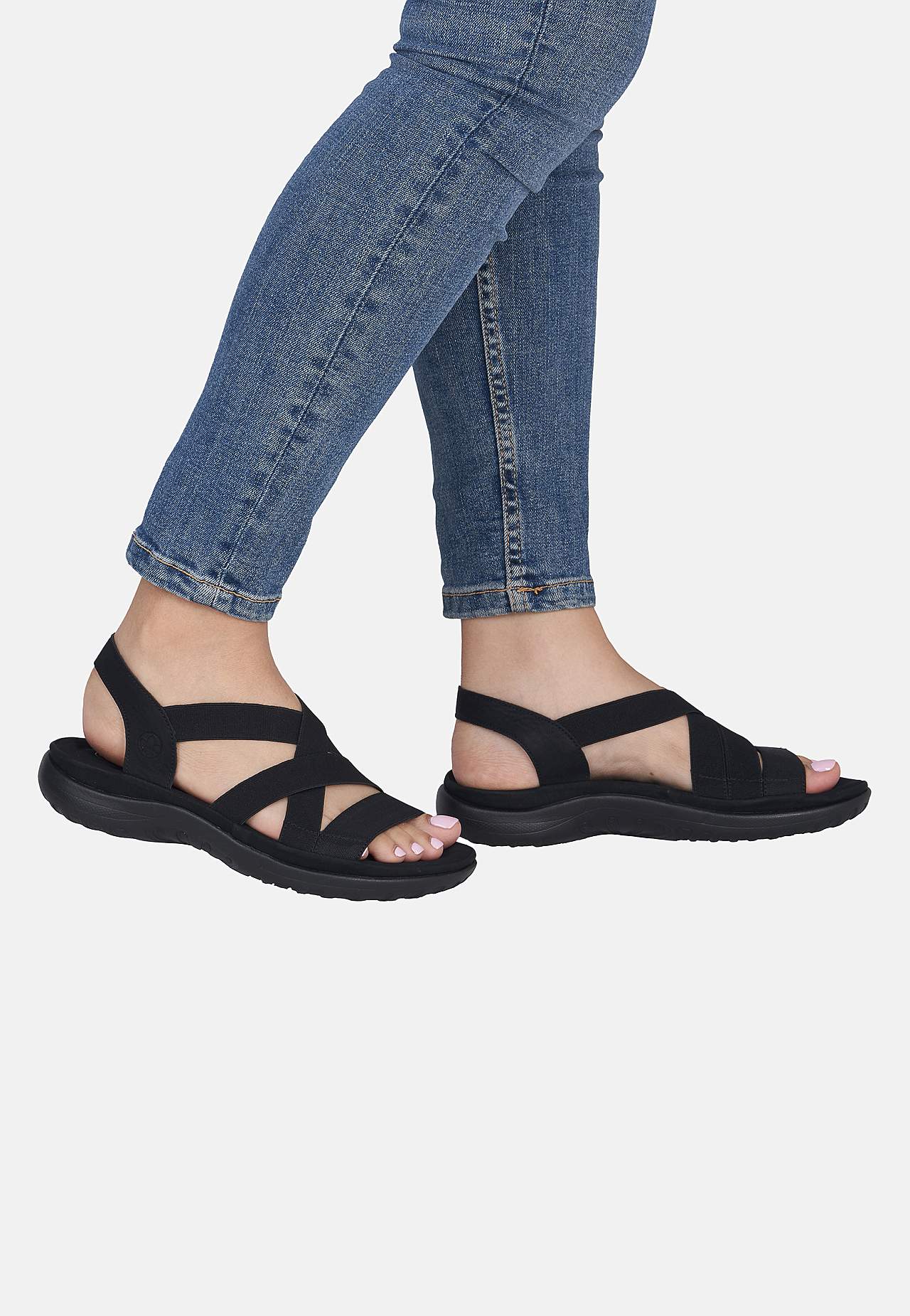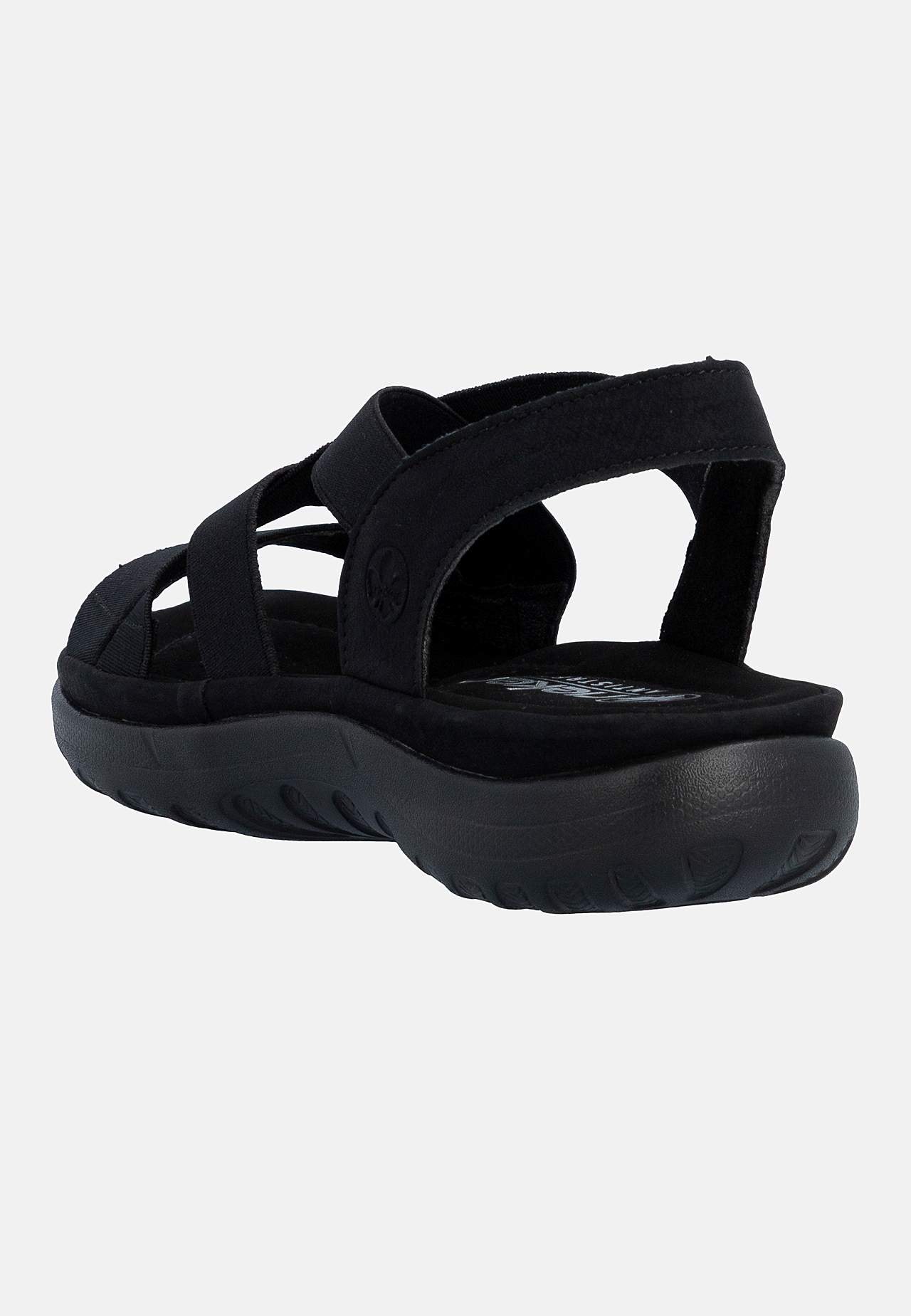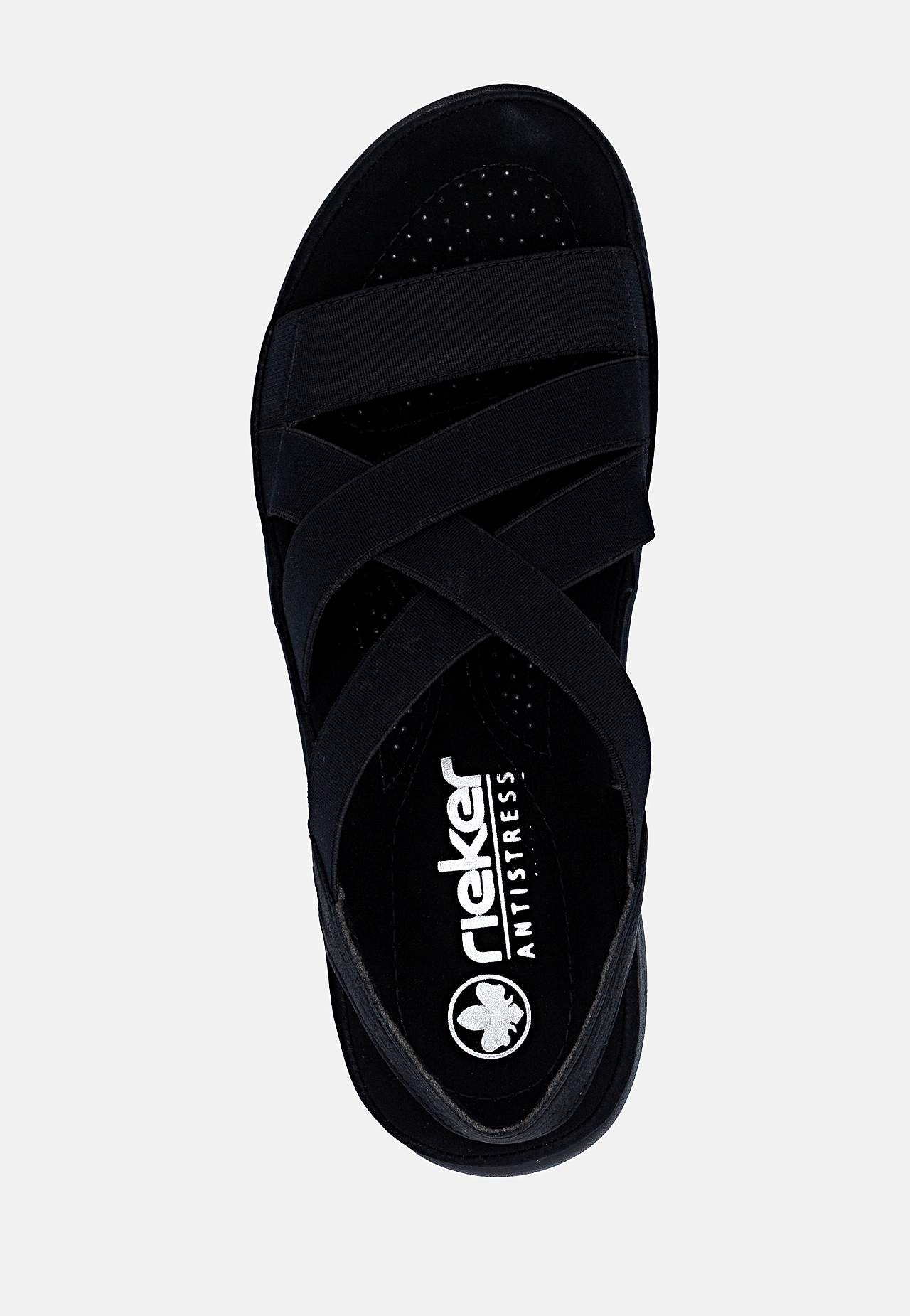 Remsandal med tre krydsmønstrede, elastiske remme over foden. Fast hælrem med blød inderside. Superblød, stødabsorberende indersål. Let ydersål med godt greb. Rieker Antistress: Se nedenfor. Overside i kunststof. For i kunststof. Indersål i kunststof. Ydersål i kunststof. Antistress