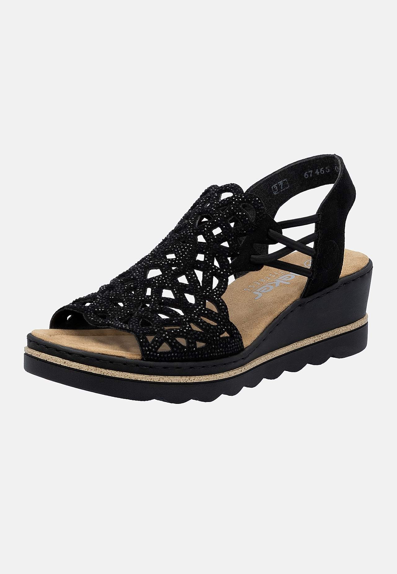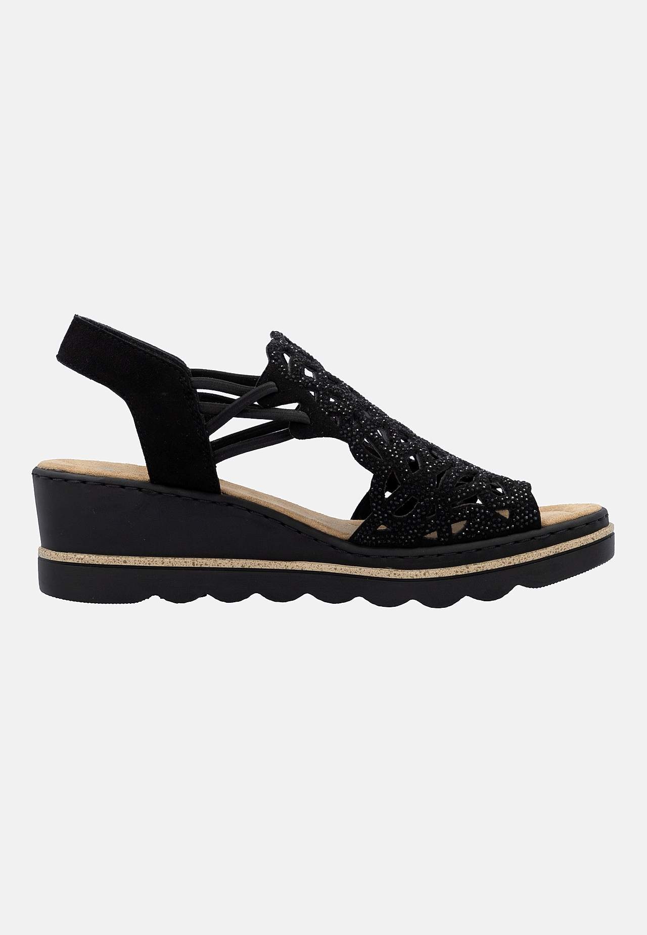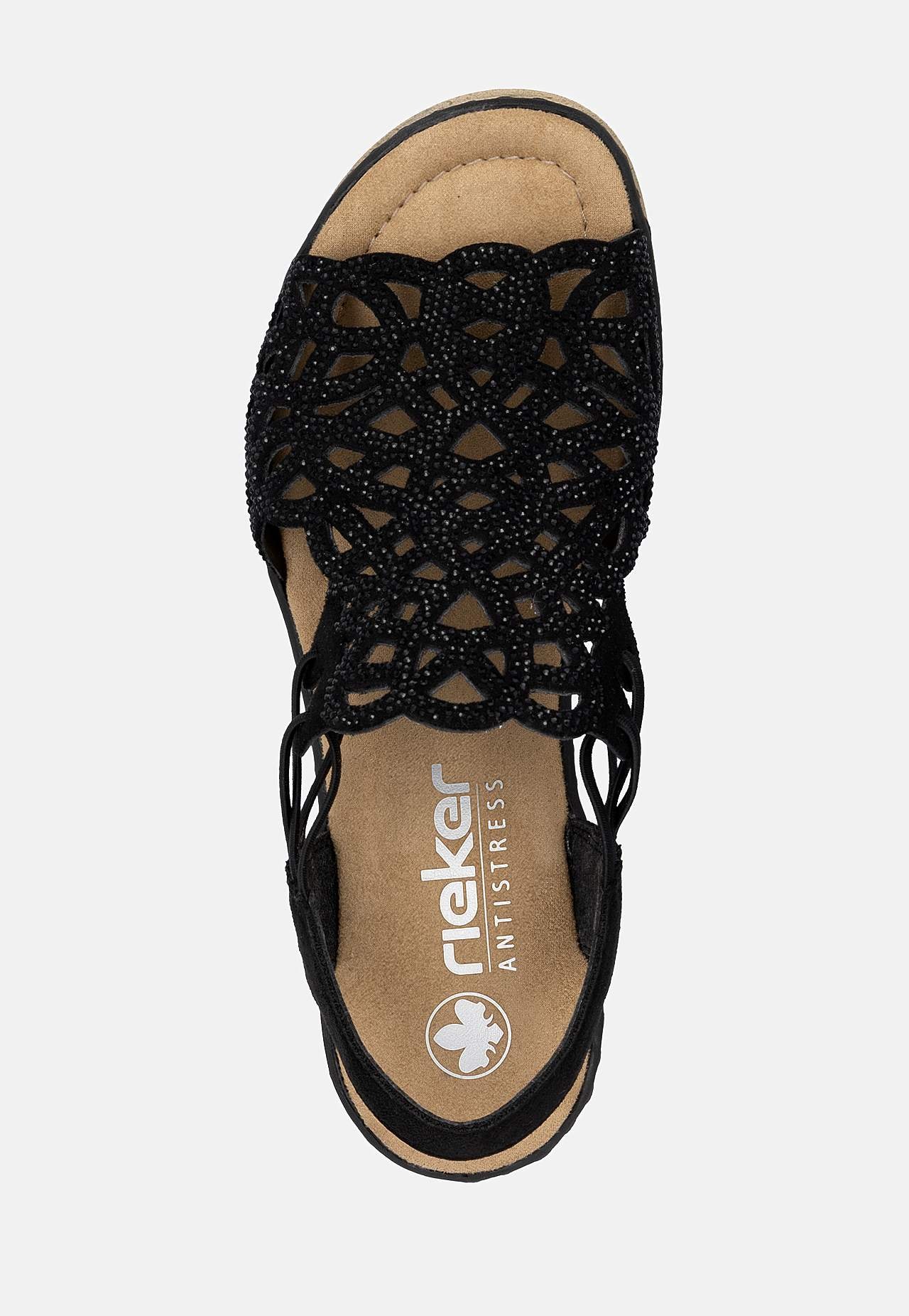 Sandal med hæl med smukke rhinstensdetaljer. Tynde, elastiske bånd som gør den ekstra let at tage af og på. Rundet tå. Logodetalje på ydersiden. Bekvem indersål. Behandlet ydersål med godt greb. Passer lige så vel til daglig brug og til festlige lejligheder. Rieker Antistress: Se nedenfor. Overside i tekstil. For i kunststo... Læs mere