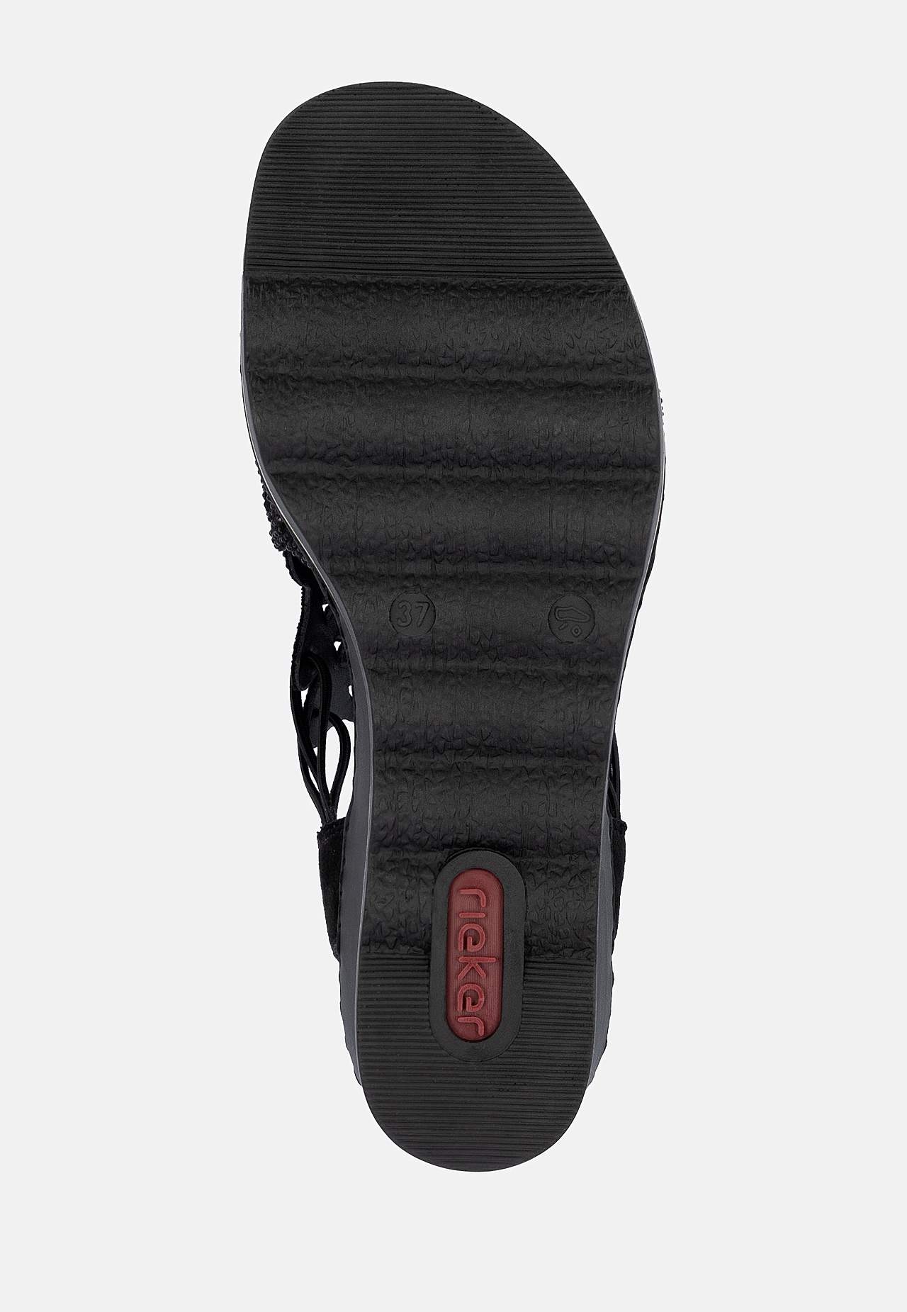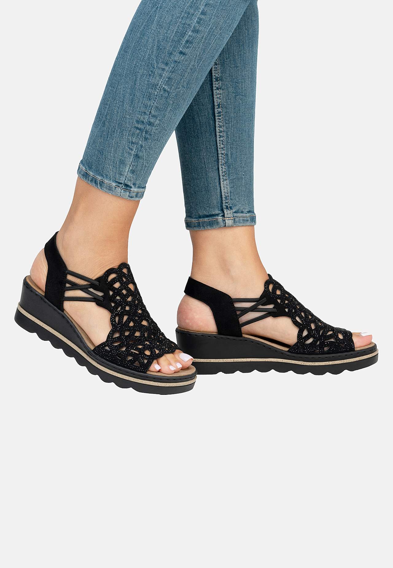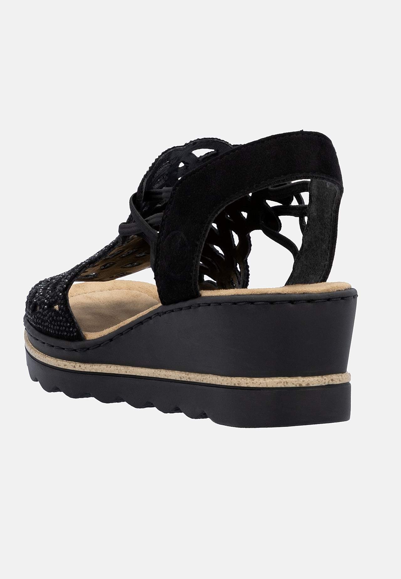 Sandal med hæl med smukke rhinstensdetaljer. Tynde, elastiske bånd som gør den ekstra let at tage af og på. Rundet tå. Logodetalje på ydersiden. Bekvem indersål. Behandlet ydersål med godt greb. Passer lige så vel til daglig brug og til festlige lejligheder. Rieker Antistress: Se nedenfor. Overside i tekstil. For i kunststo... Læs mere