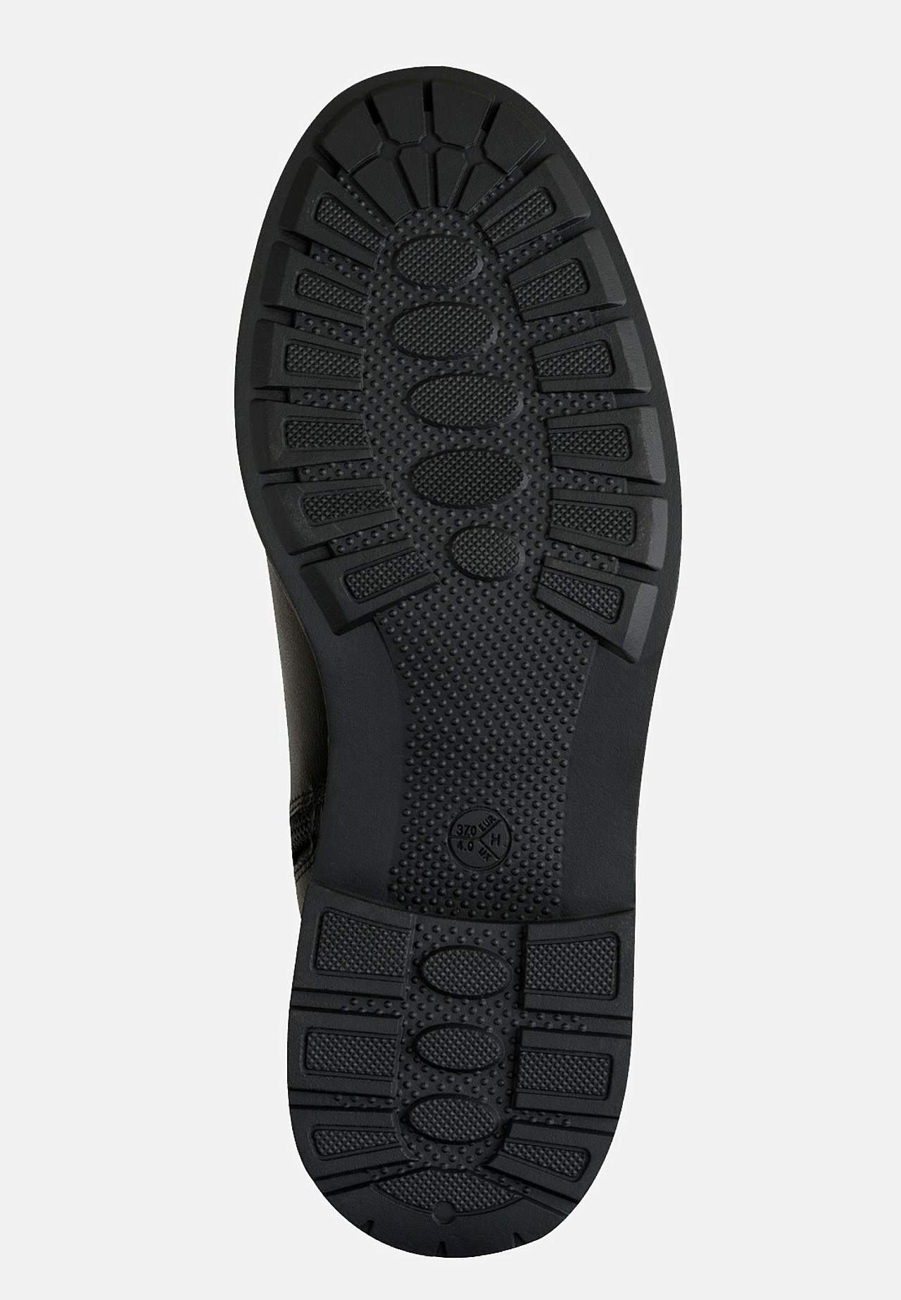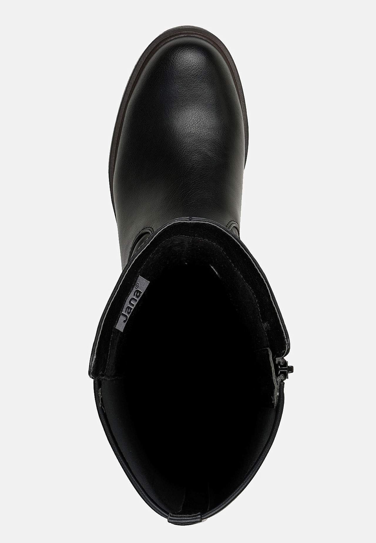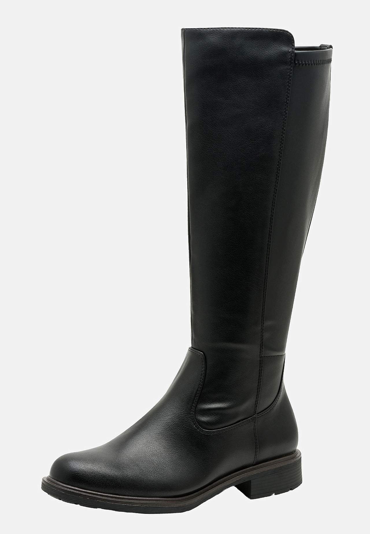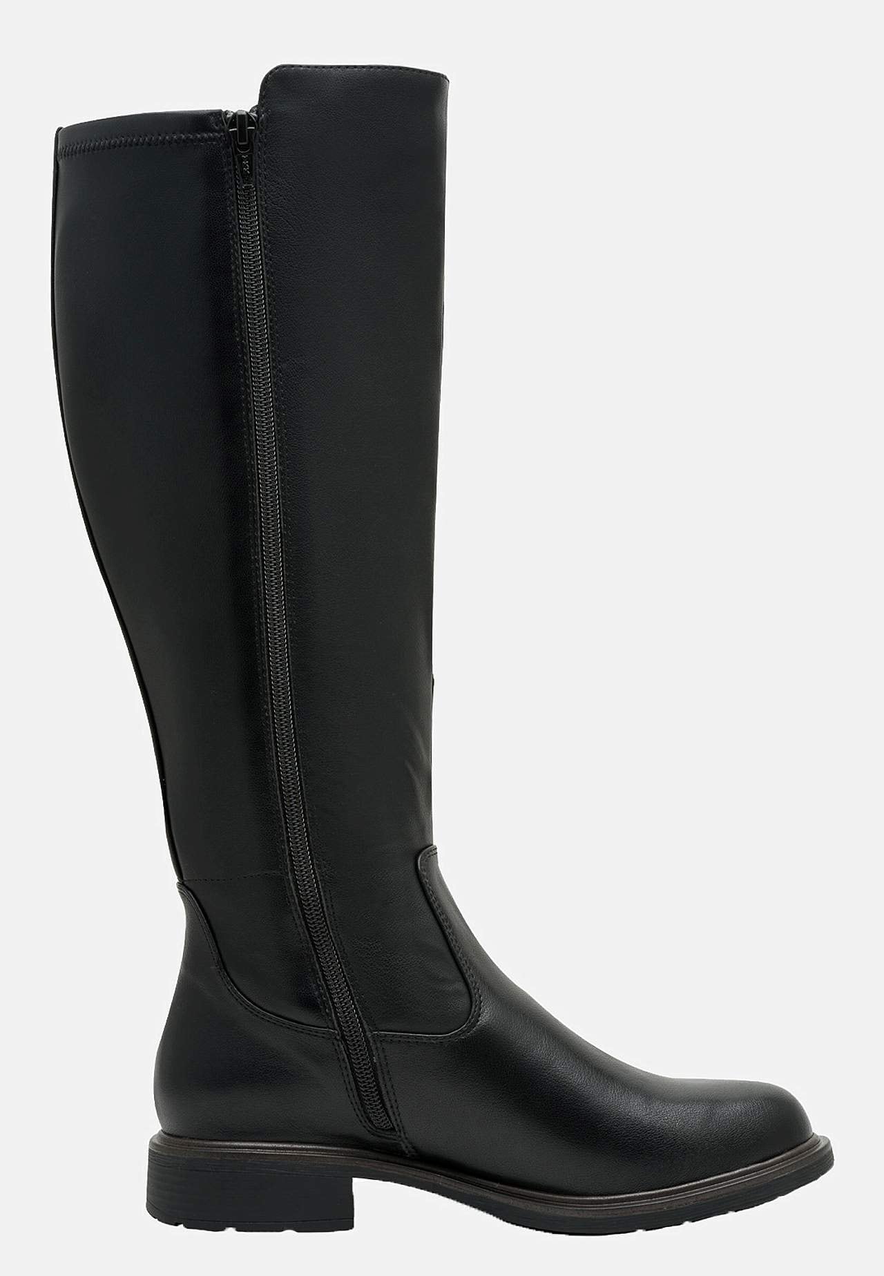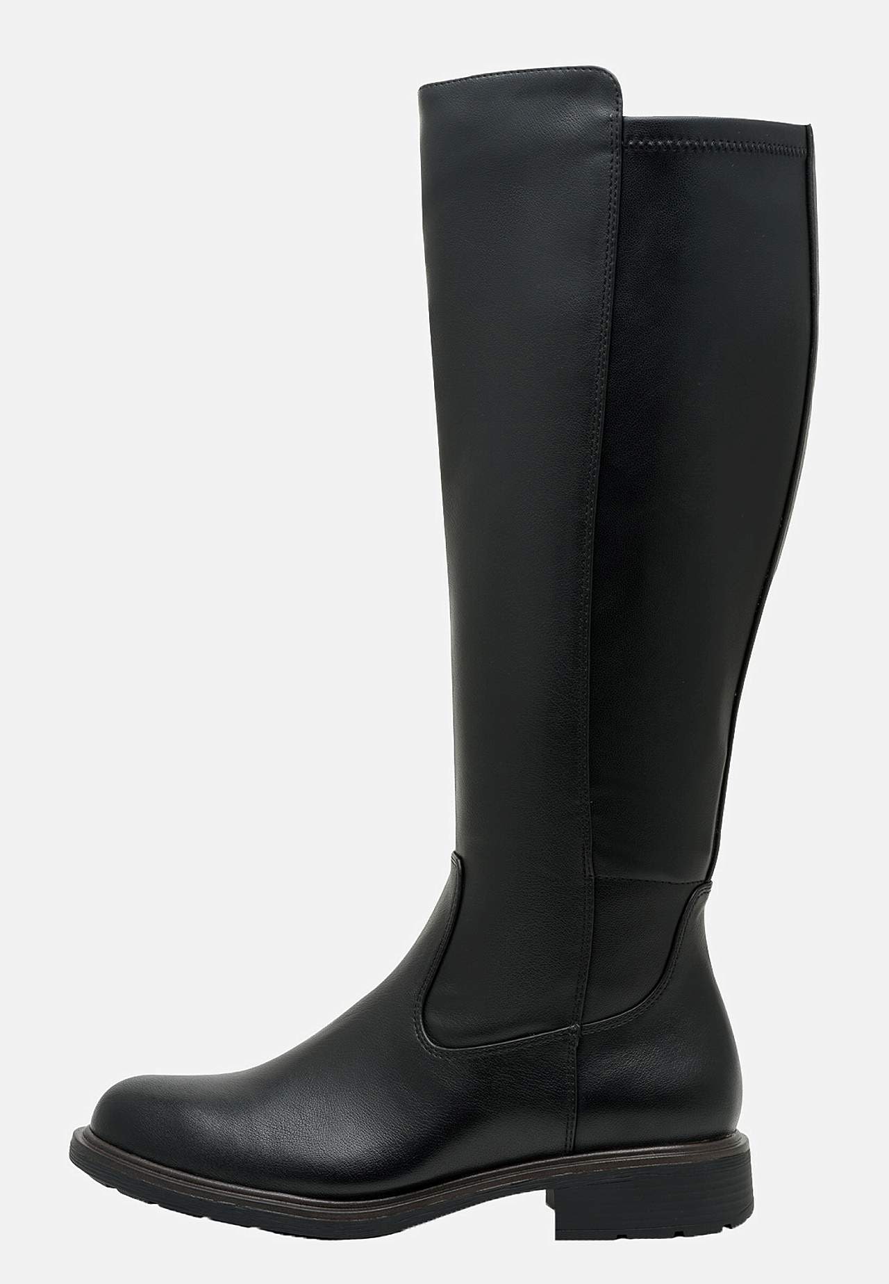 Høj støvle i læderimitation. Elastisk skaft bagpå for bedste pasform og komfort. Lynlås på indersiden let at tage af og på. Fjøjlsagtigt, tyndere for. Blød indersål. Grov ydersål. Overside i kunststof. For i tekstil og kunststof. Indersål i tekstil. Ydersål i kunststof.