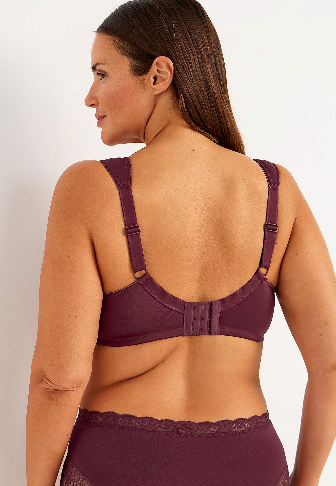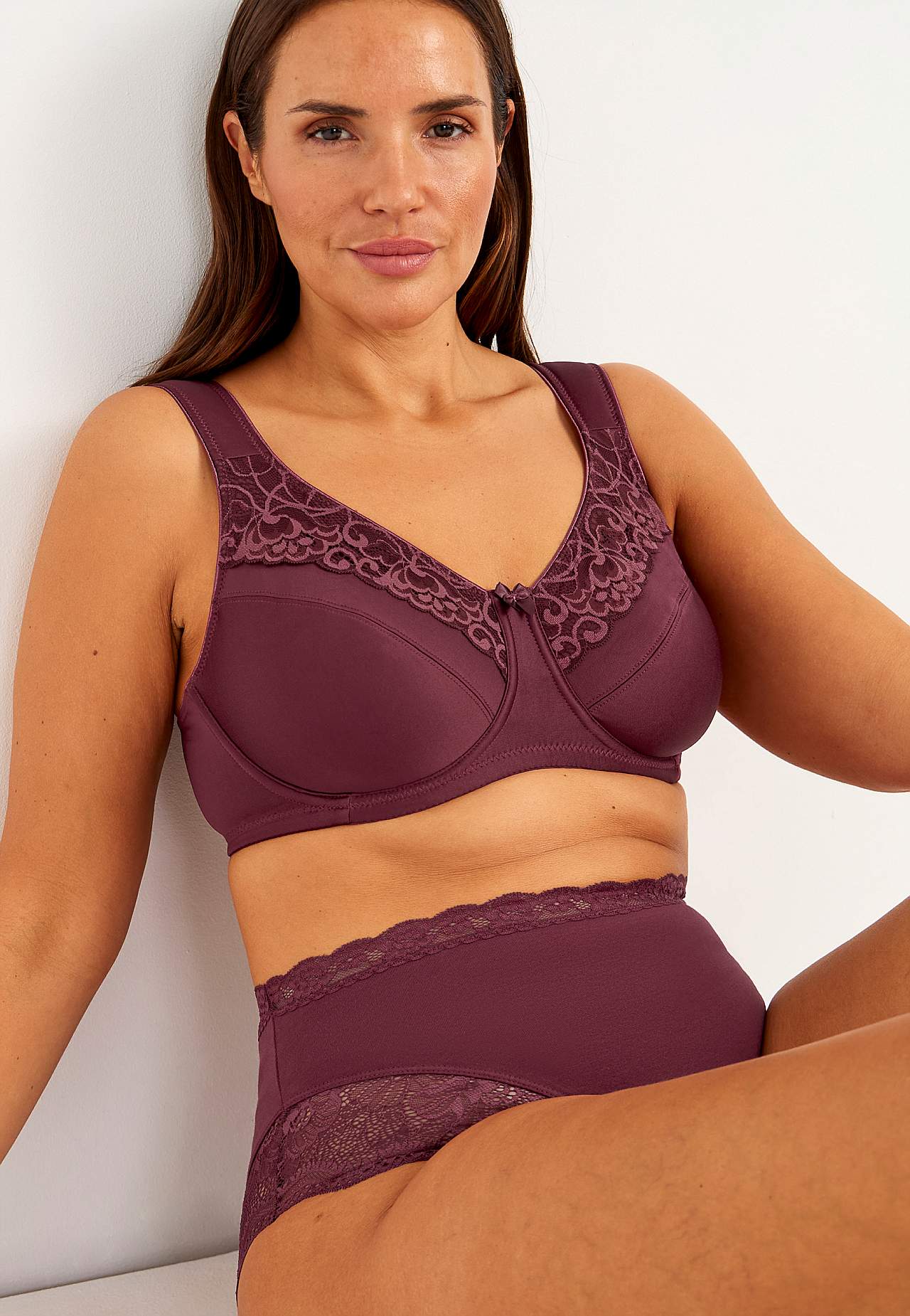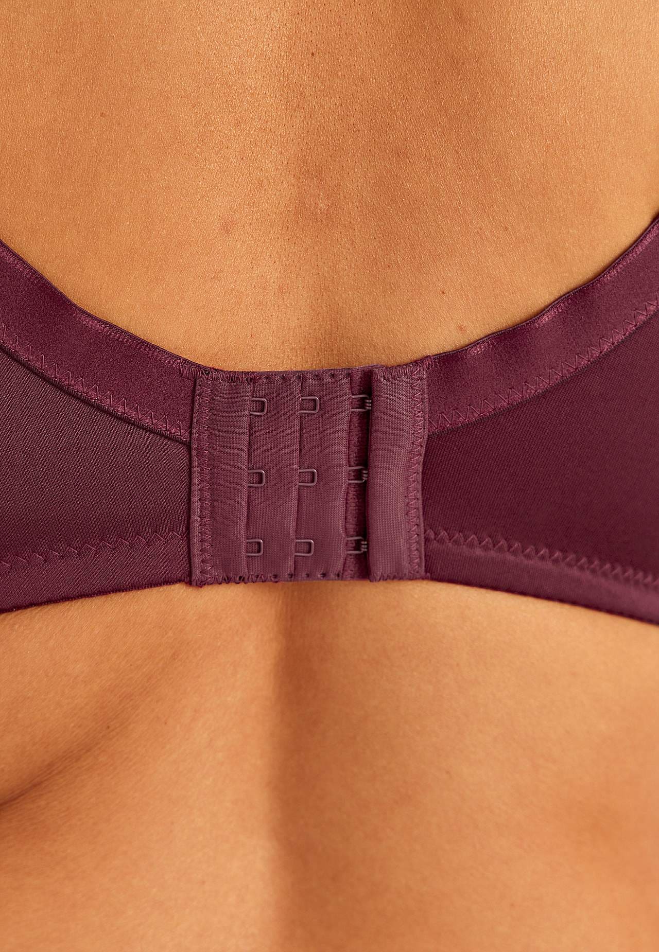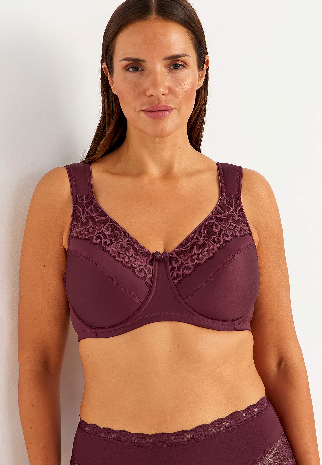 Uforet bh med bøjler med smuk, elastisk blonde. Formsyede skåle som giver busten en god støtte. Overskål med blonde på toppen. Flade skålsømme. Brede, forede regulerbare skulderstropper. Dobbeltradet knapning bagpå, treradet knapning på de større størrelser. Diskret lille sløjfe i tone-i-tone farve.