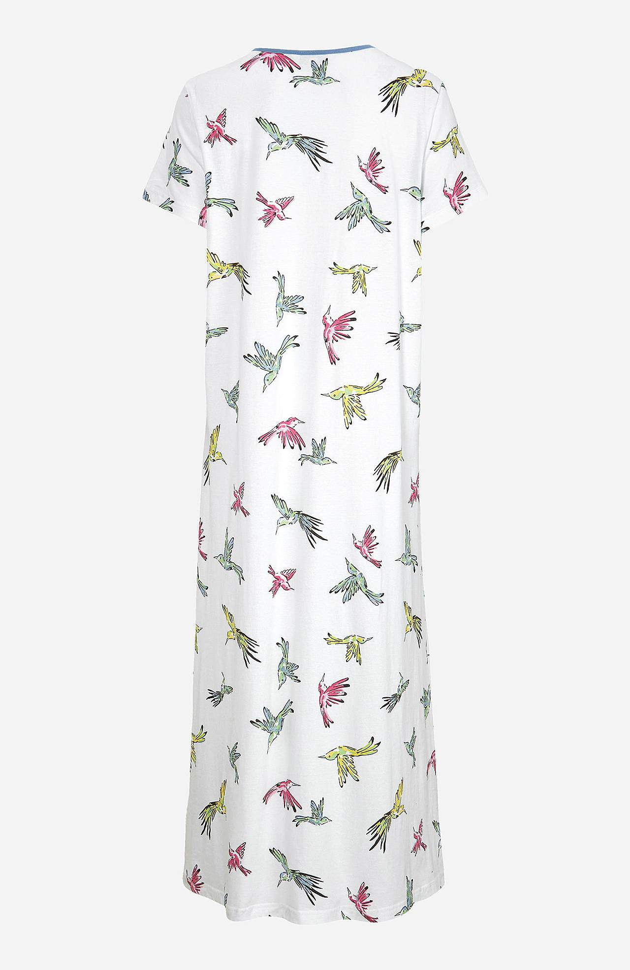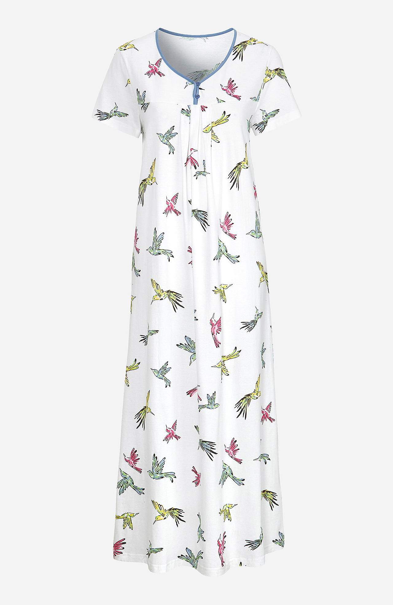 Jersey. Modgående læg og knapper midt foran. Korte ærmer. Ryglængden følger størrelsen, ca. 129-136 cm.