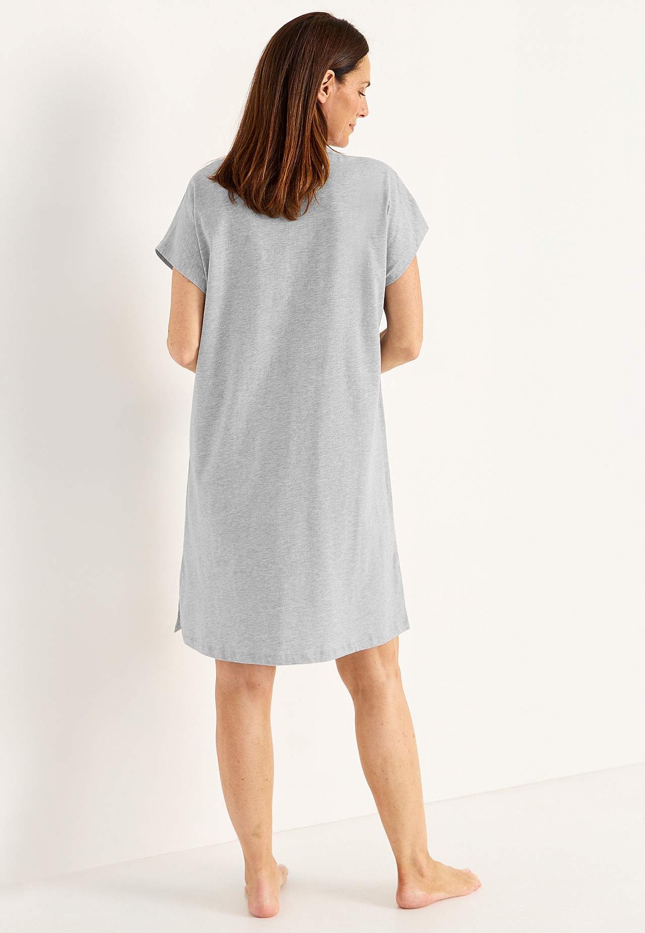 Kort natkjole i blød økologisk bomuld. Rummelig pasform. A-linje design. Rund halsudskæring. Korte vingeærmer. Lige søm med slids i siderne. Længden følger størrelsen, ca. 95-105 cm fra skulderen bagpå.