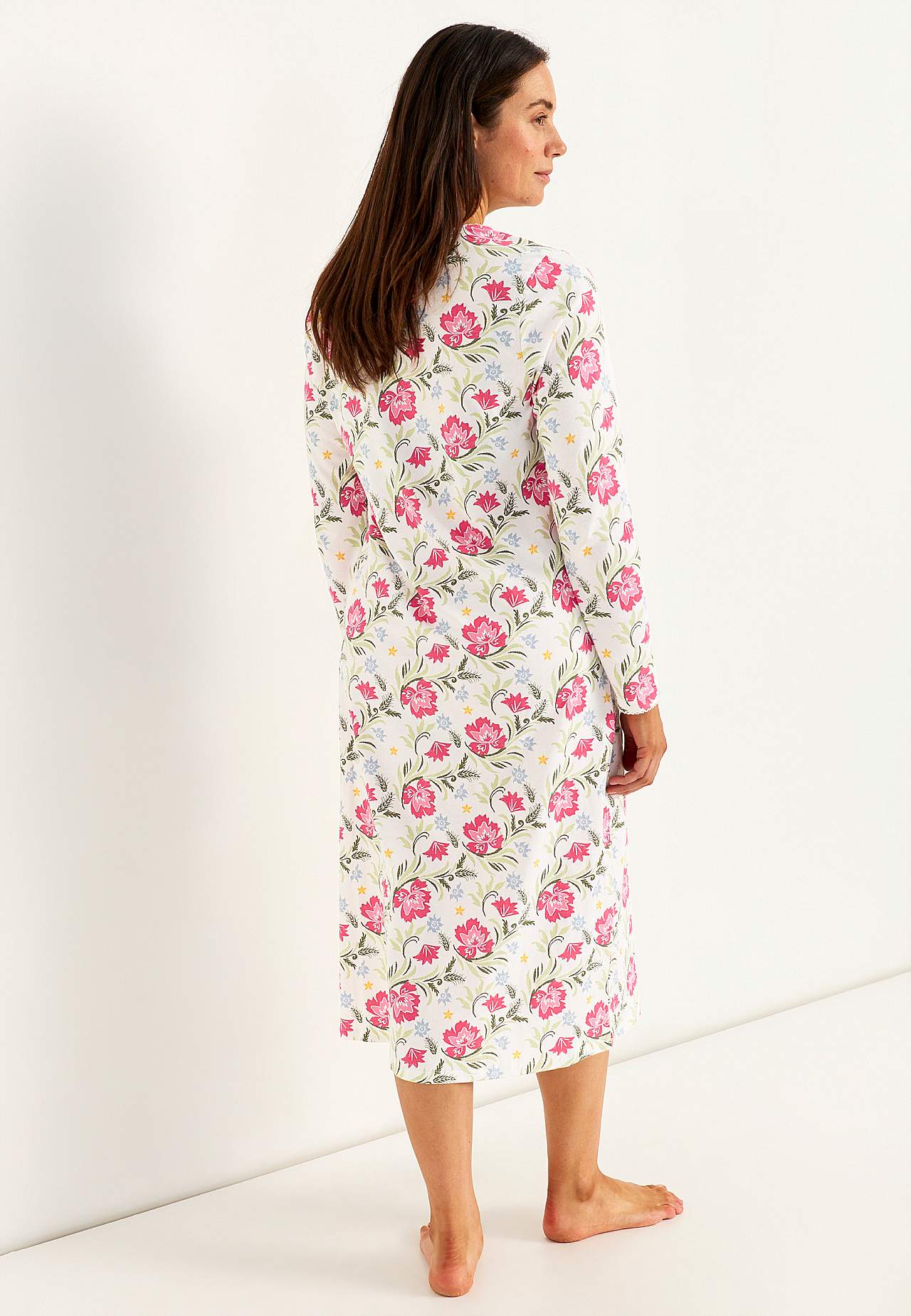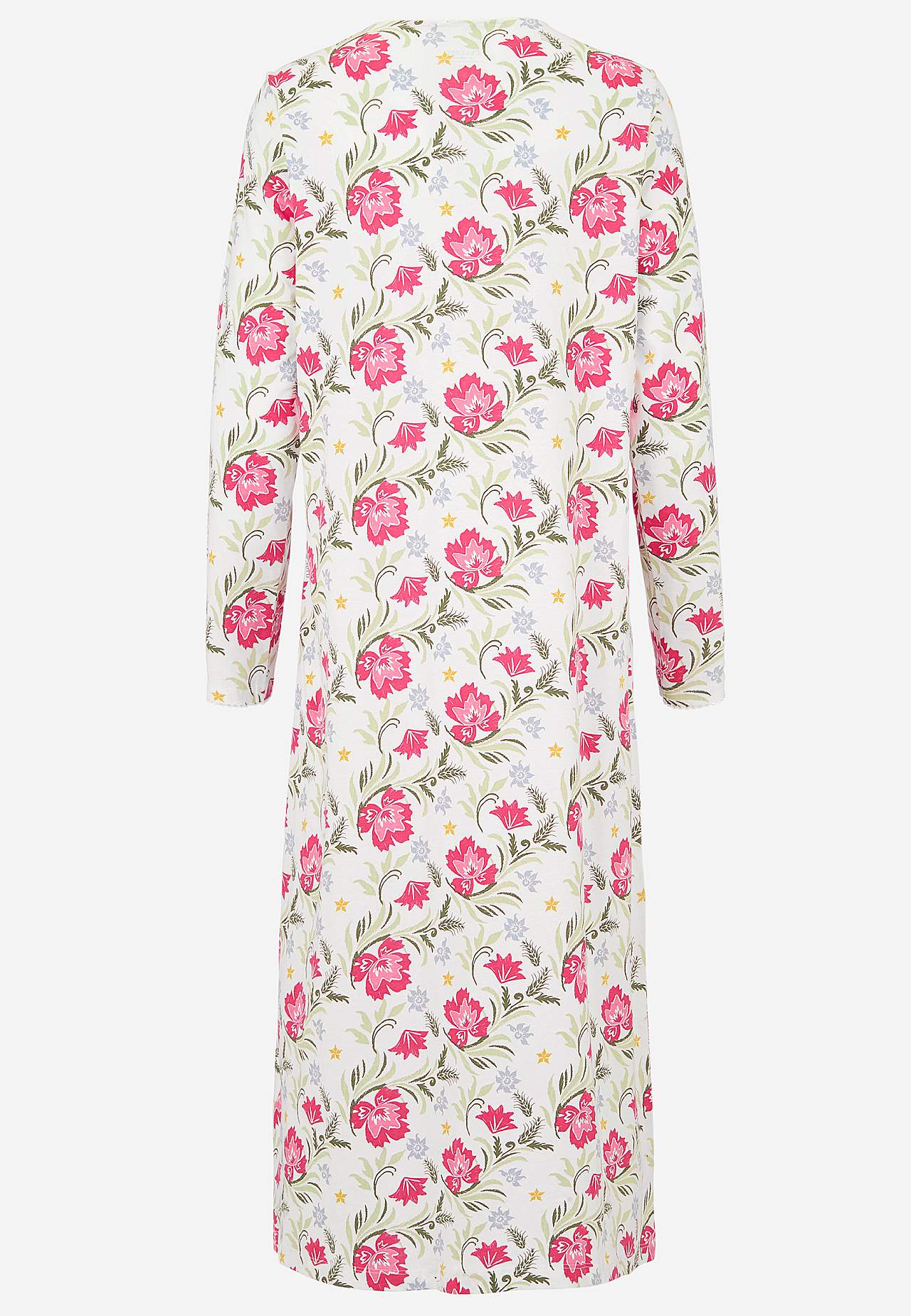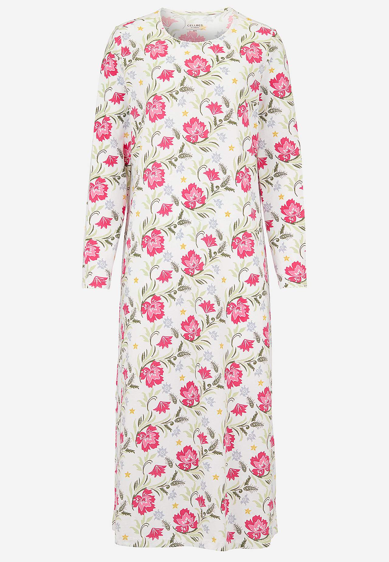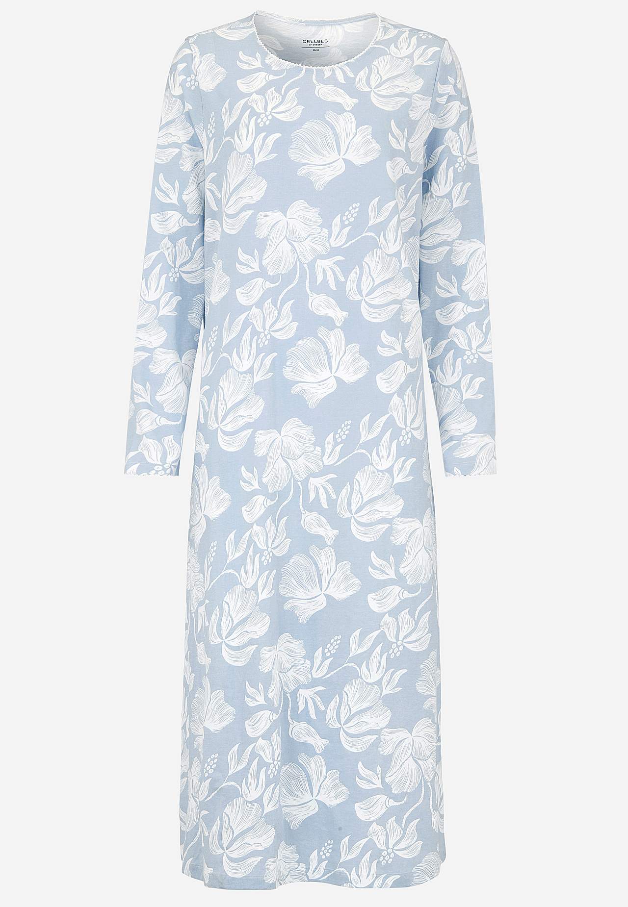 Rund halsudskæring med en dejlig blondekant. Lange ærmer med blondekant ved manchetterne. Lige søm. Længde fra skulder ca. 123 cm i alle størrelser.