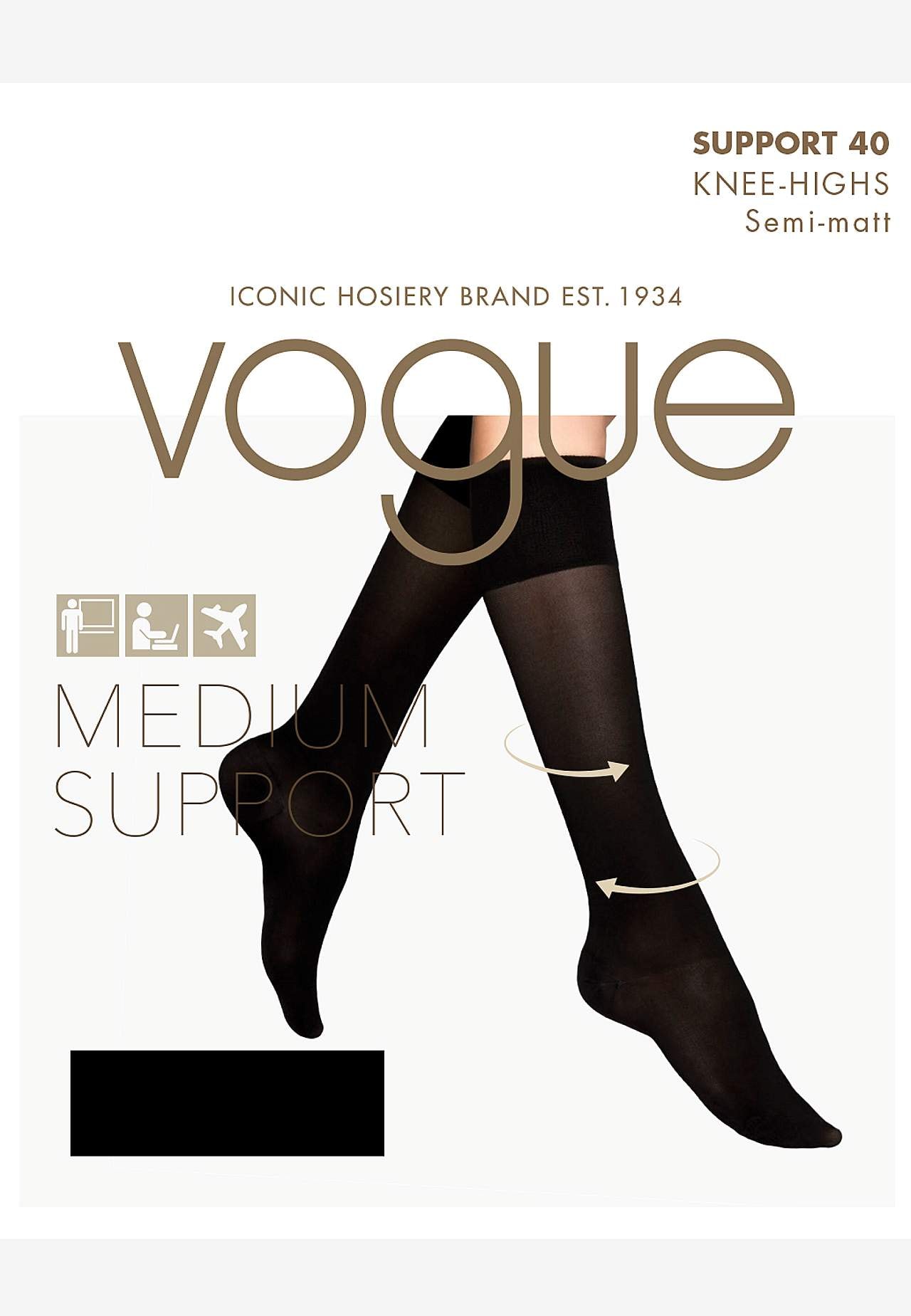 Behagelig knæstrømpe med medium støtte. Kompressionen får dine ben til at føles lettere hele dagen. Lige så komfortabel derhjemme som på rejsen. Behagelig, bred elastikkant øverst. Forstærket tå og hæl. Normal pasform. Semimat afslutning. 40 denier.